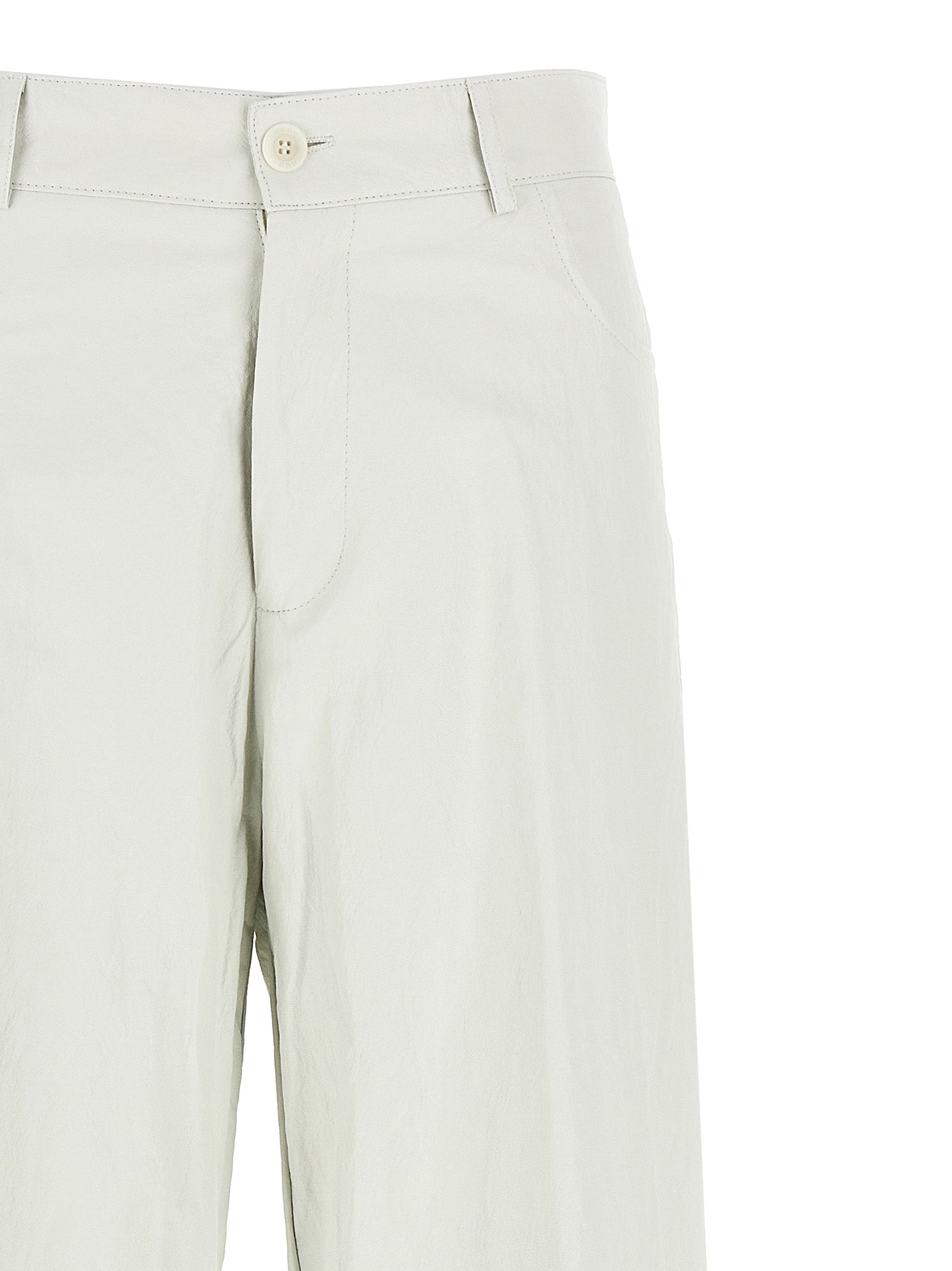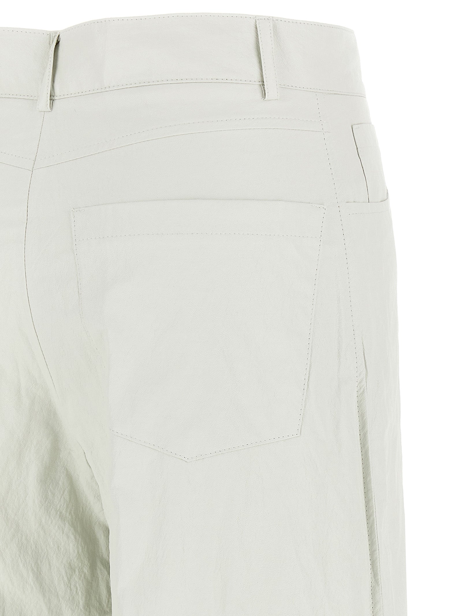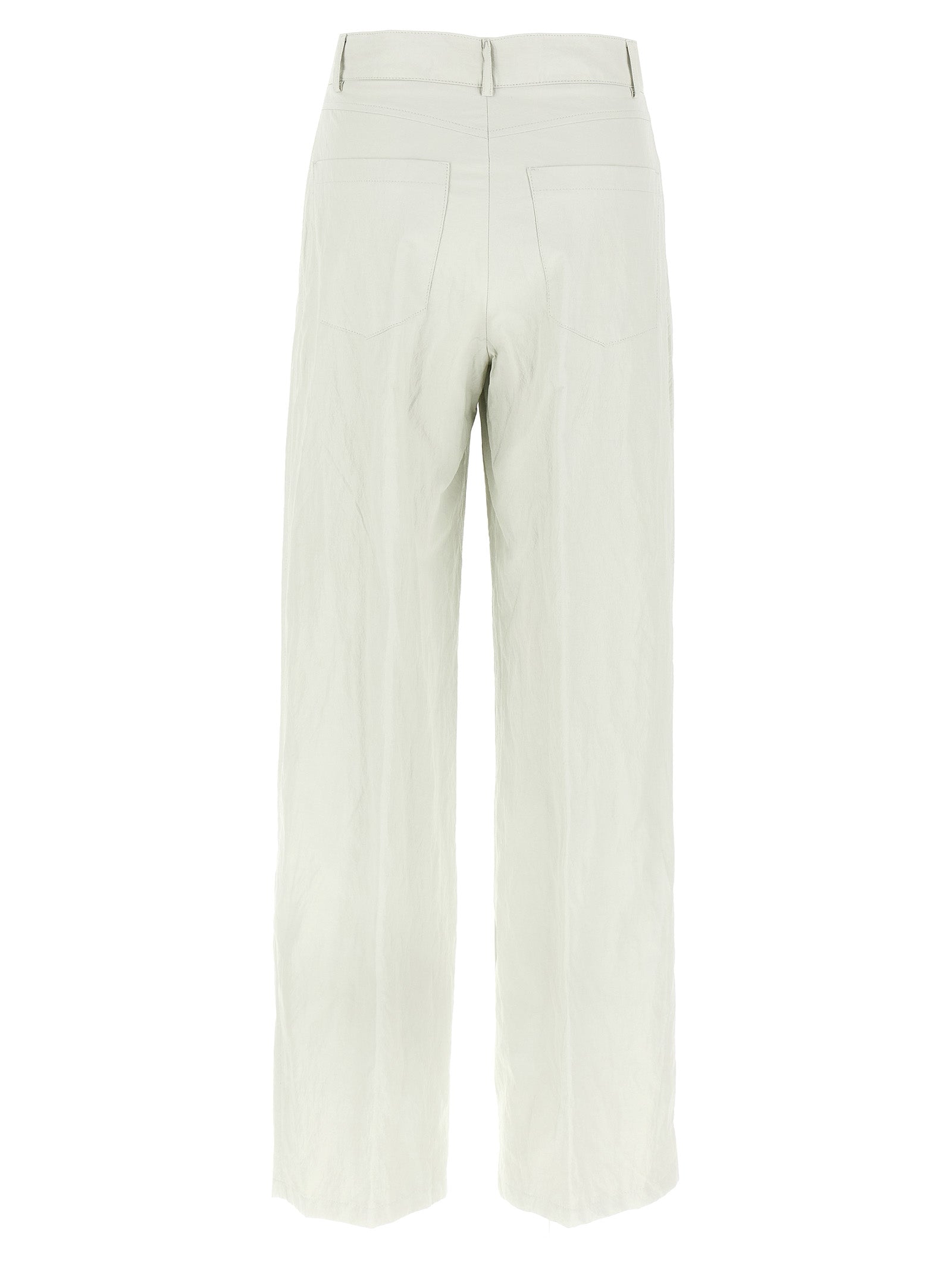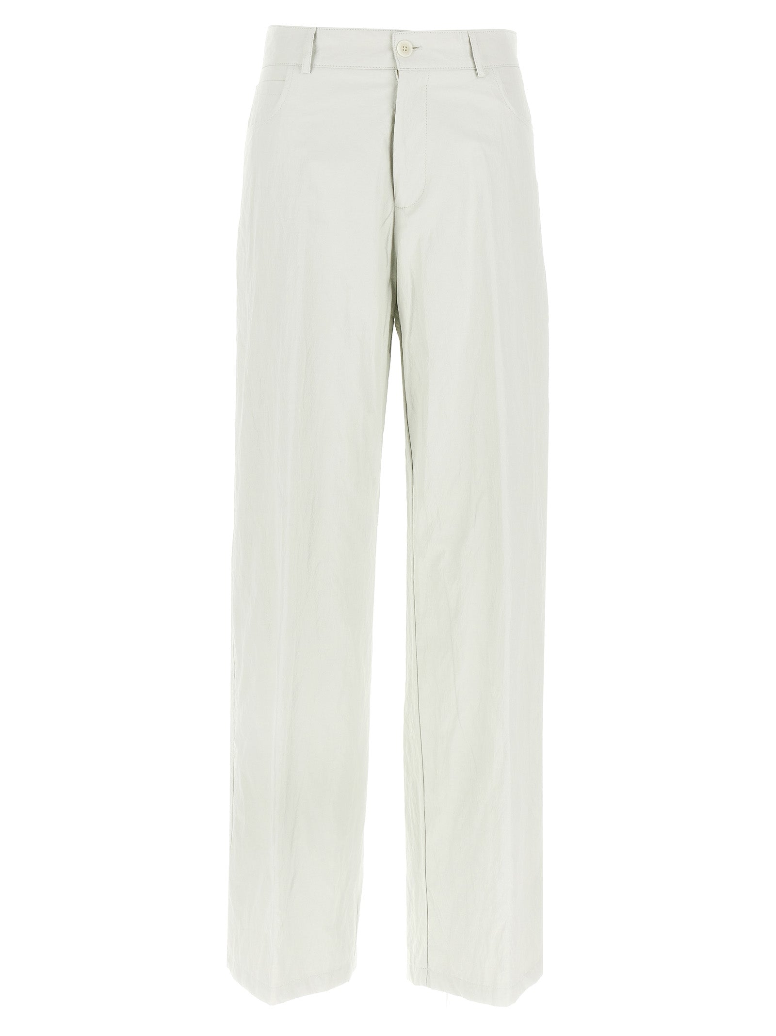 Leather-effect fabric trousers, wide and straight leg, zip and button closure, pockets.