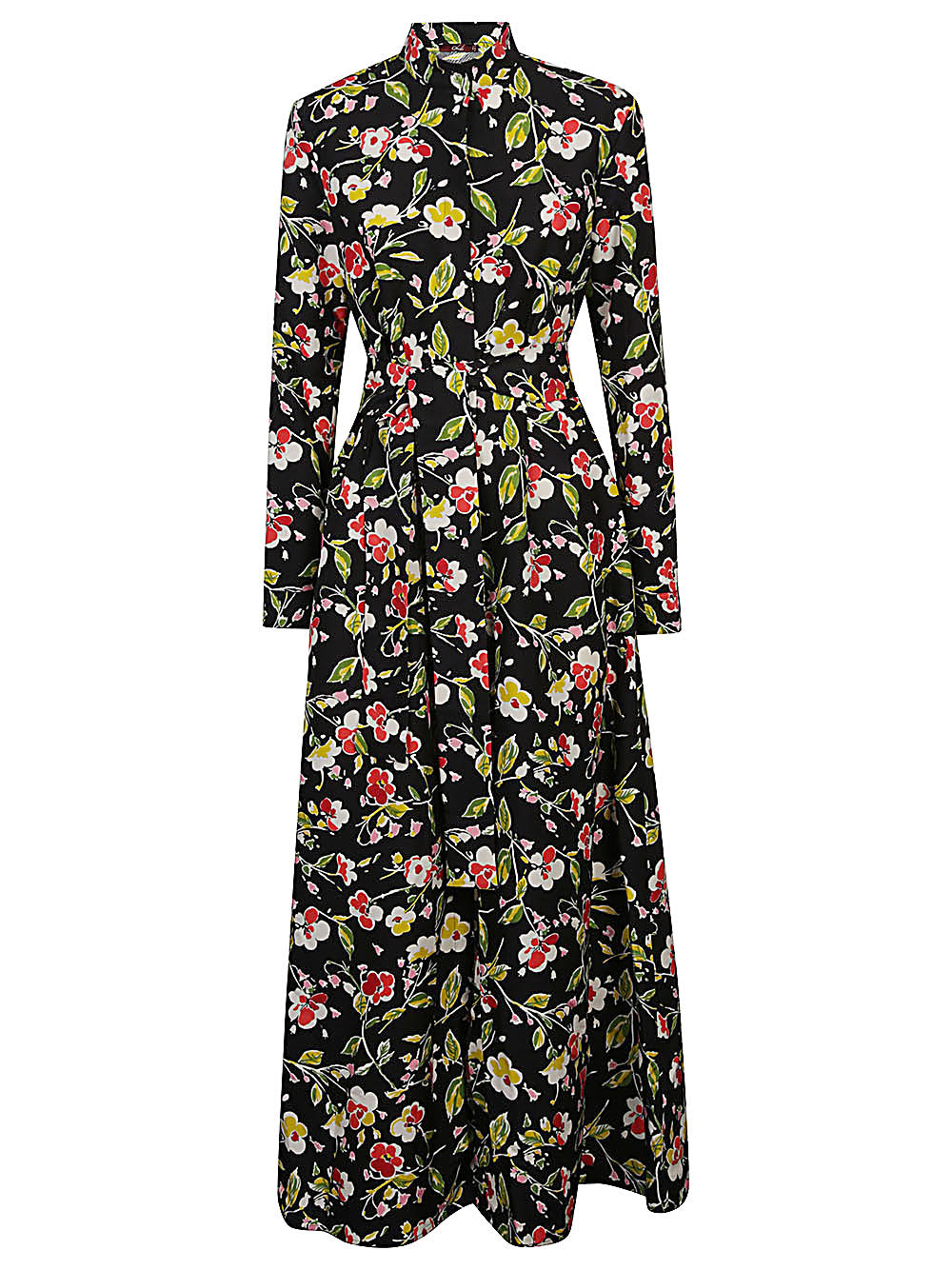 Long dress with floral graphics, front button closure, V-neck and removable waist belt.