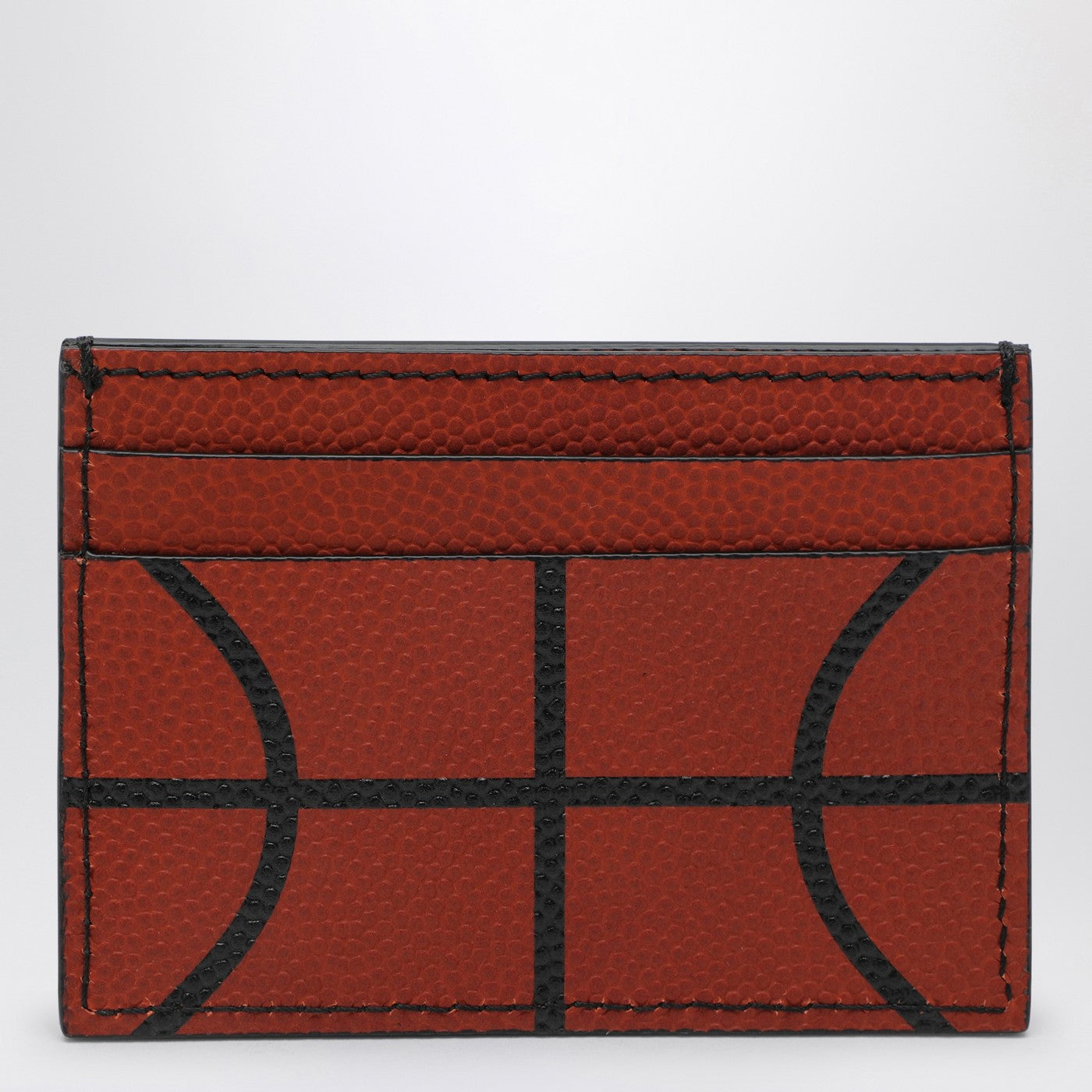 Calfskin leather card case by Off-White with textured graphics reminiscent of a basketball, featuring several card slots and contrasting lettering logo on the front.