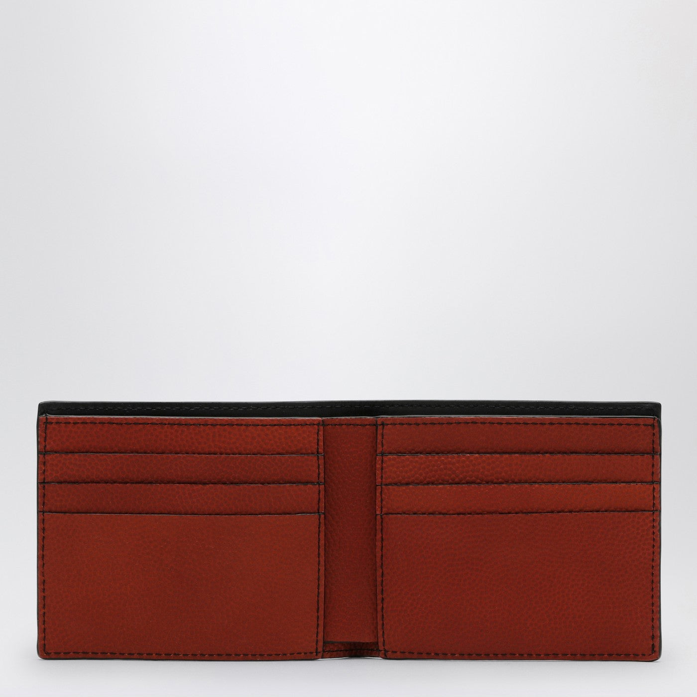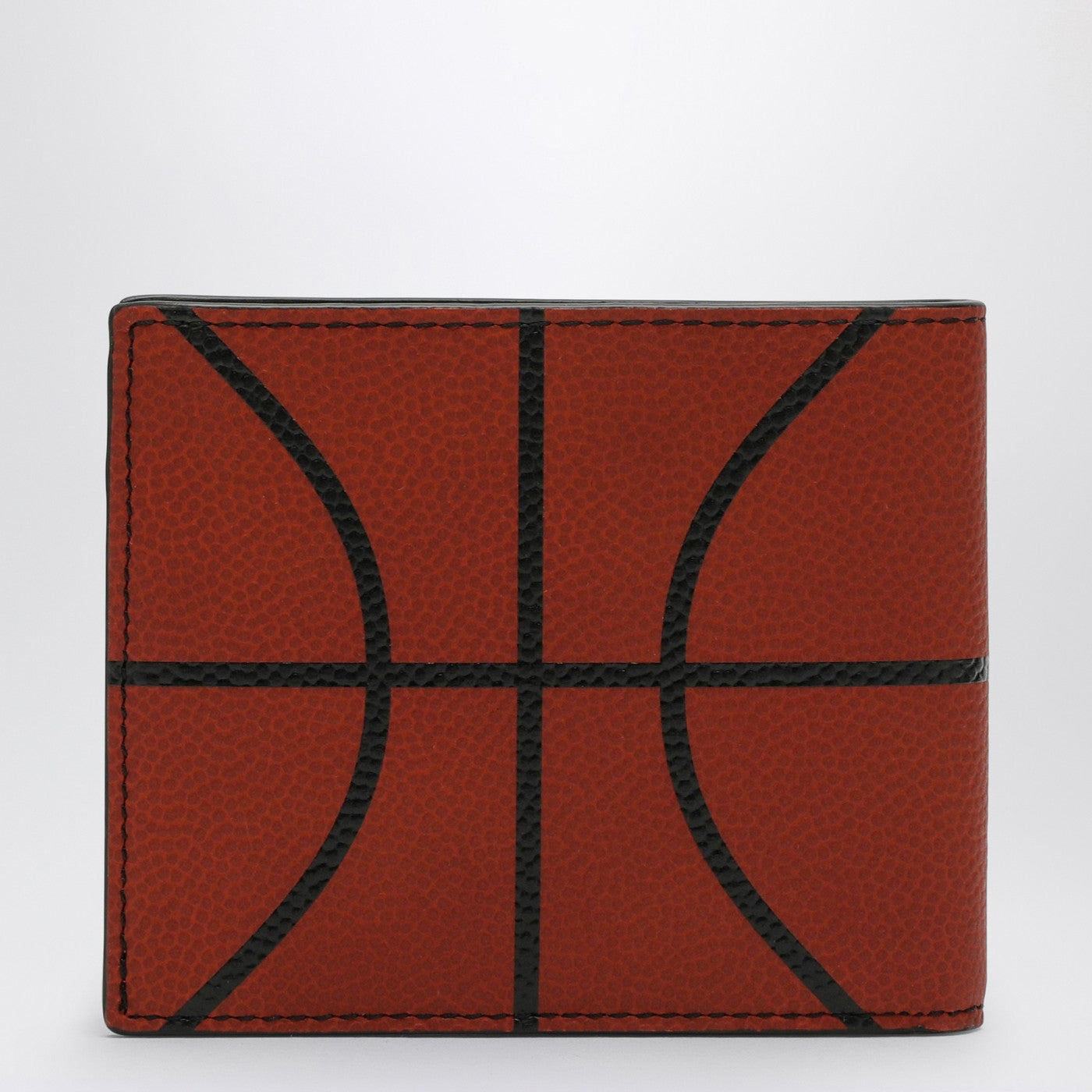 Bi-fold wallet in calfskin with textured graphics reminiscent of a basketball by Off-White, featuring several internal card slots, flat pockets and a banknote pocket.