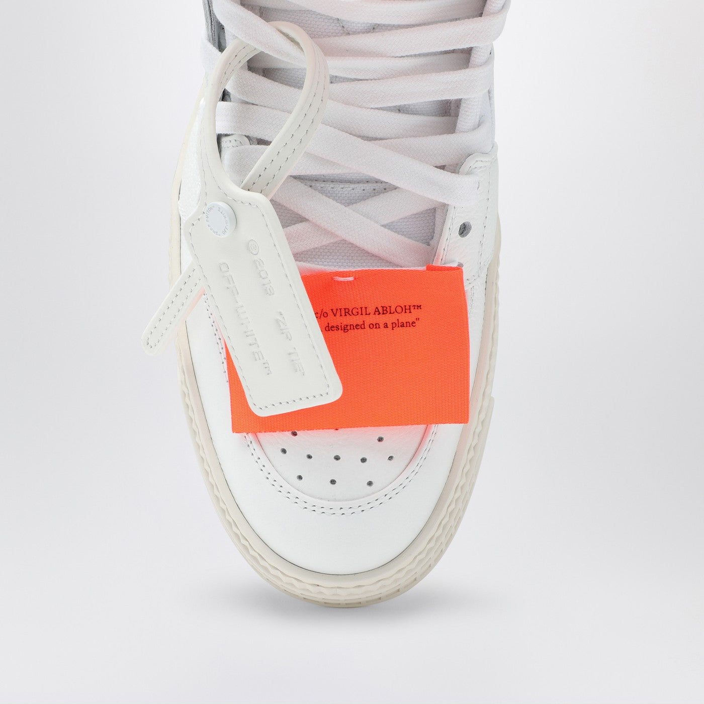 White leather and canvas high-top trainer by Off-White features a black Arrows patch on the side, a lace-up fastening, a perforated round toe, a white Safety tag appliqué, logo tags and a rubber sole.