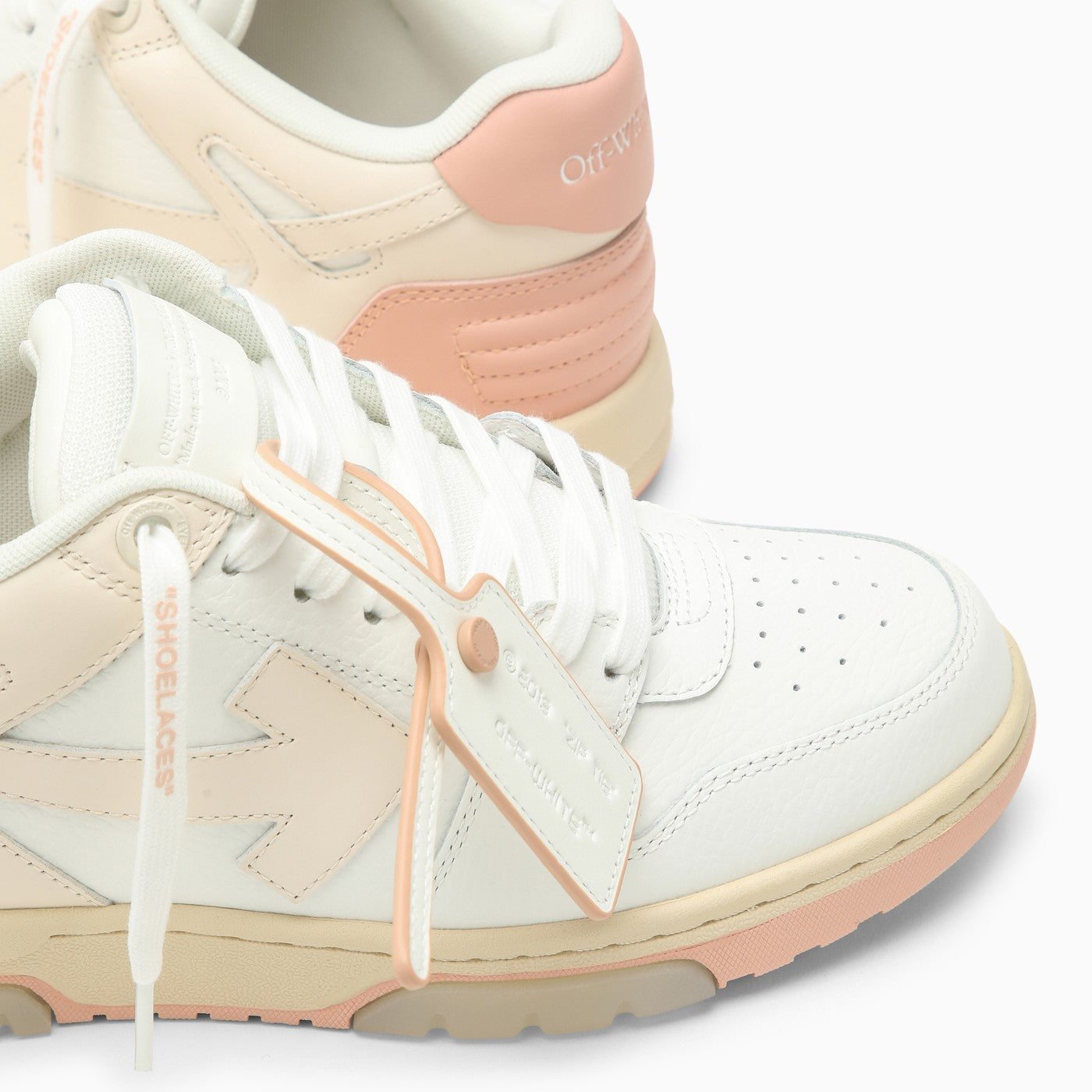 Low top trainer from Off-White featuring a white and pink leather upper, an Arrows pattern, a branded heel counter, contrasting leather detailing, a lace-up fastening, a distinctive Zip Tie logo plaque, a round toe and a flat rubber sole.