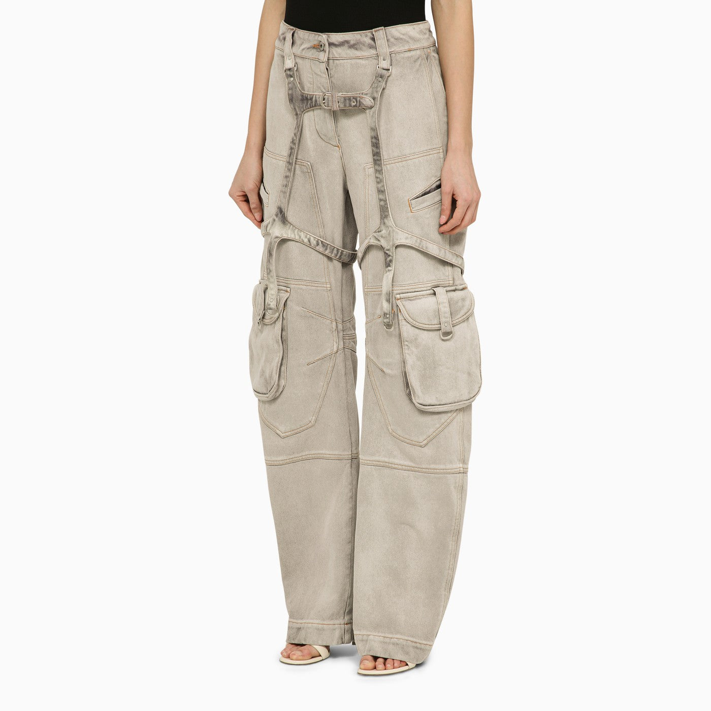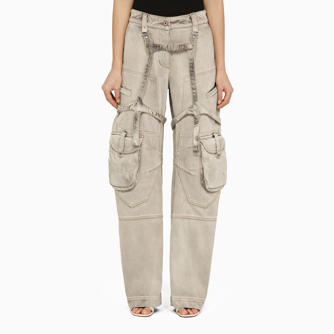 Oversized cargo jeans in burnt-coloured cotton denim by Off White, featuring a front zip and button fastening, belt loops, numerous welt and flap pockets, a back logo patch and adjustable strap details.