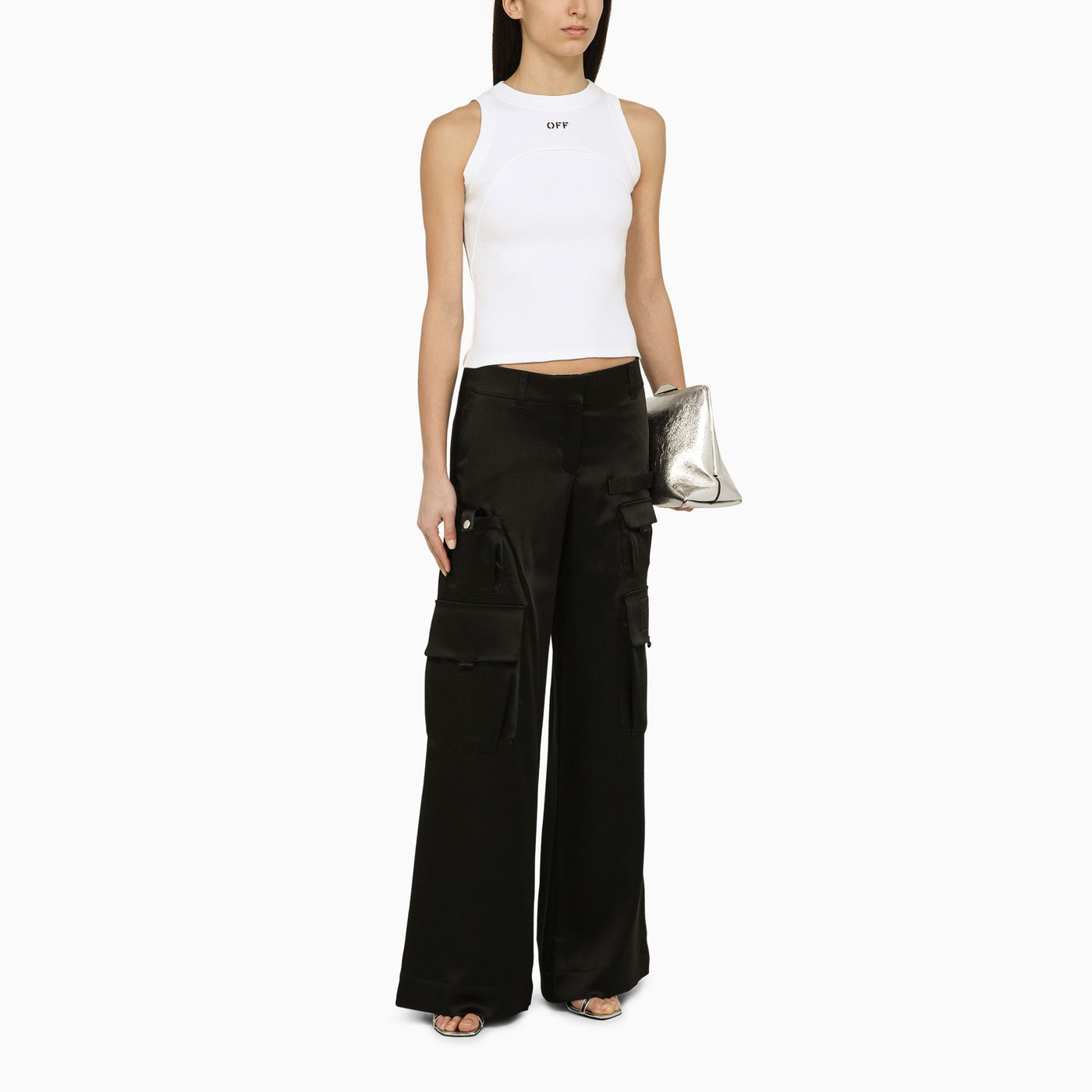 Black satin Off-White cargo trousers featuring front zip and hook-and-eye fastening, belt loops, various pockets, straps, tabs and logo patch on pocket.