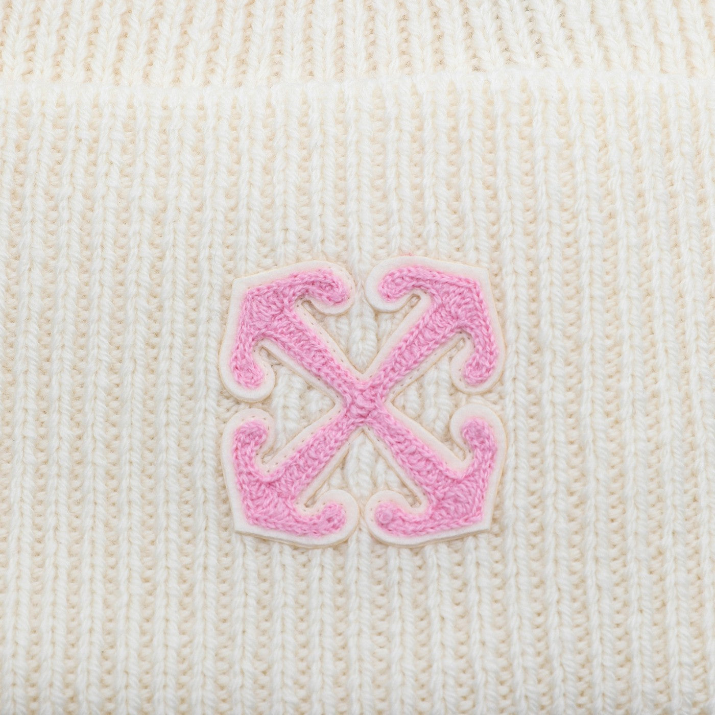 White wool cap by Off-White, featuring a ribbed design and pink logo patch lapel.