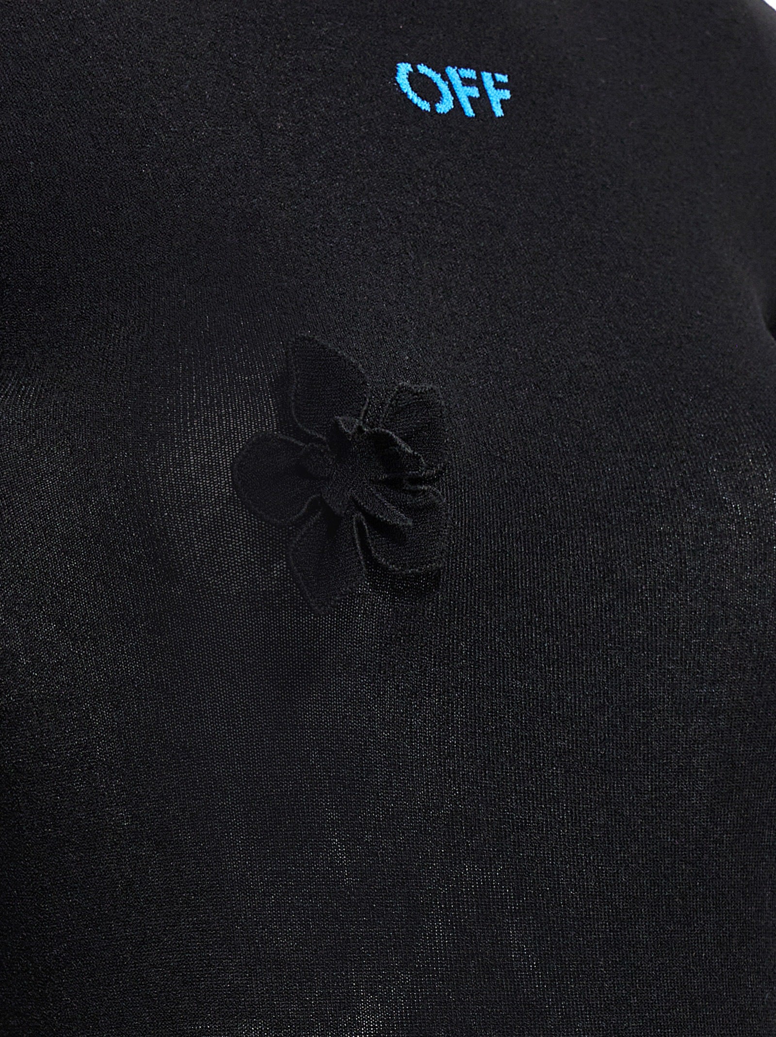 Long hooded viscose dress with front jacquard logo, floral appliqués, and long sleeves.