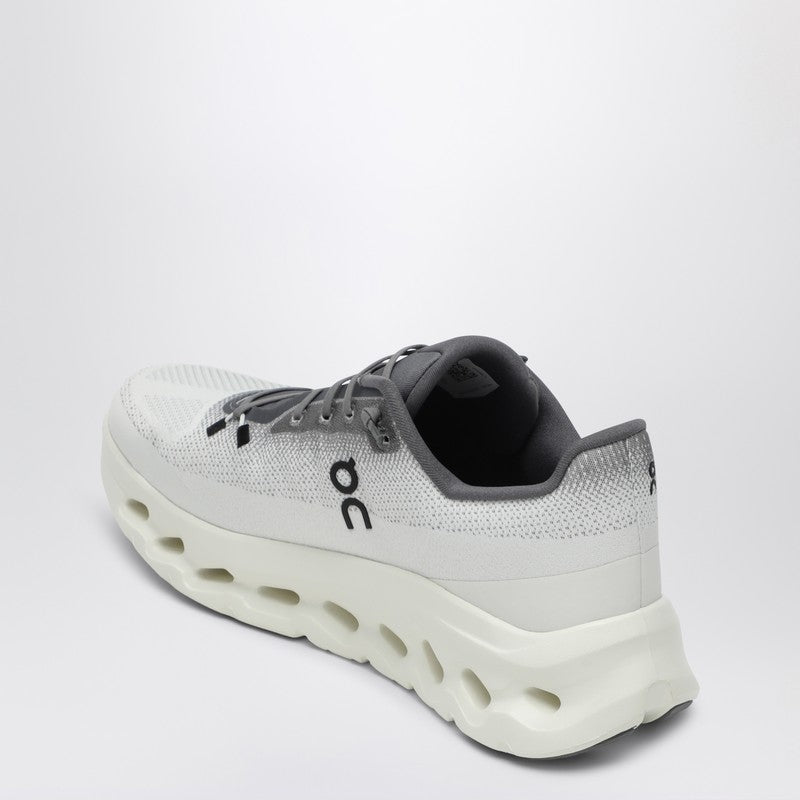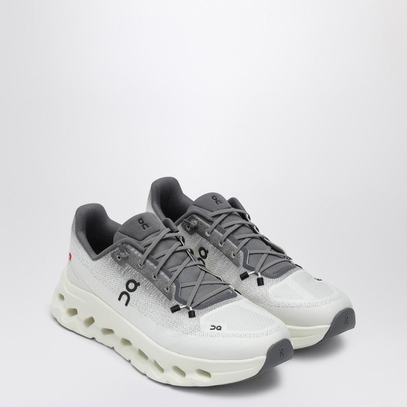 Low-top sneaker by On made with recycled materials in stone grey and ivory, featuring a round toe, lace-up closure, padded tongue and ankle collar, embroidered logo on the side and tongue, and iconic perforated rubber sole.
