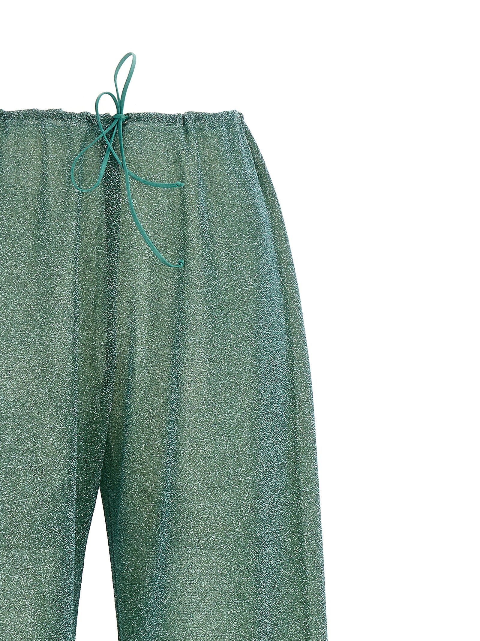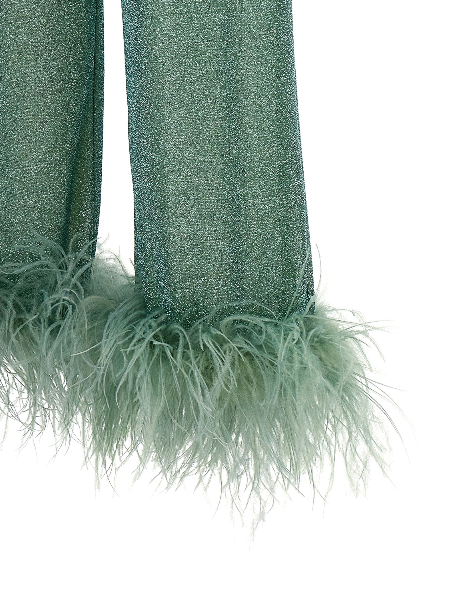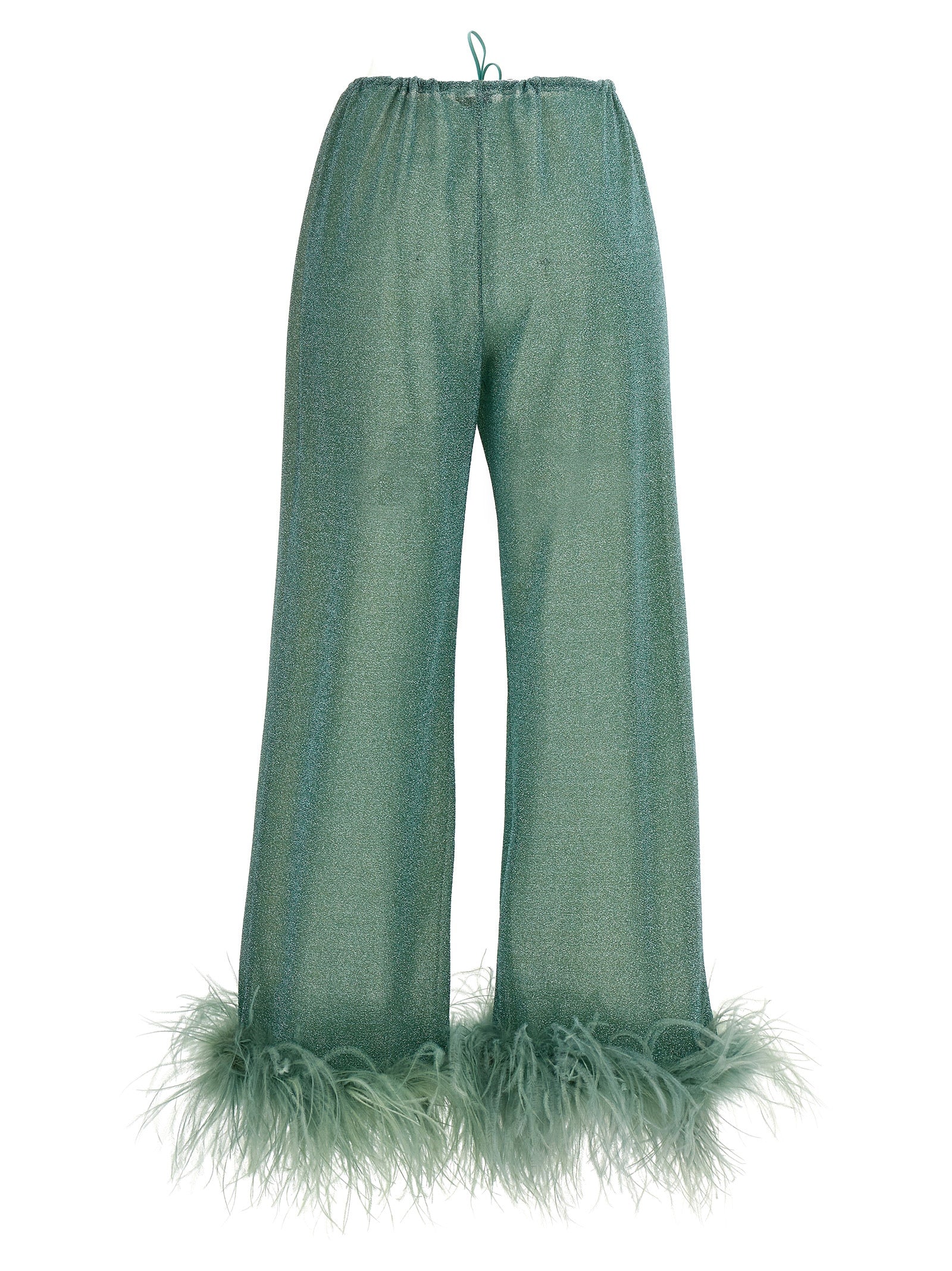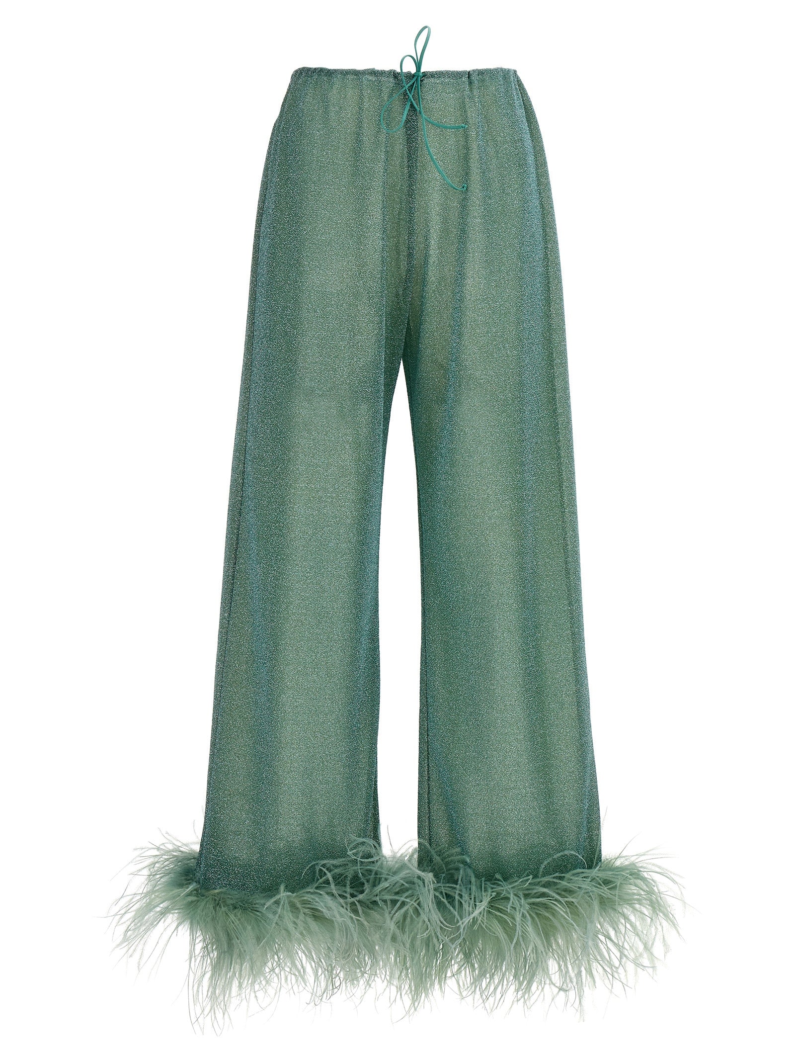 'Lumiere Plumage' pants in lurex fabric with feather application on the hem, adjustable drawstring at the waist.