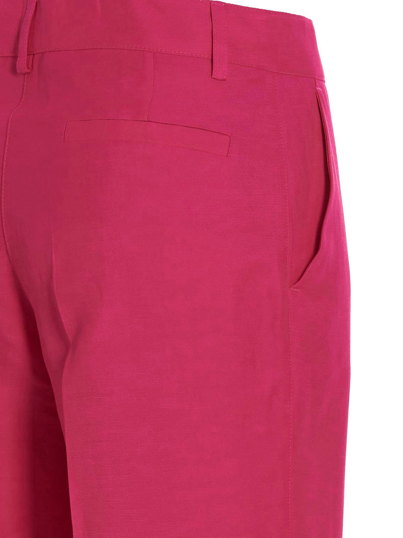 Viscose and linen pants with loose leg with central crease, zip and button closure, pockets.