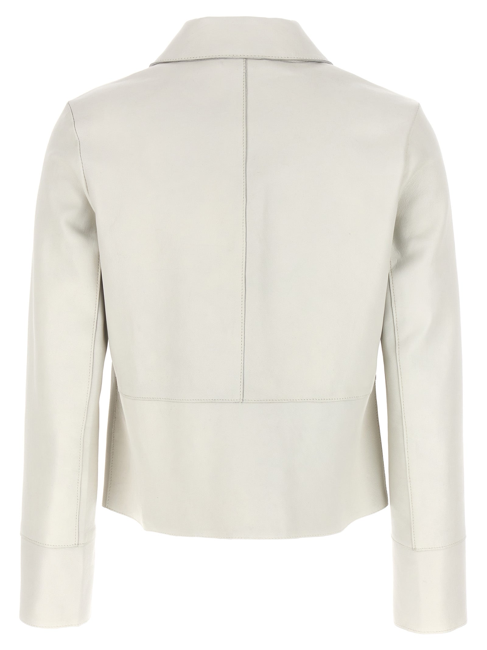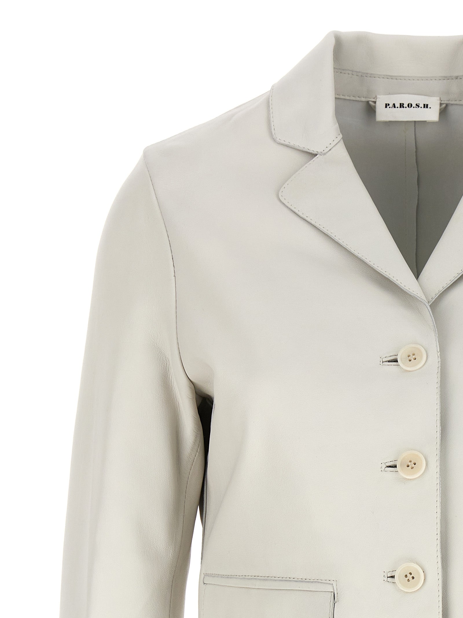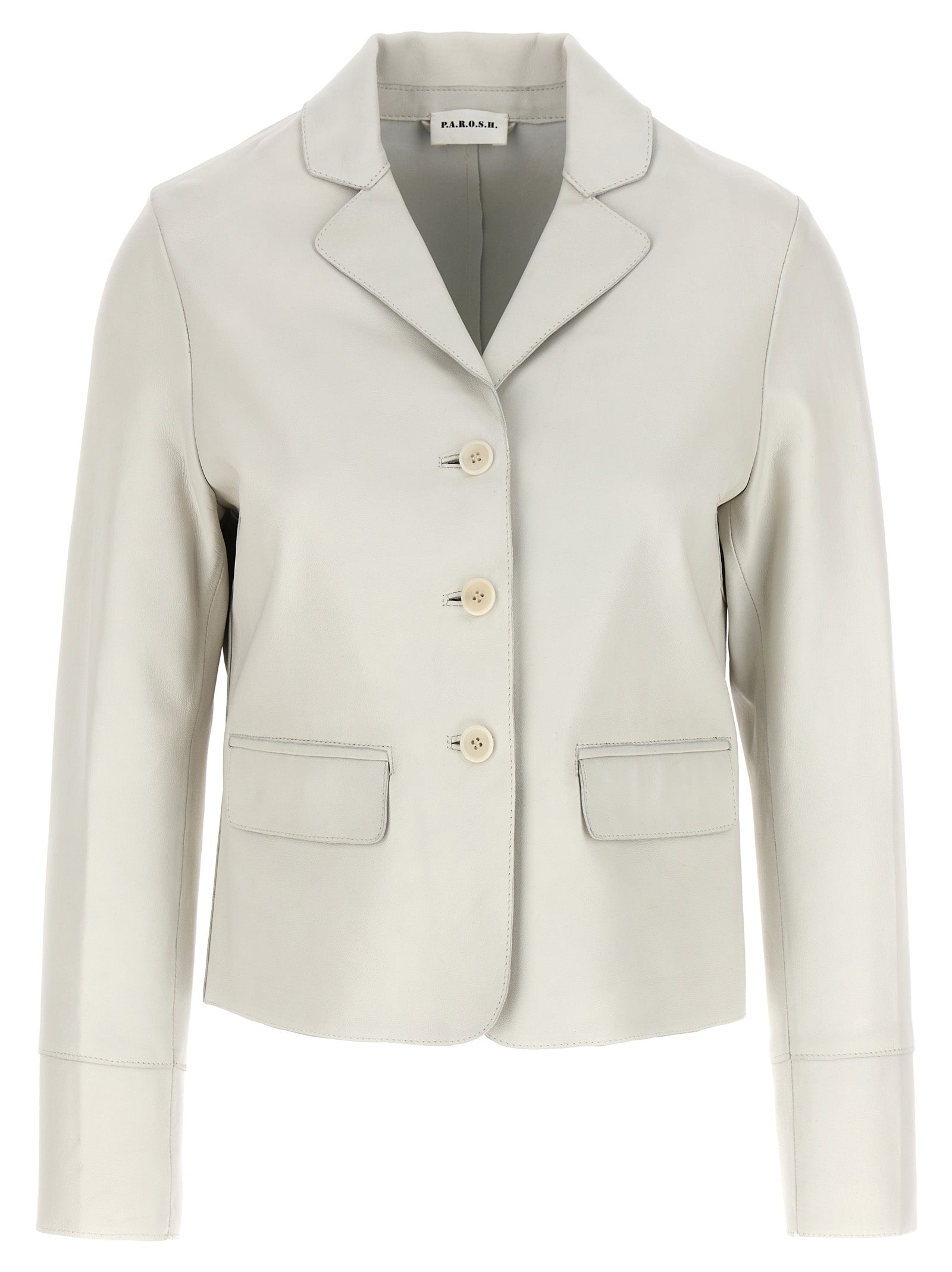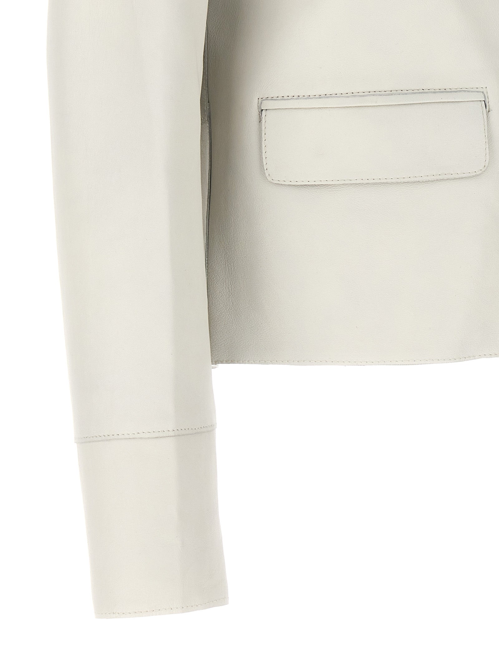 Crop leather single-breasted blazer with button closure and front flap pockets.