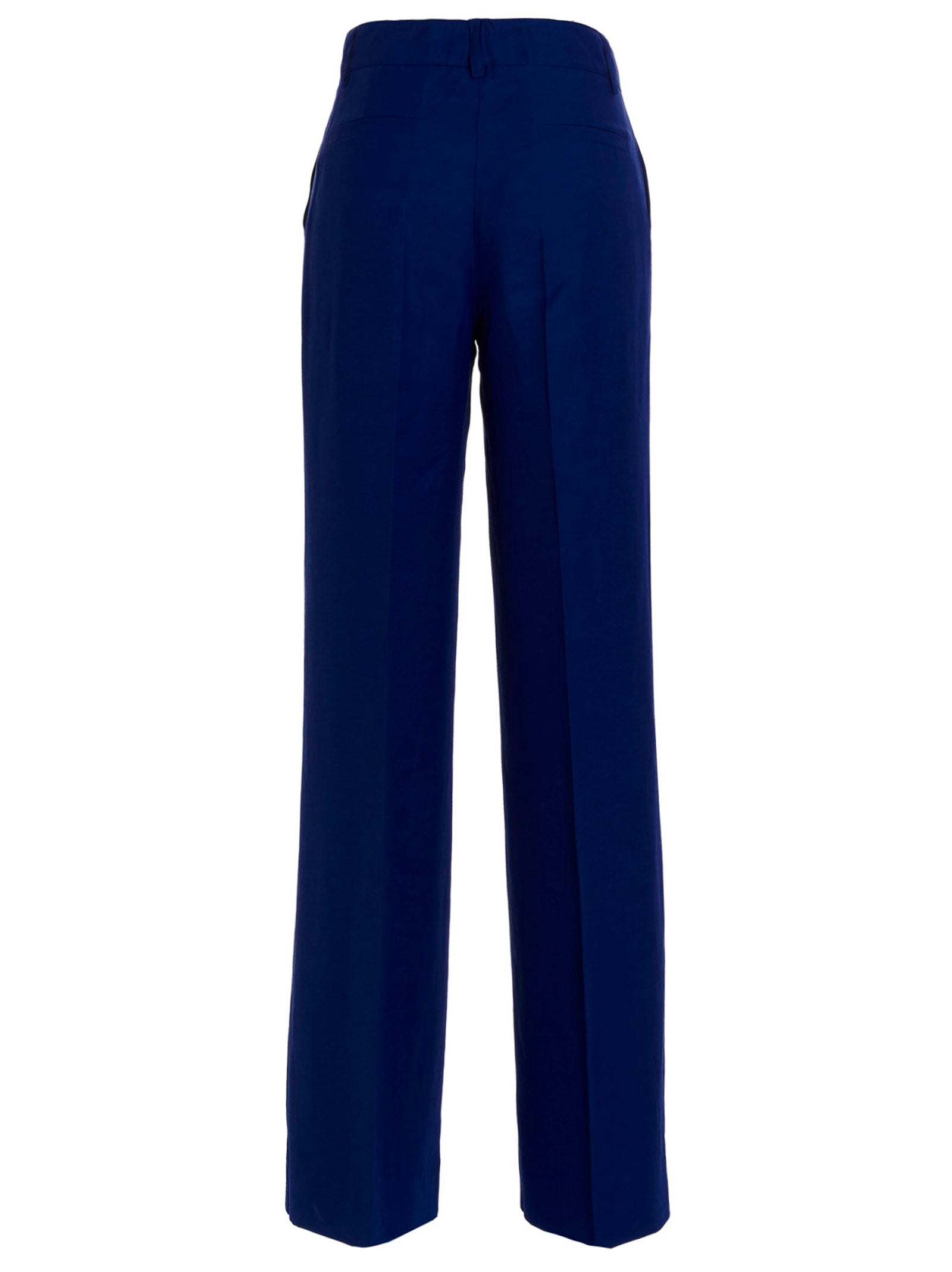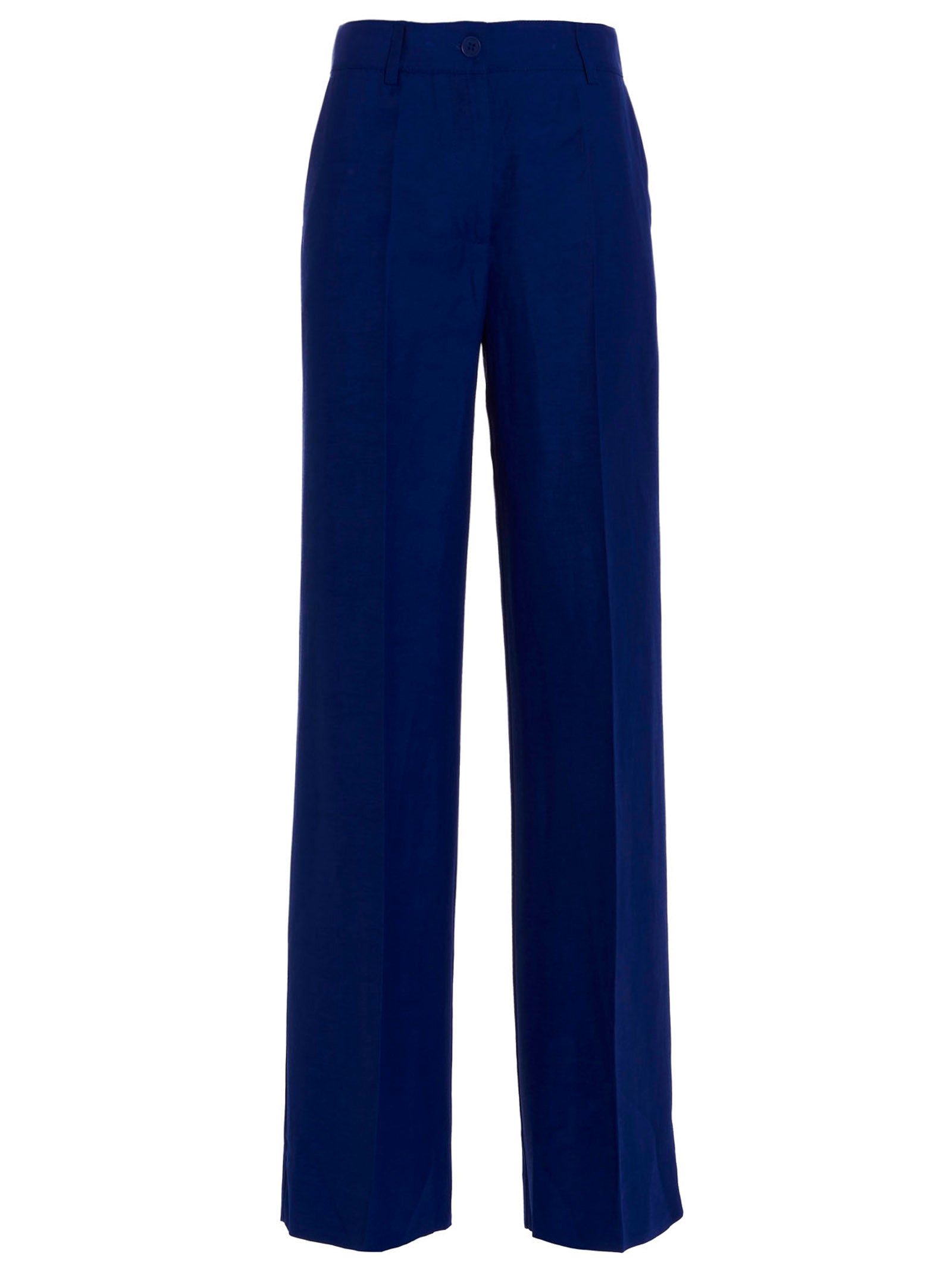 Viscose and linen pants with loose leg with central crease, zip and button closure, pockets.