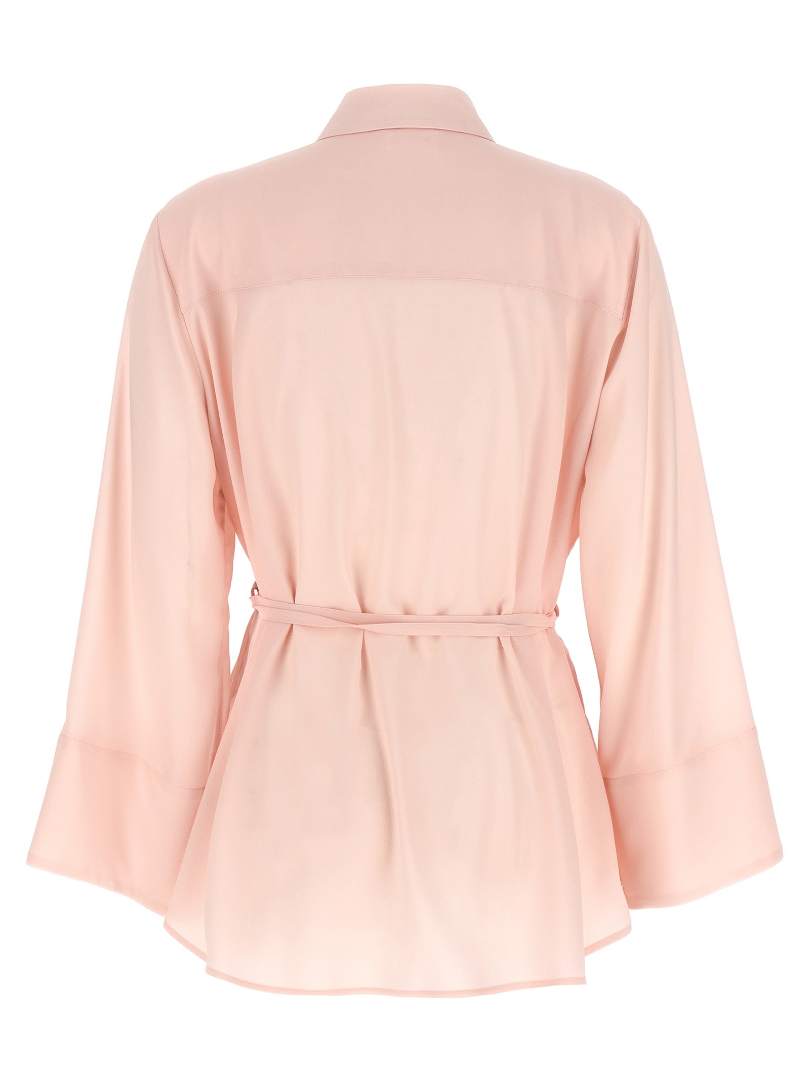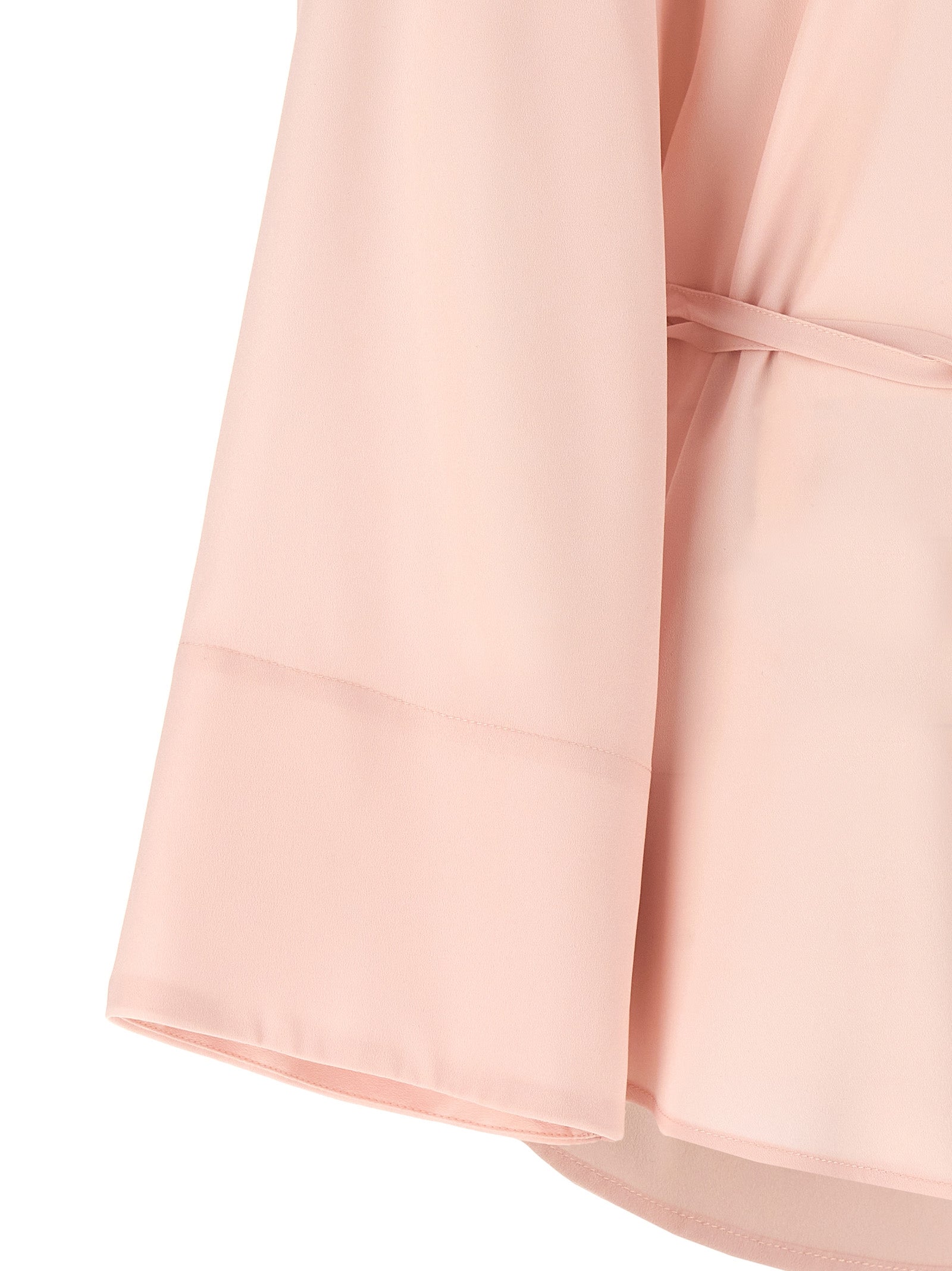 Technical fabric shirt with front buttons covered with a pleated ruffles, fabric strap detail at the waist.