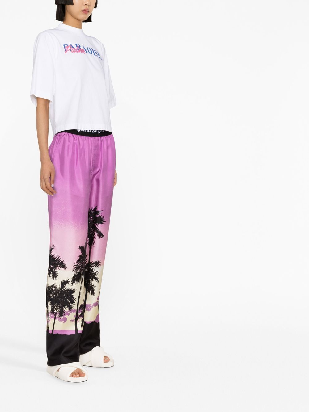 Sunset Pajama trousers from PALM ANGELS featuring fluorescent pink, black/white, logo waistband, palm tree print, concealed front button fastening, elasticated waistband and straight leg.