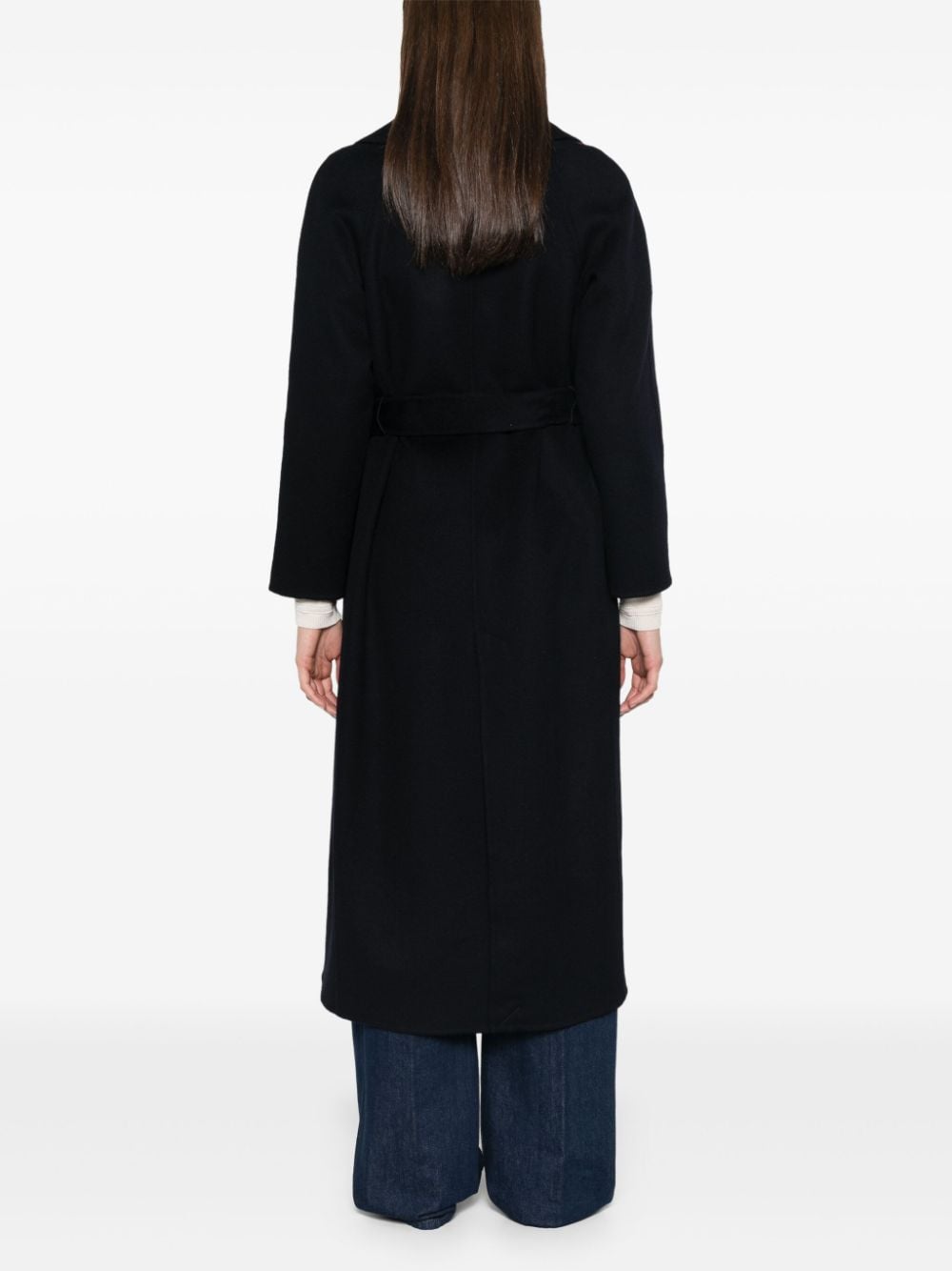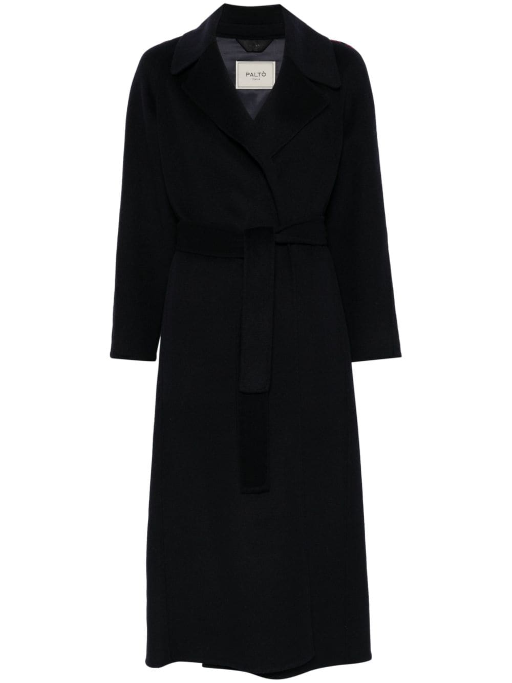 midnight blue wool blend felted self-tie fastening notched lapels long raglan sleeves belted waist two side inset pockets central rear vent partial lining straight hem long length