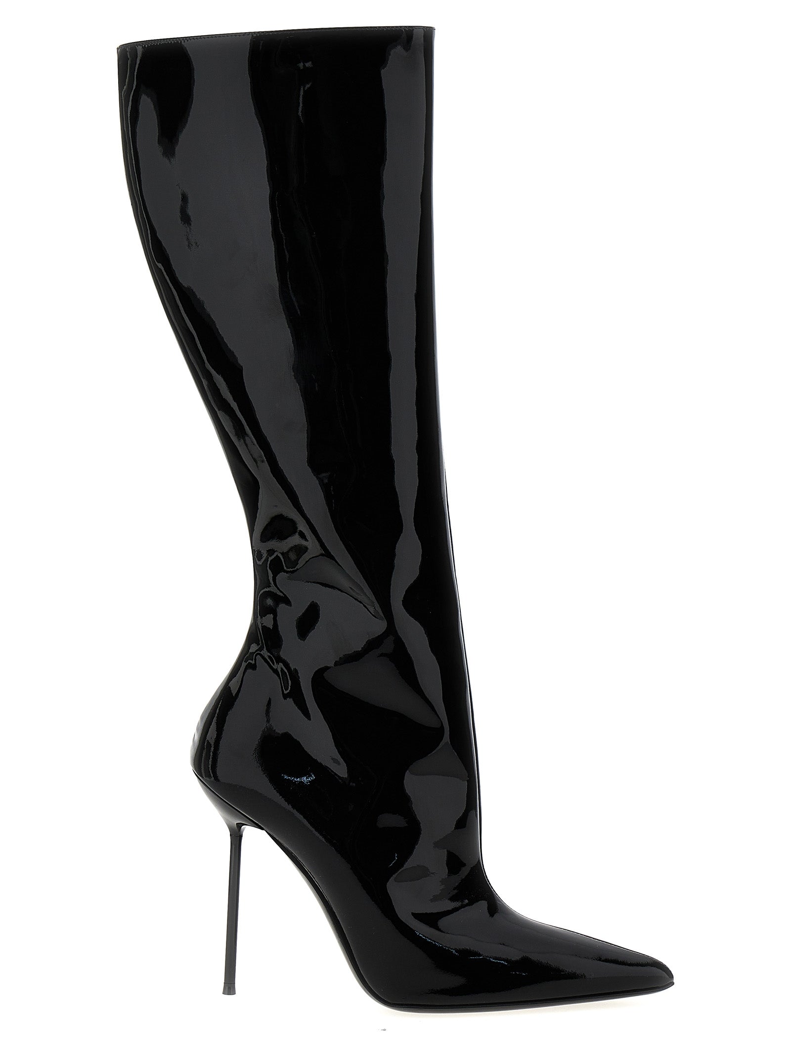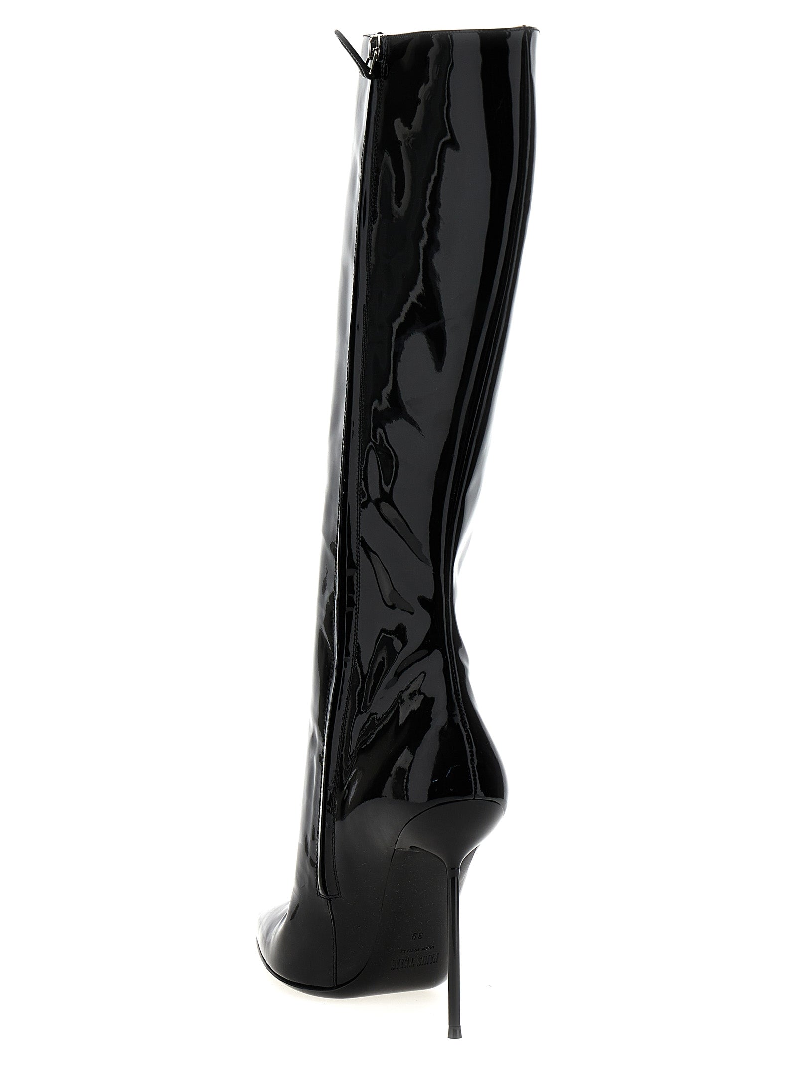 'Lidia' patent leather boots, side zip closure, stiletto heel.