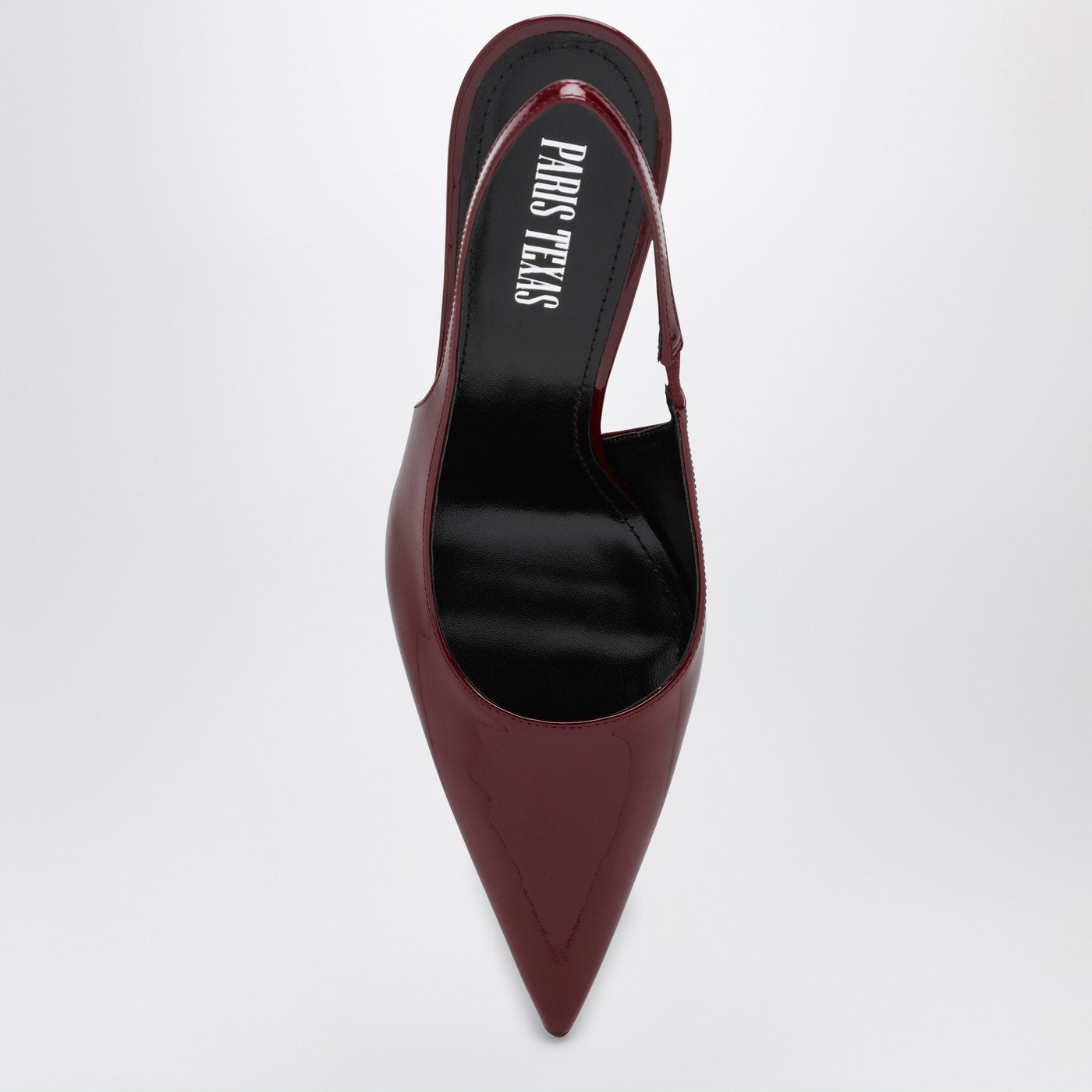 Patent leather slingback in rouge noir by Paris Texas, featuring a pointed design, a slim high heel, an elasticated strap and a leather sole.