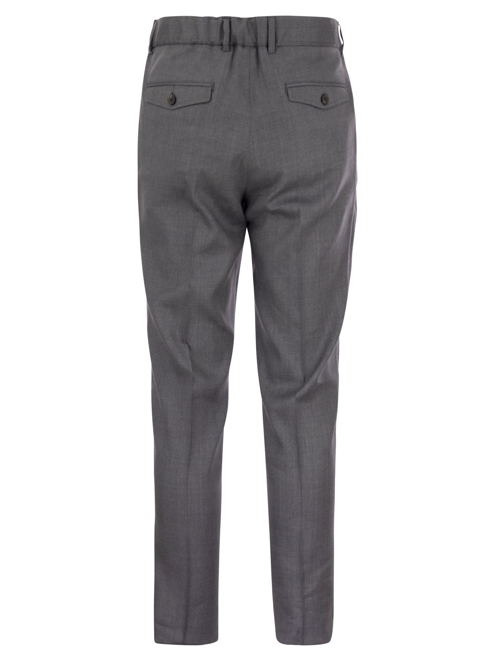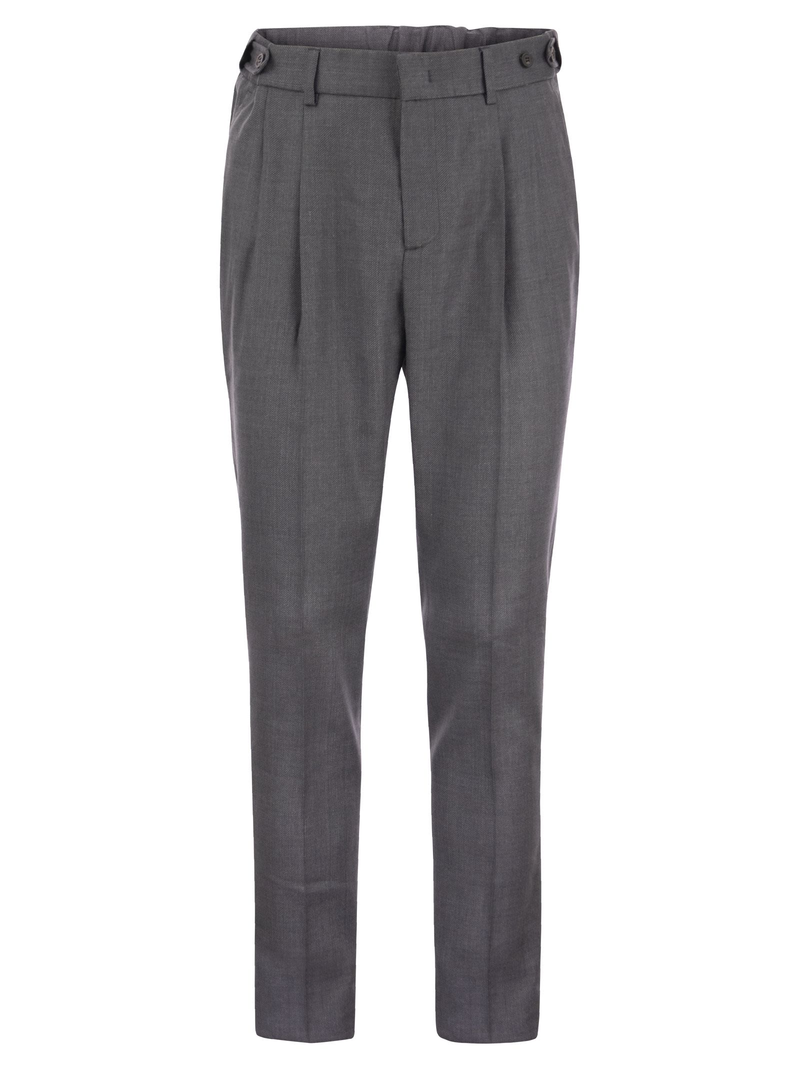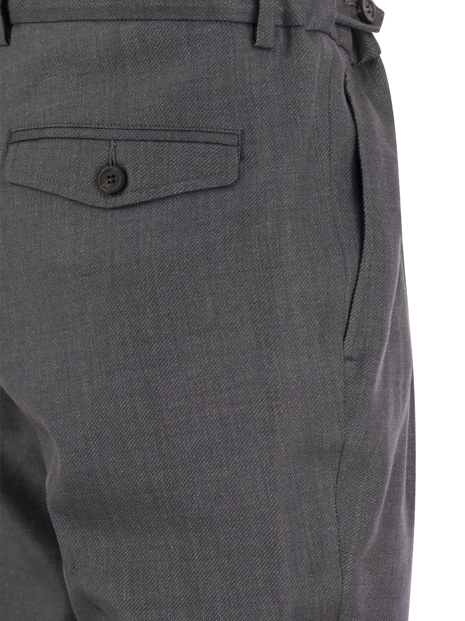 Pure Peserico style tailored trousers in linen and virgin wool blend. Finished with darts, welt pockets and side buttons that help and adjust the waist and fit. - America-style pockets at front - Double welt pockets with flap at the back - Elasticated belt at back - Relaxed fit with 2 darts - Zip and button closure DESIGNER ID: R54613N 05819 979
