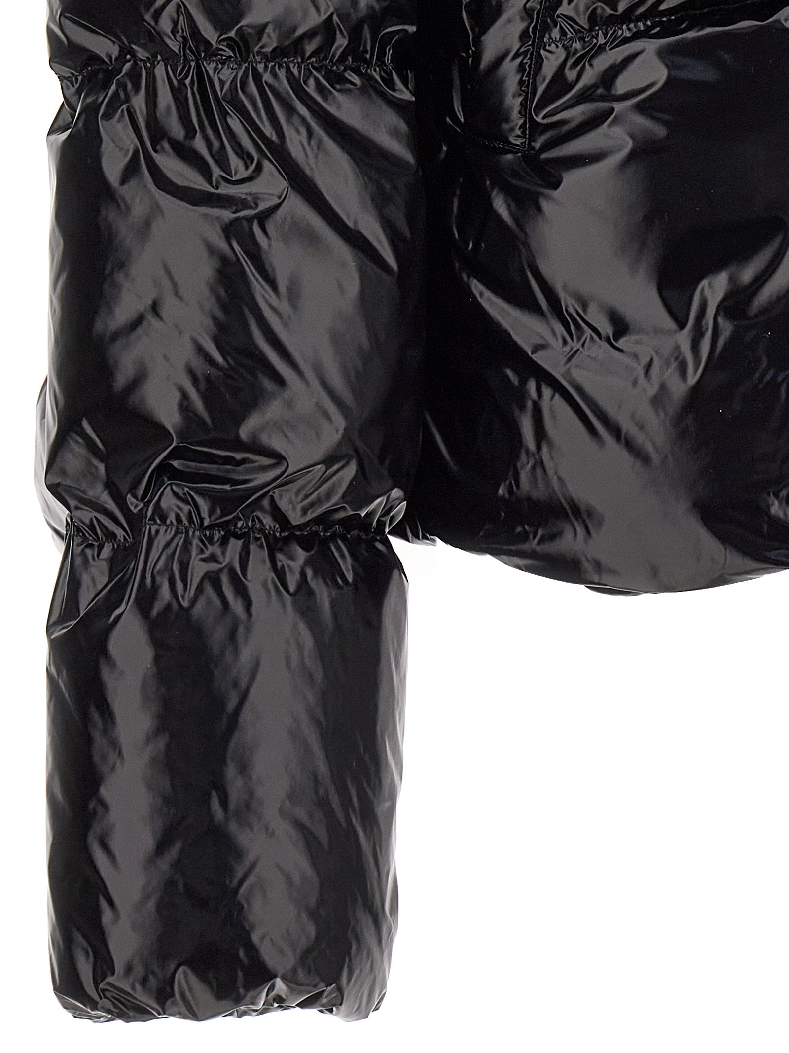 Micro' padded nylon down jacket with zip closure, pockets, long cuffed sleeves, and elastic drawstring on the garment bottom hem.