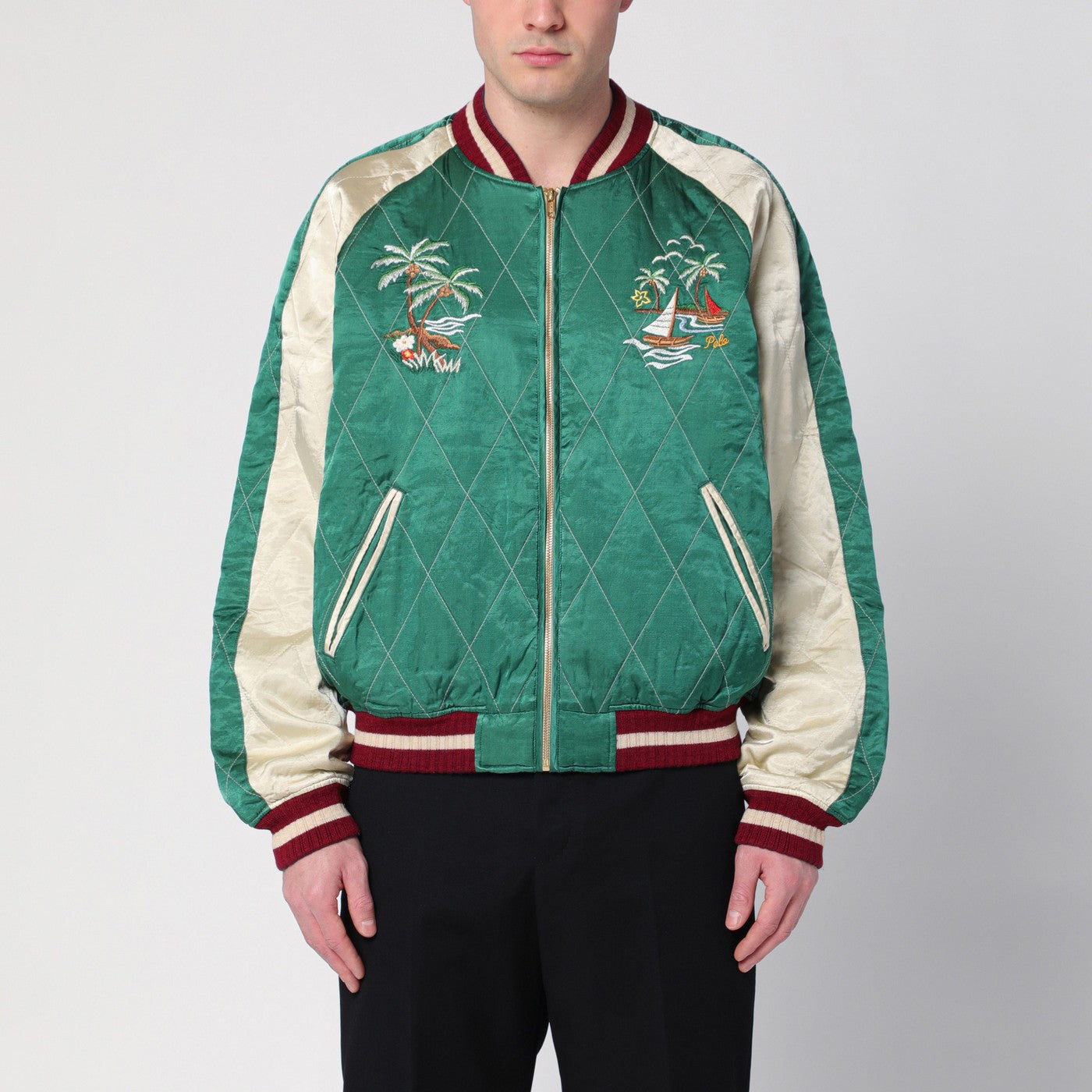 Bright green quilted viscose and cotton bomber jacket from Polo Ralph Lauren featuring a front zip fastening, long sleeves, two side welt pockets, multicoloured embroidery on the front and back, and ribbed knit edges.