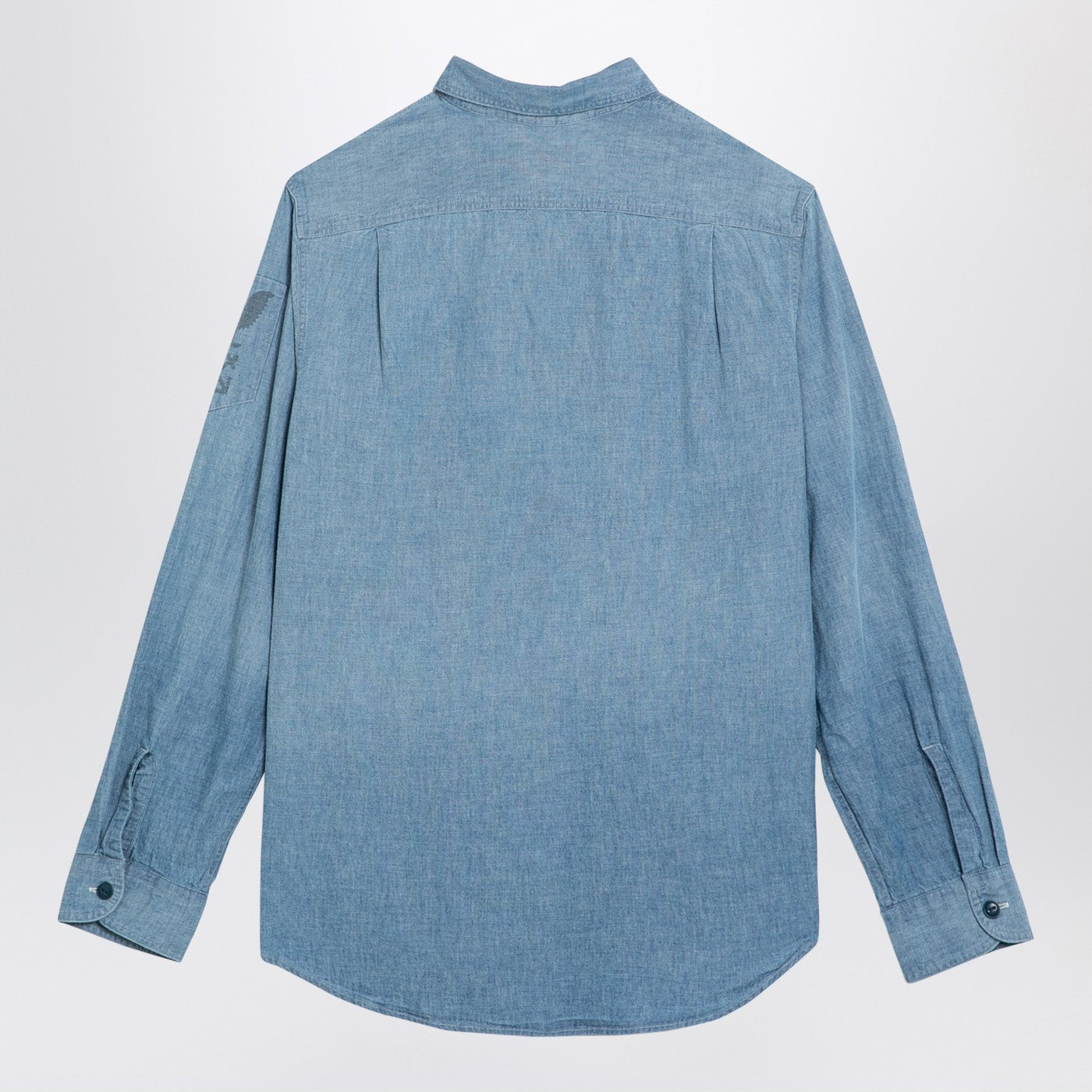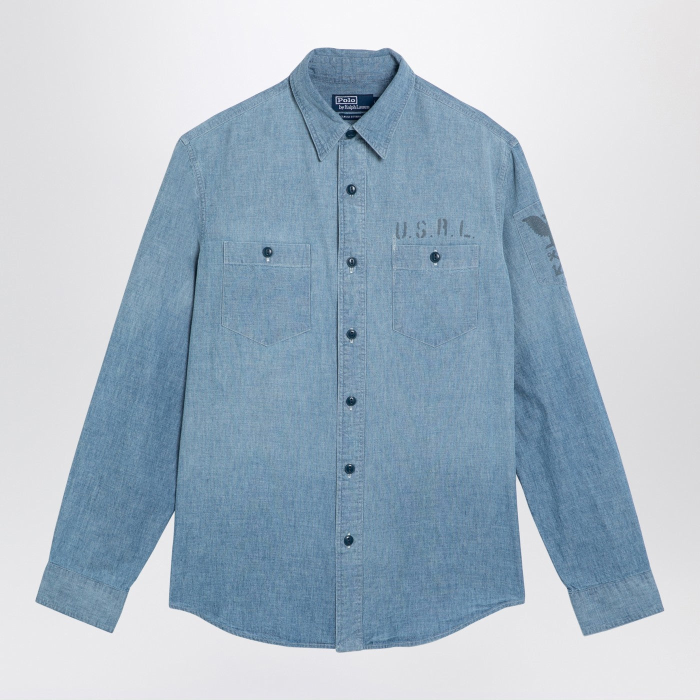 Iindigo blue cotton chambray shirt from Polo Ralph Lauren featuring a classic collar, long sleeves with buttoned cuffs and a patch pocket, a front button placket, military-inspired details, two buttoned chest patch pockets and a curved hem.