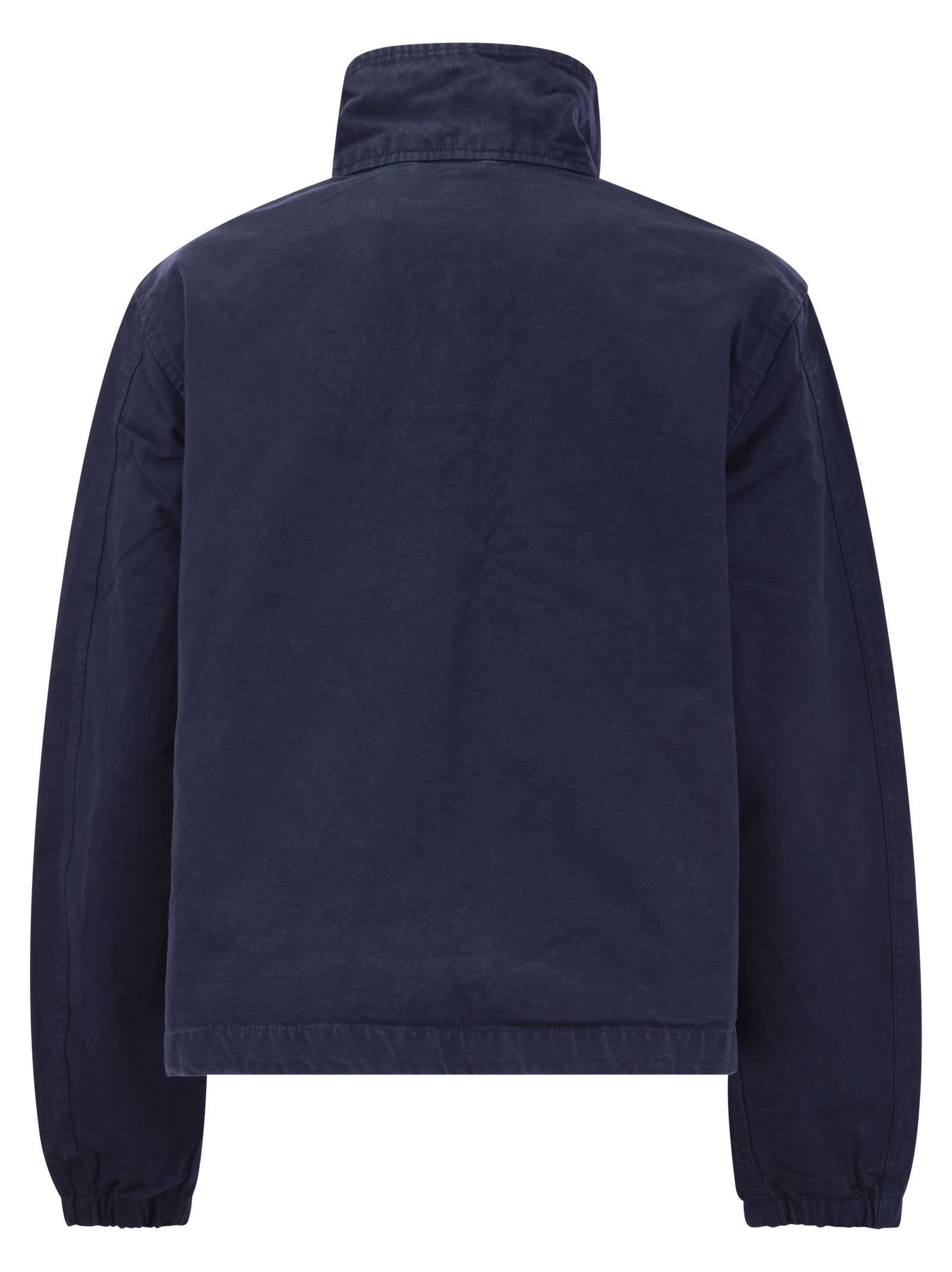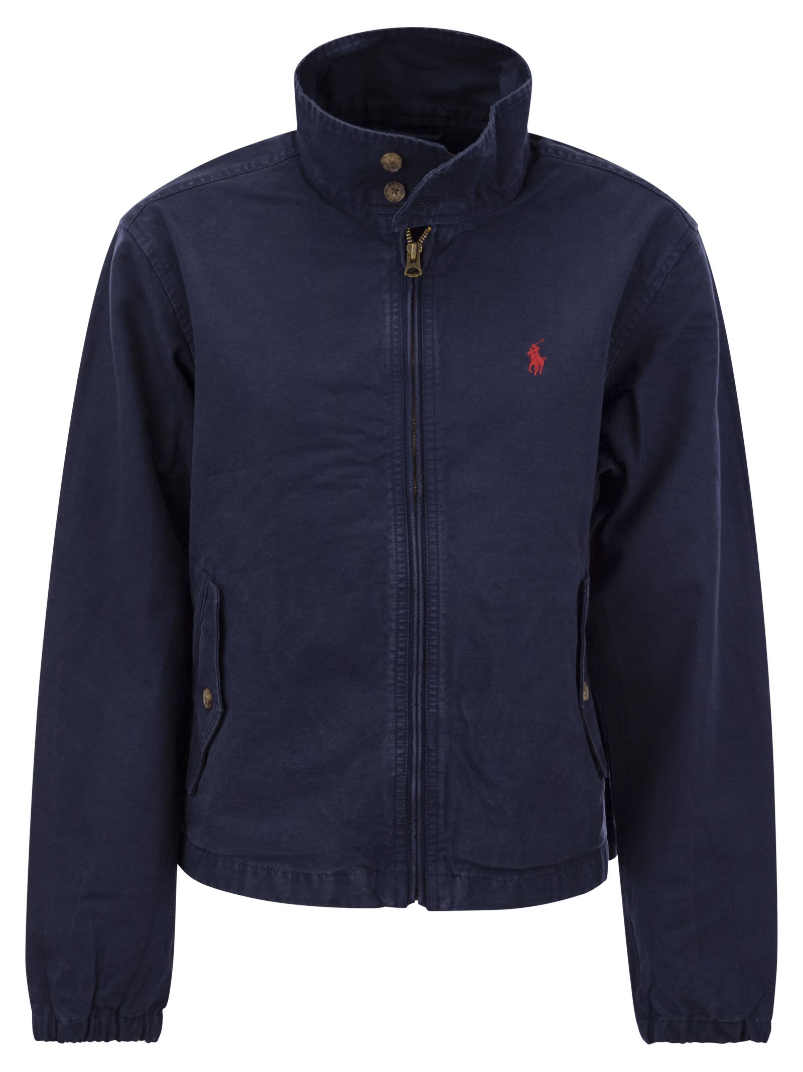 Featuring a slightly short cut, this fully lined cotton canvas jacket has a guru collar that can be worn up or folded down. - Slightly short straight cut - Length to above the hips - Guru collar - Inner hanging loop - Chin strap with two buttons - Zip fastening - Long sleeves with elasticated cuffs - Two buttoned bias pockets at the front waist - Exclusive embroidered pony on the left chest side DESIGNER ID: 211936442 004