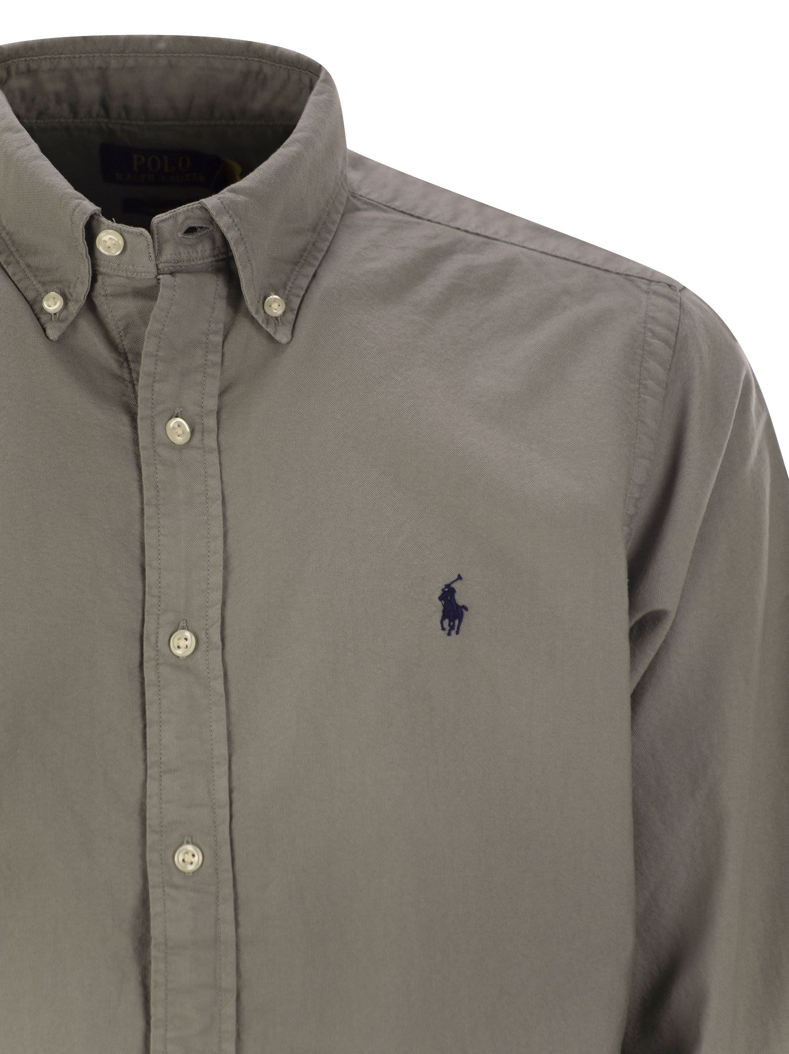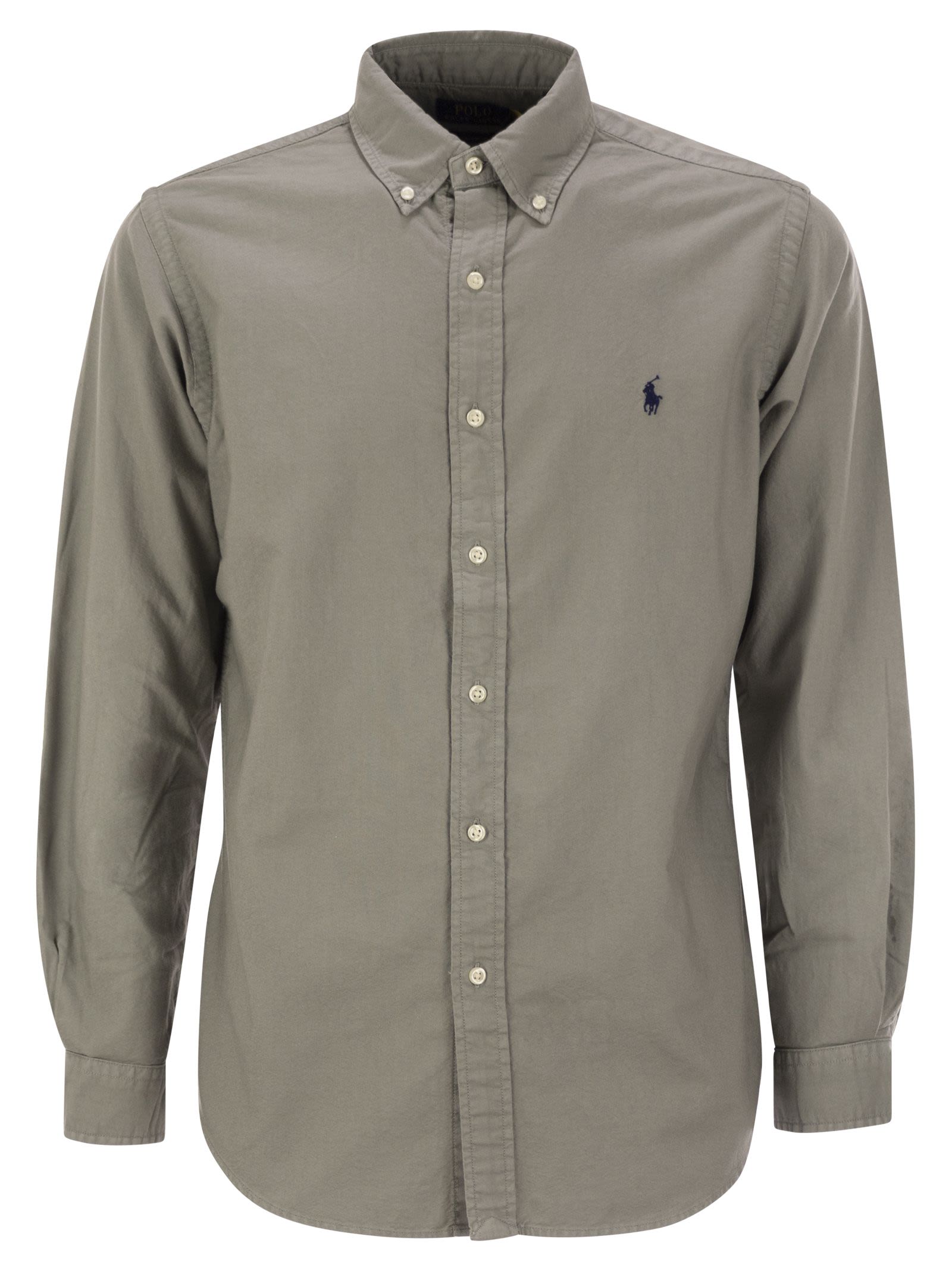 Garment-dyed and previously washed, this shaped-cut cotton shirt has a worn appearance. - Custom-Fit: a contoured silhouette, midway between Classic-Fit and Slim-Fit. fitted at the waist. - Pointed button-down collar - Button-down collar - Long sleeves with button cuffs - Divided back yoke with cannon pleats for a comfortable fit and greater freedom of movement - Exclusive embroidered Pony on the left chest side DESIGNER ID: 710805564 004