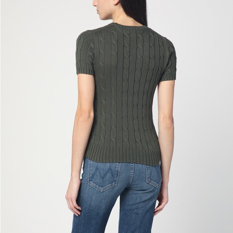 Polo Ralph Lauren olive green cotton crew neck sweater, featuring short sleeves, a chest pocket with embroidered logo, cable knit design, and ribbed edges.