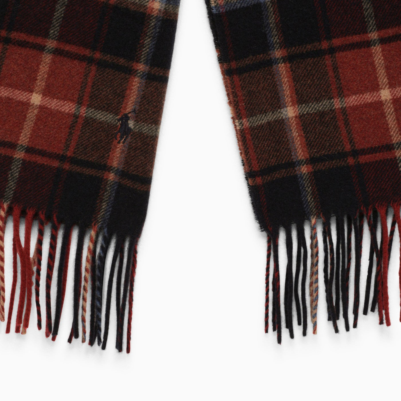 Red wool and cashmere scarf by Polo Ralph Lauren, featuring decorative fringe and check pattern.