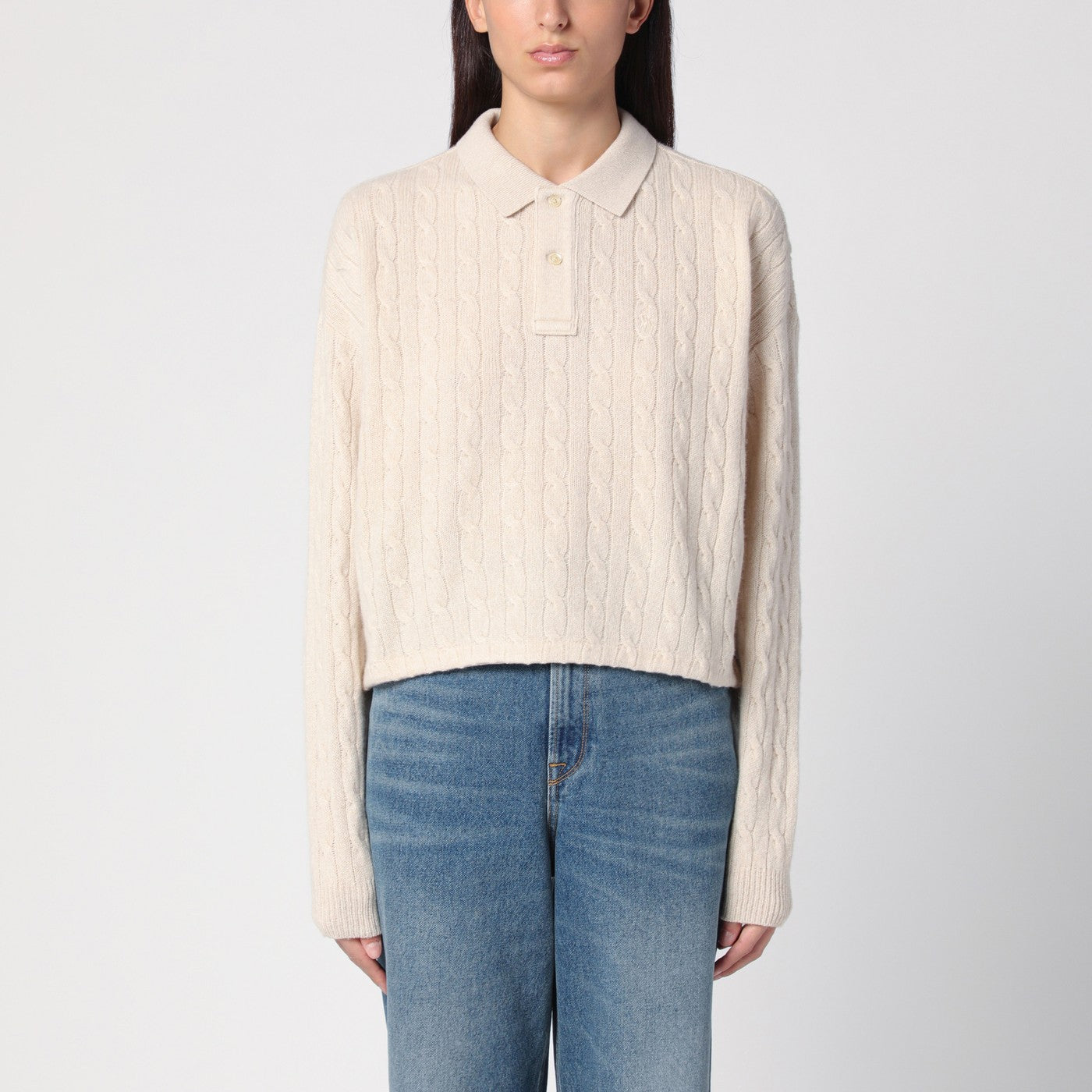 Light beige wool and cashmere polo shirt by Polo Ralph Lauren featuring a button front, long sleeves with ribbed cuffs and a cable-knit design.