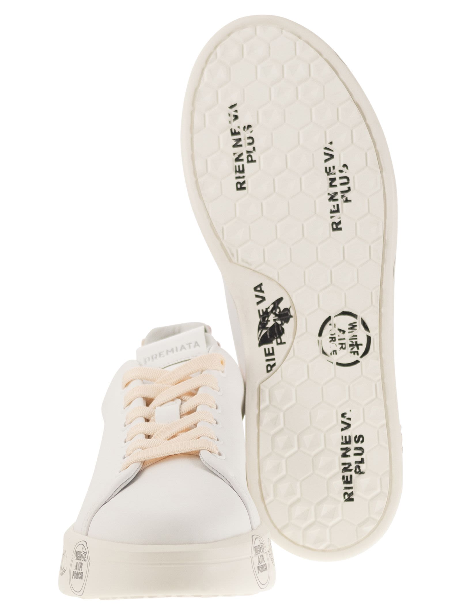 Soft white leather 'Belle' trainers. The look is enriched by bright details on the back of the heel. Extremely light and comfortable oversized sole. A shoe with dual functionality, sporty and elegant. - Genuine leather - Logo on tongue DESIGNER ID: BELLE 6709