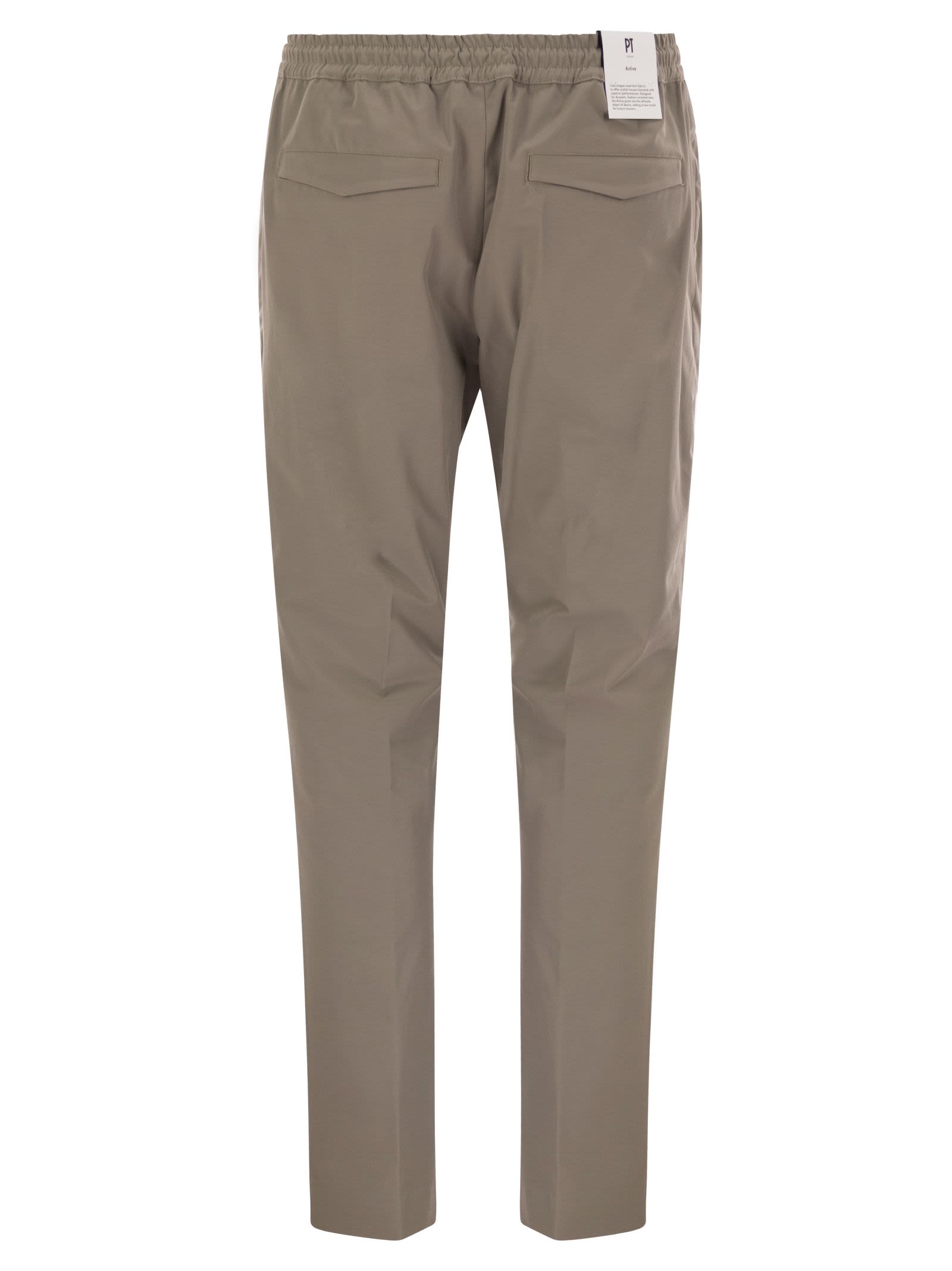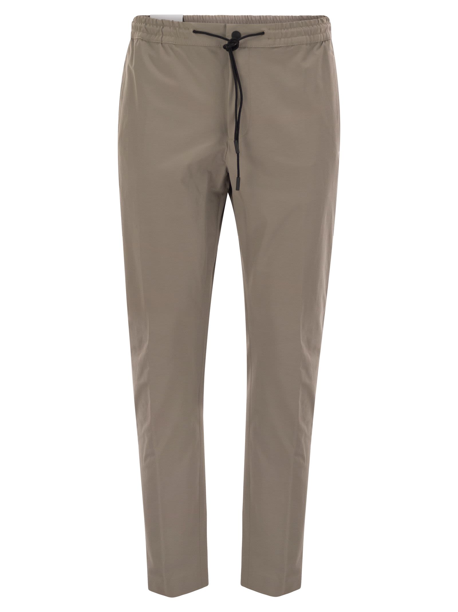 'Omega' trousers in stretch technical fabric from the Active capsule collection, which collects pieces with a dynamic and fashion-oriented soul. 'Omega' is a relaxed fit and made more comfy by the elastic waist with drawstring. - America style front pockets - Back pockets with flap - Zip closure - Elastic waistband with drawstring DESIGNER ID: COASMGZ40KLTIT19 0100