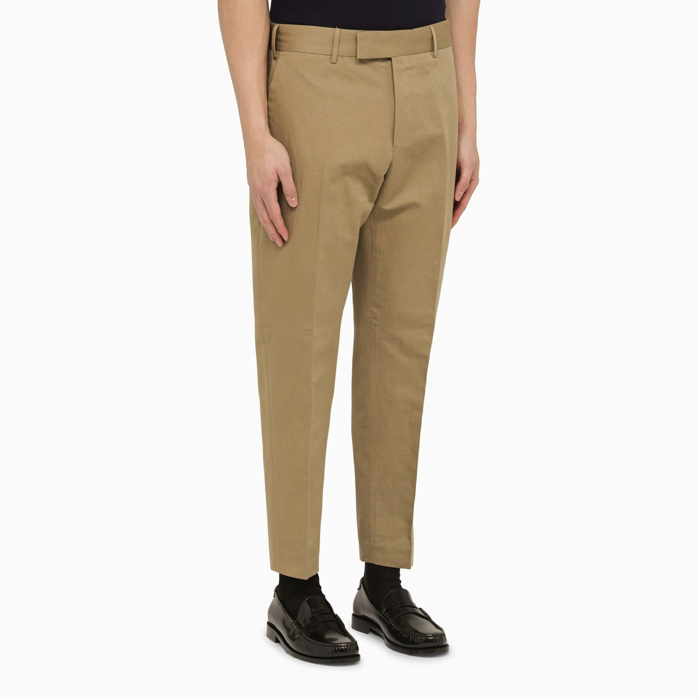Rope-coloured cotton and linen slim trousers from PT Torino featuring a front zip and hook fastening, belt loops, two side welt pockets, two back welt pockets and a removable feather charm on the back.