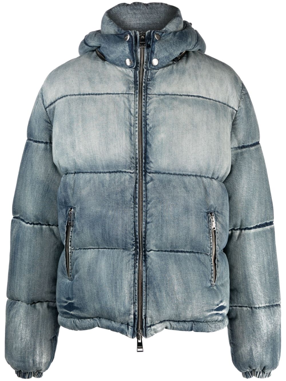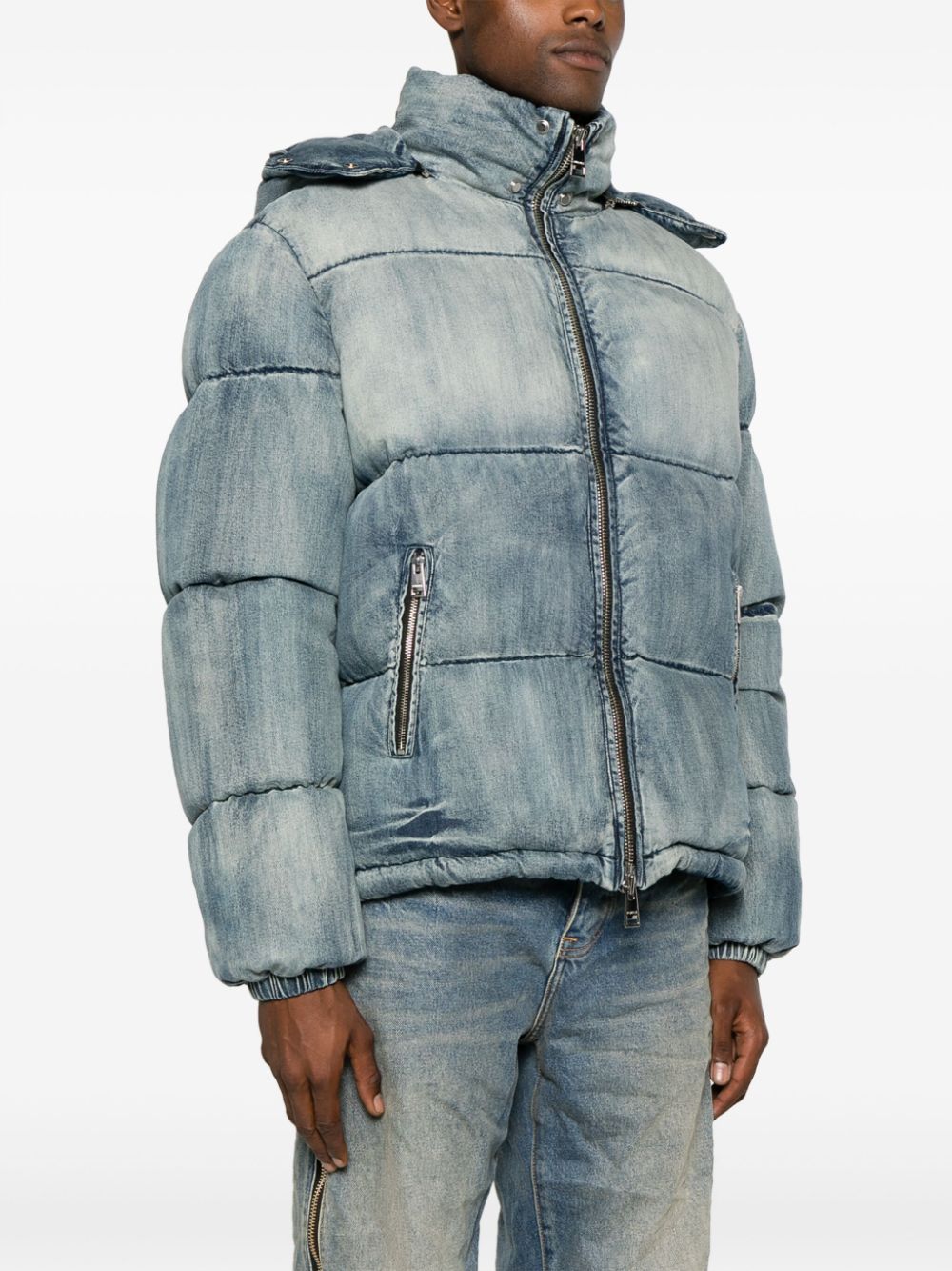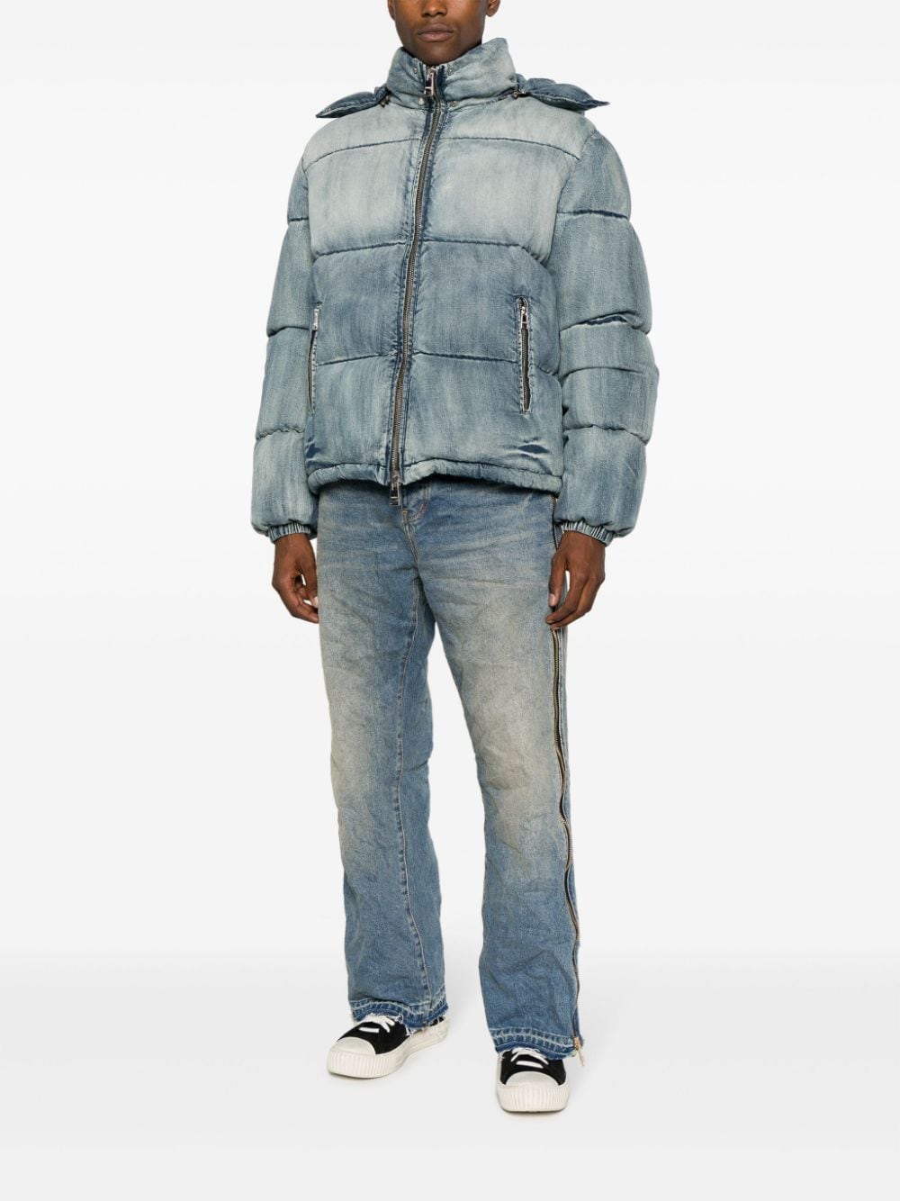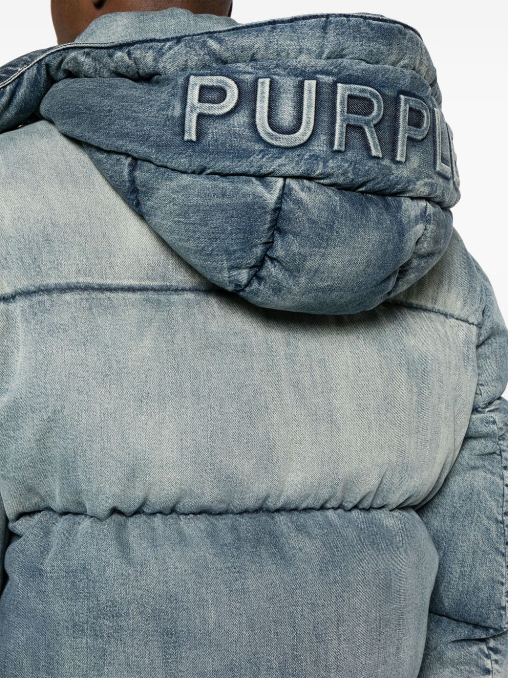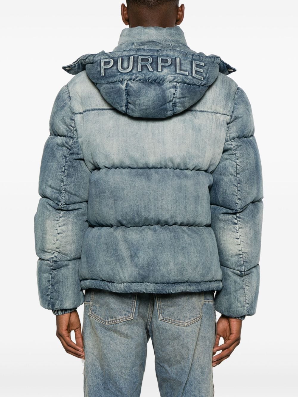 logo-patch padded jacket from Purple Brand featuring blue, cotton, feather down, padded design, washed denim, logo patch at the chest, detachable hood, front zip fastening, two side zip-fastening pockets, long sleeves, elasticated cuffs and straight hem. When buying this unisex item, keep in mind that it is graded in standard men's sizing..