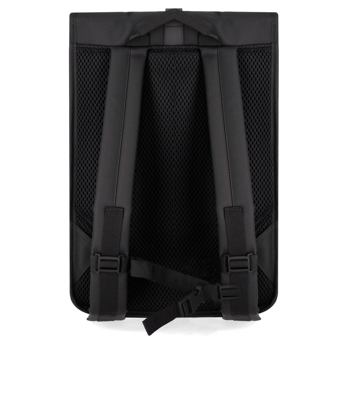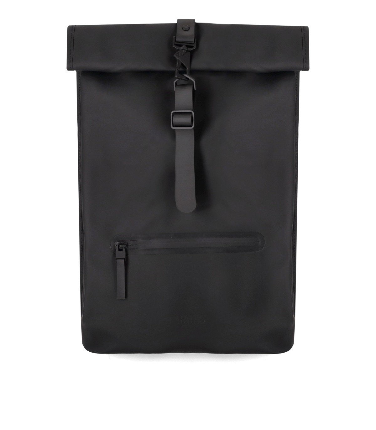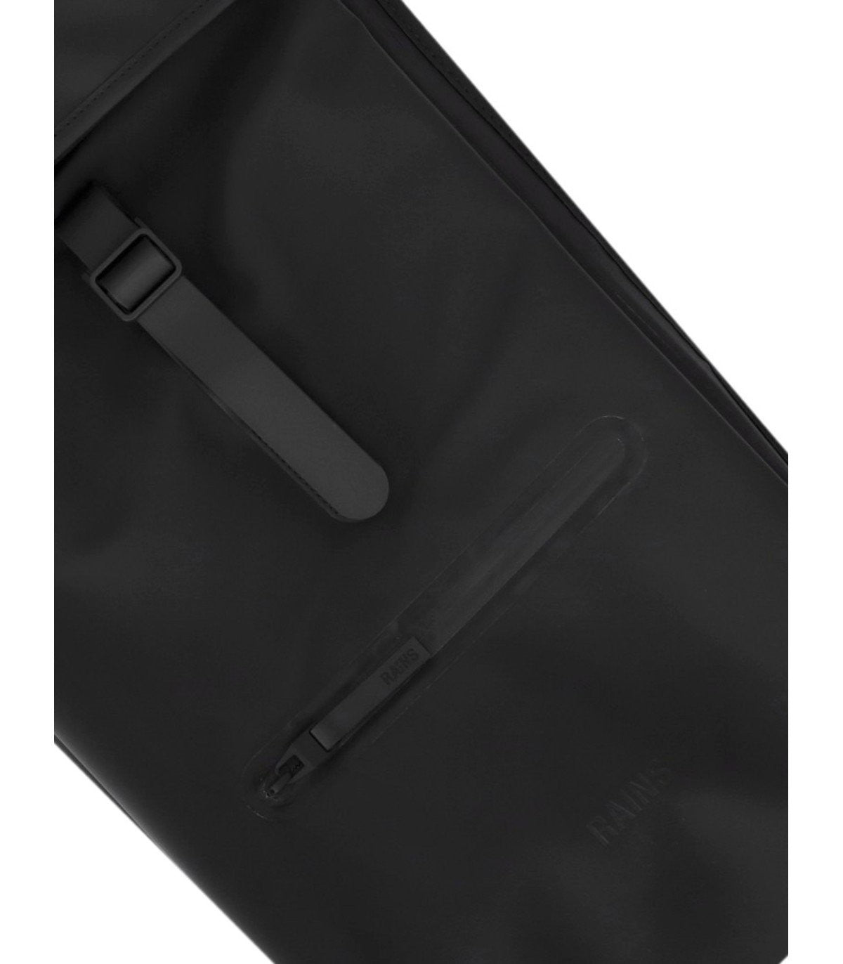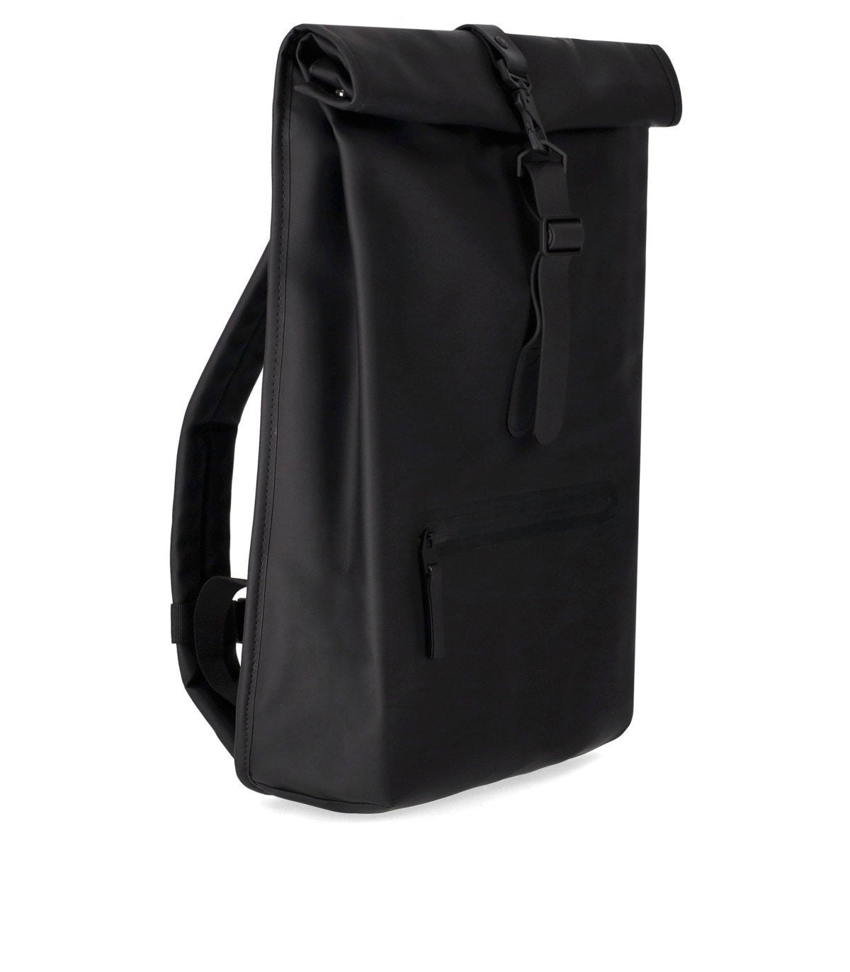 Backpack made of Rains' iconic waterproof PU, in black version, featuring a rolltop closure with buckle and a front pocket with zipper. Expandable interior with side buttons and lined. Padded back and adjustable shoulder straps. Dimensions 48x32x11 cm. Composition: 100% polyester with 100% polyurethane coating.