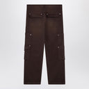 Brown washed effect cotton denim Represent trousers featuring a front fastening, belt loops at the waist, two welt pockets, side patch cargo pockets, one of which has a flap and a logo-printed metal tag, and two back flap pockets.