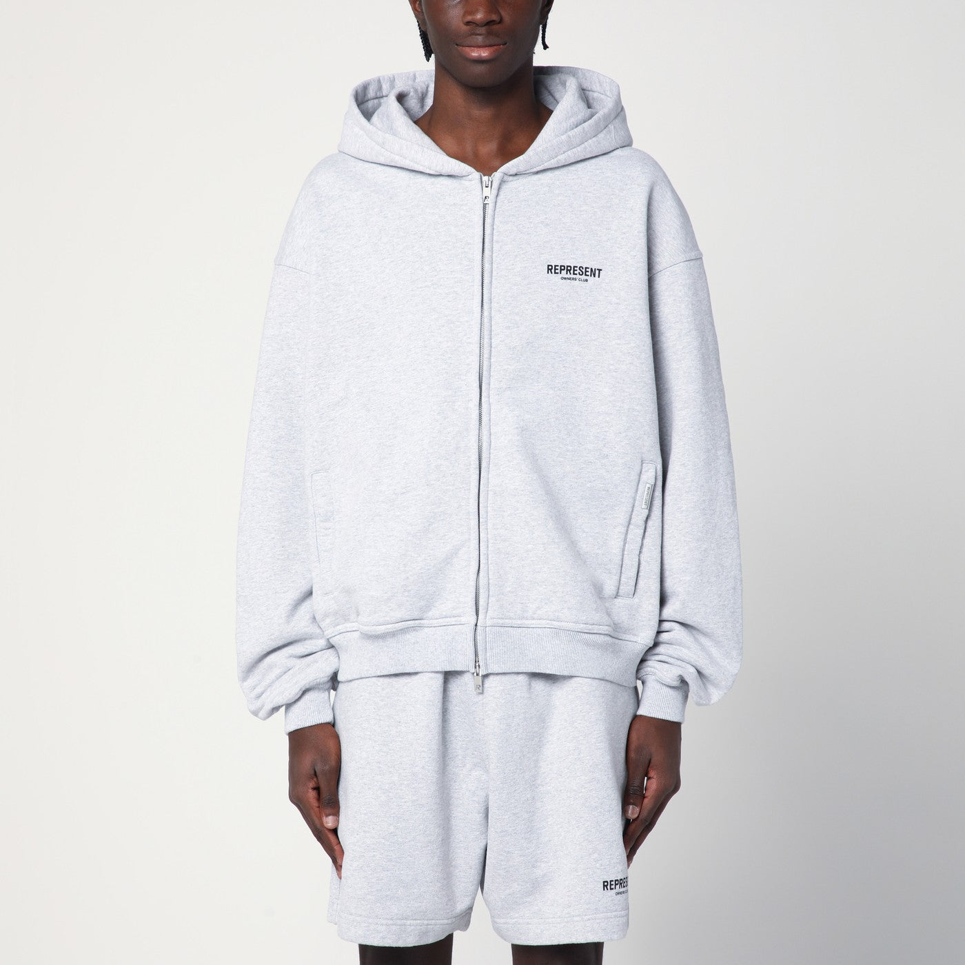 Light grey cotton over hooded sweatshirt by Represent with long sleeves, lettering logo on chest, contrasting back lettering logo, front fastening via double zip, two side welt pockets with logo metal detail and ribbed hems.