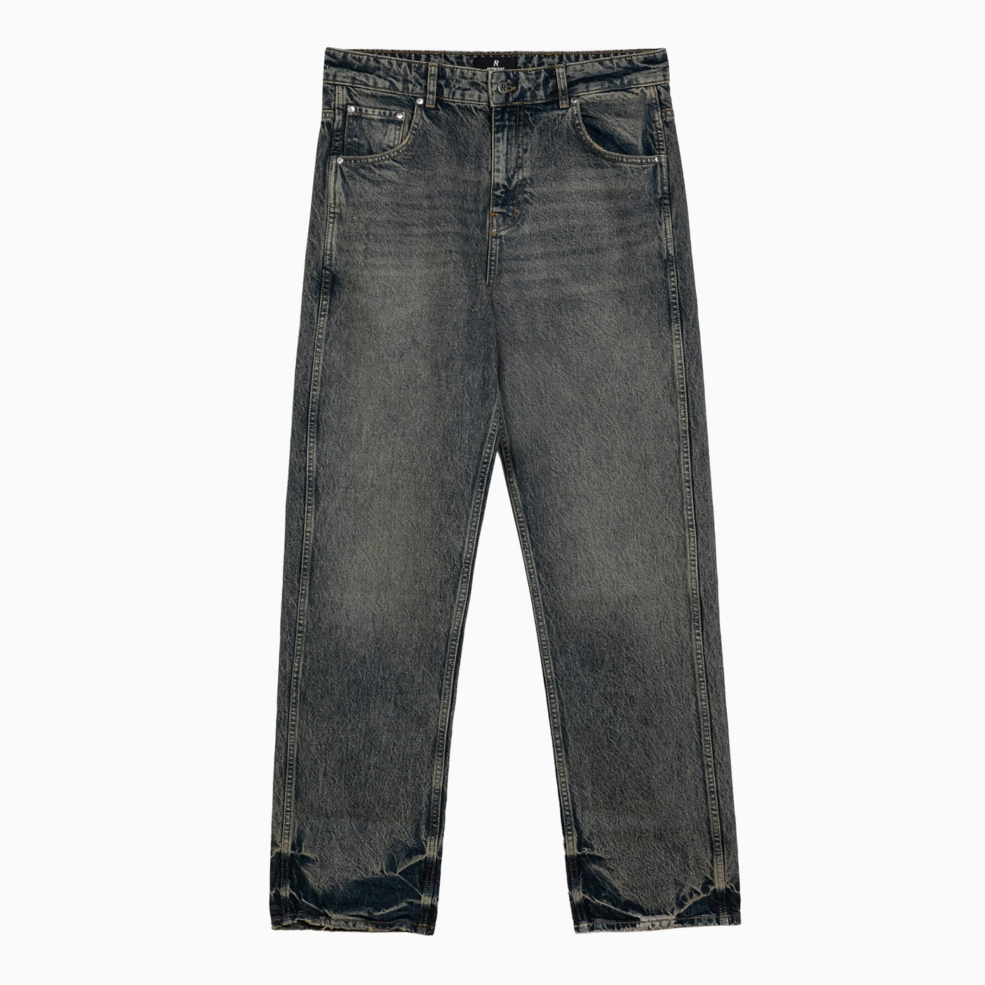 Regular jeans in washed-out cotton denim by Represent featuring five classic pockets, belt loops with metal logo detail on the back, a front zip and button fastening and an embroidered logo on the back pocket.