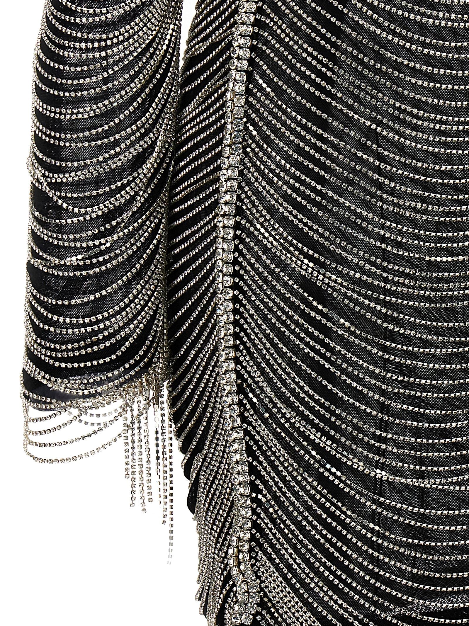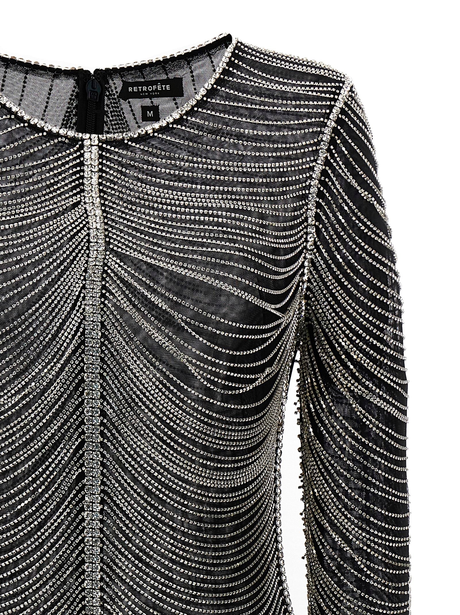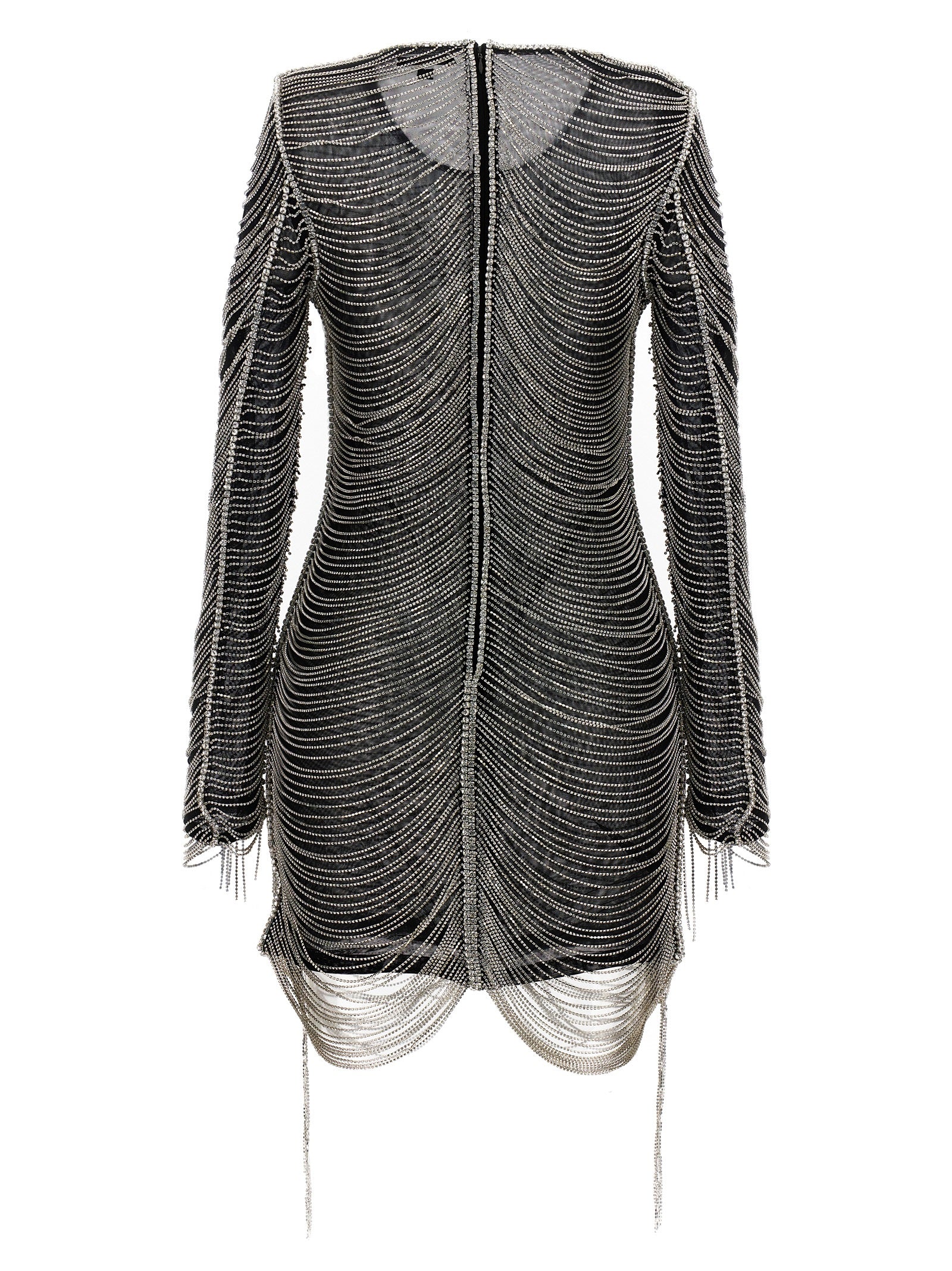 'Jacqueline' dress in transparent mesh fabric with all-over crystal draping, crewneck, long sleeves, and back zip closure.