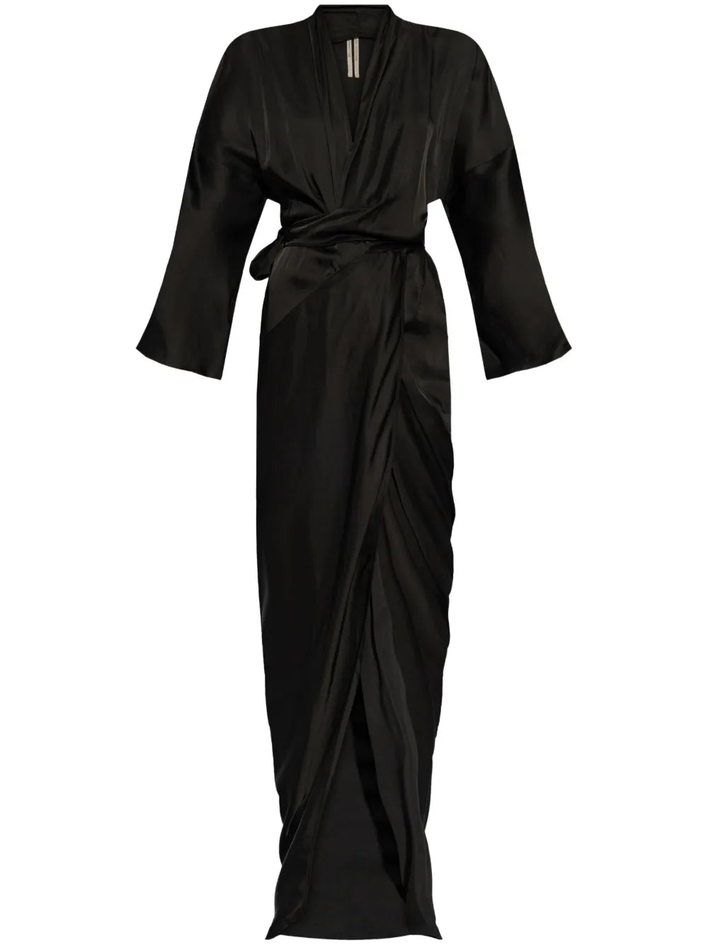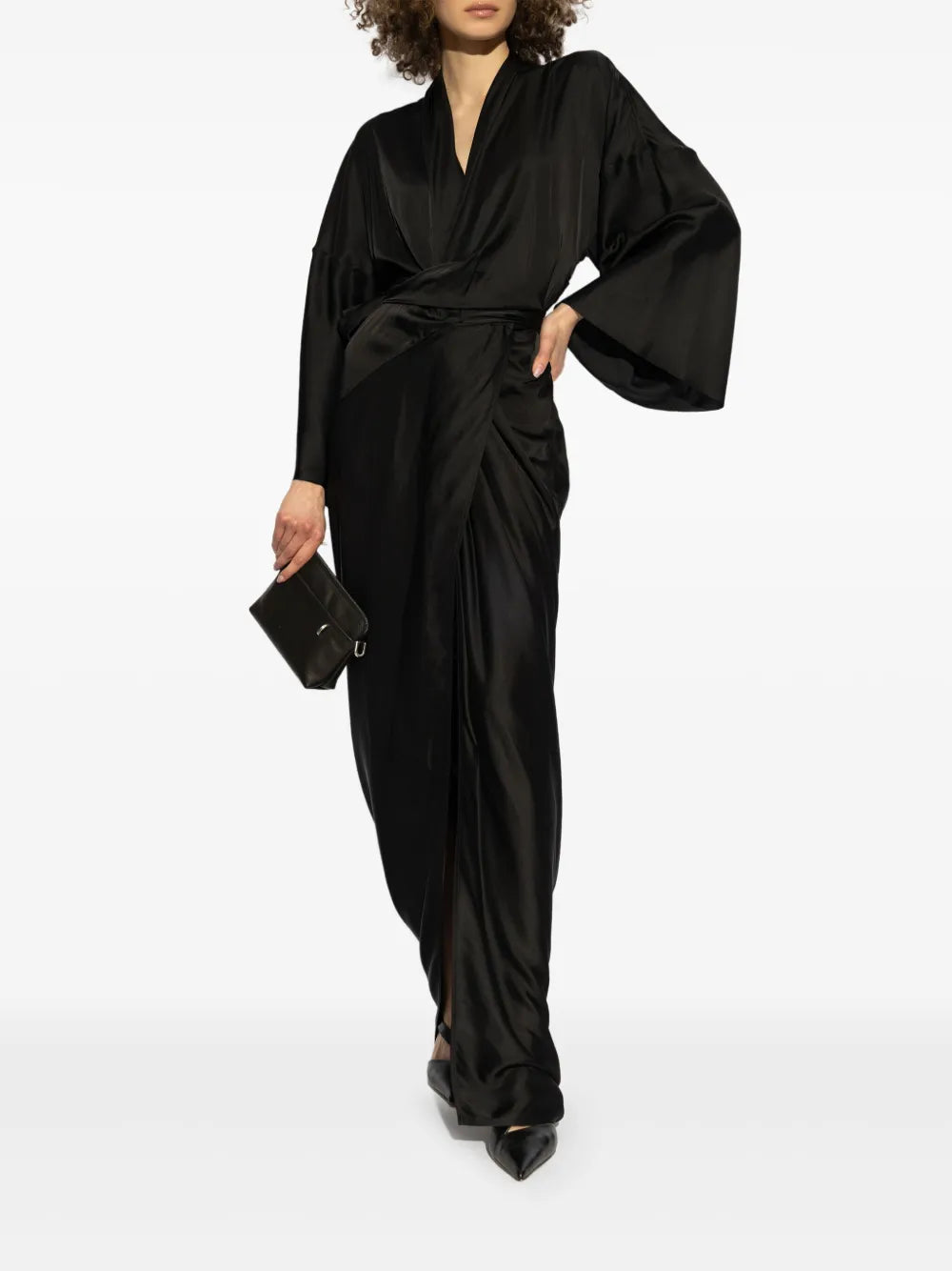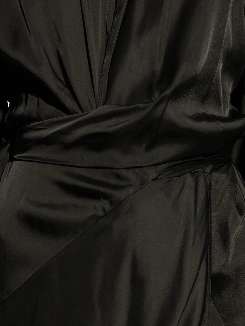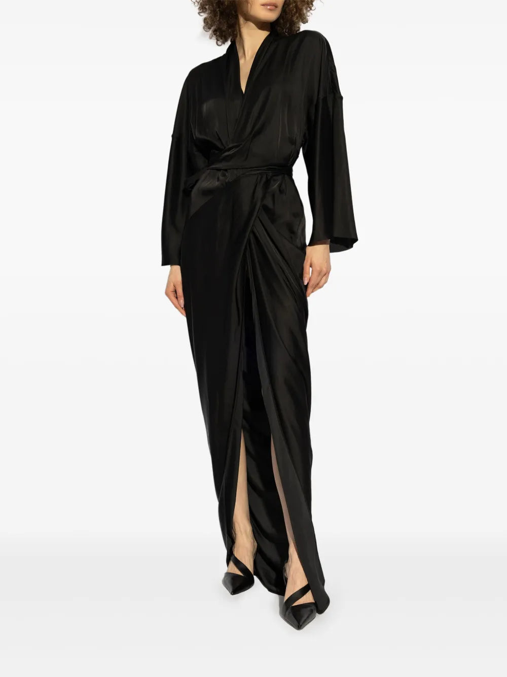 chiusura con laccio laterale nero, design drappeggiato con spacco frontale, dettagli raccolti
