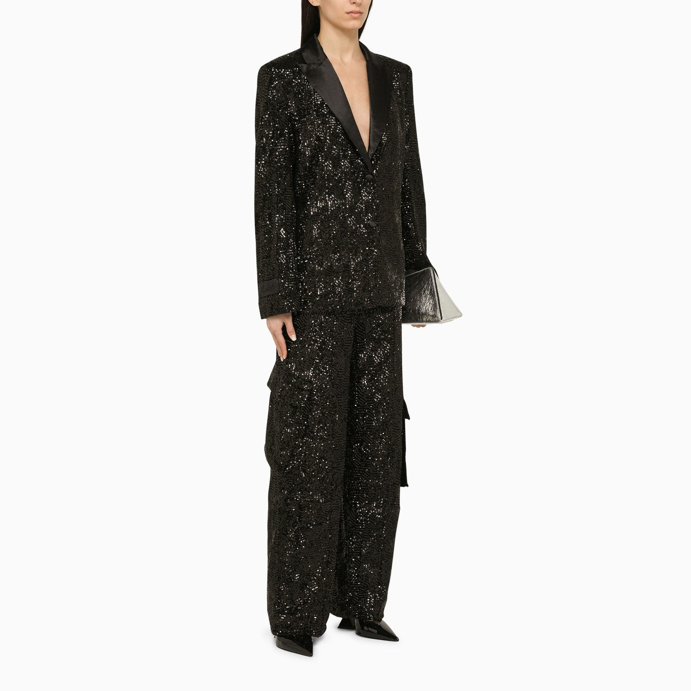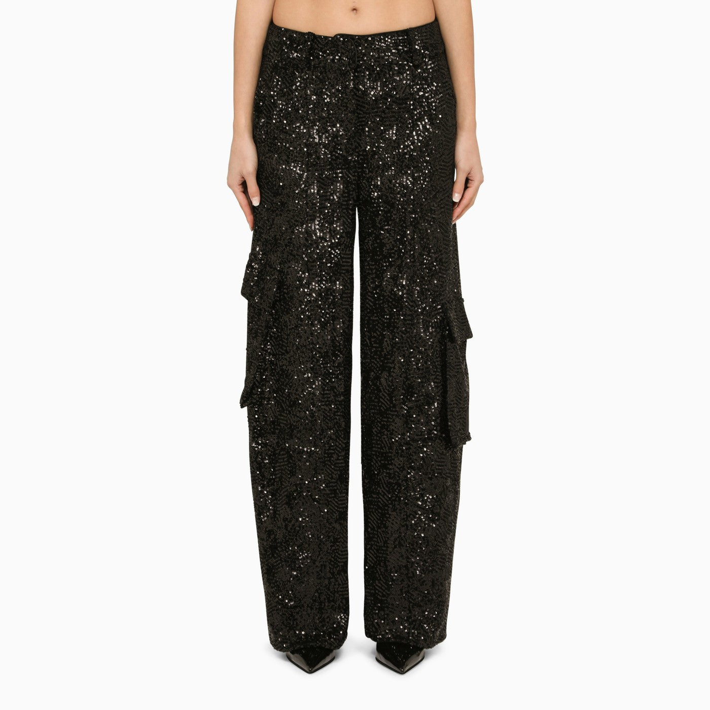 Black sequined cargo trousers from Rotate featuring several pockets on the front and back and a loose fit.