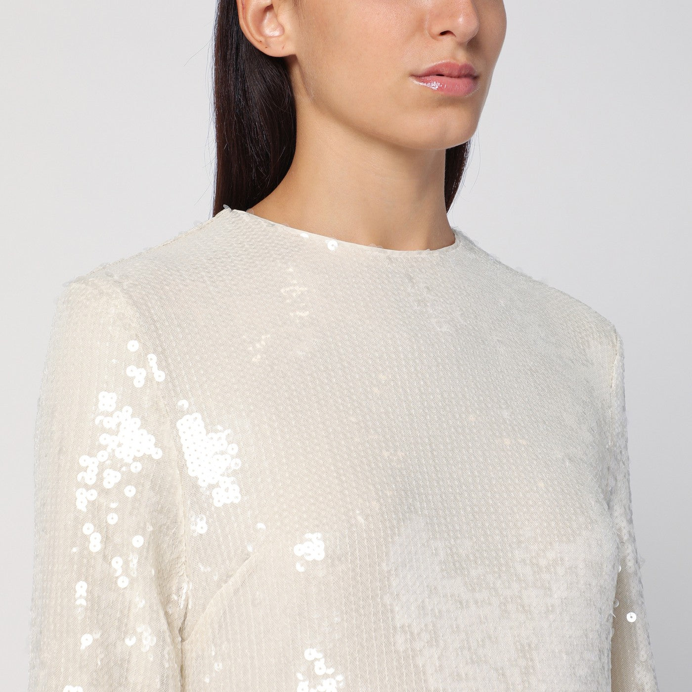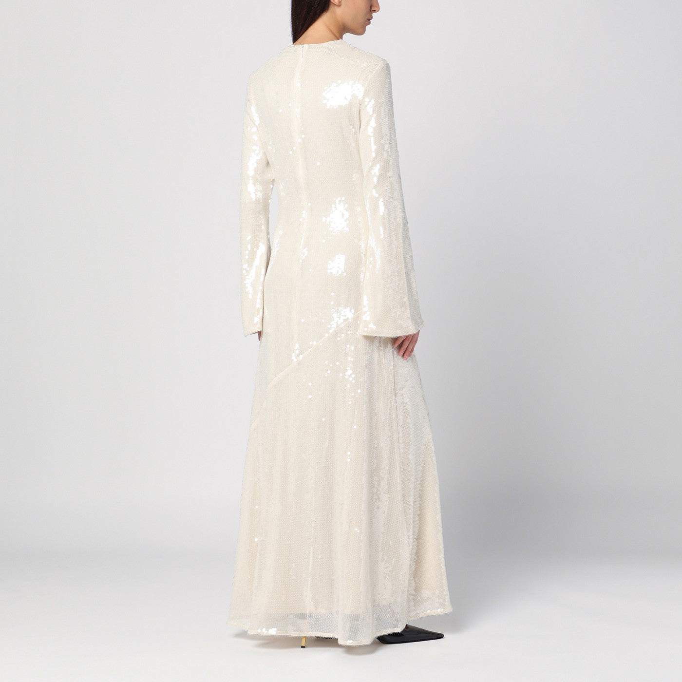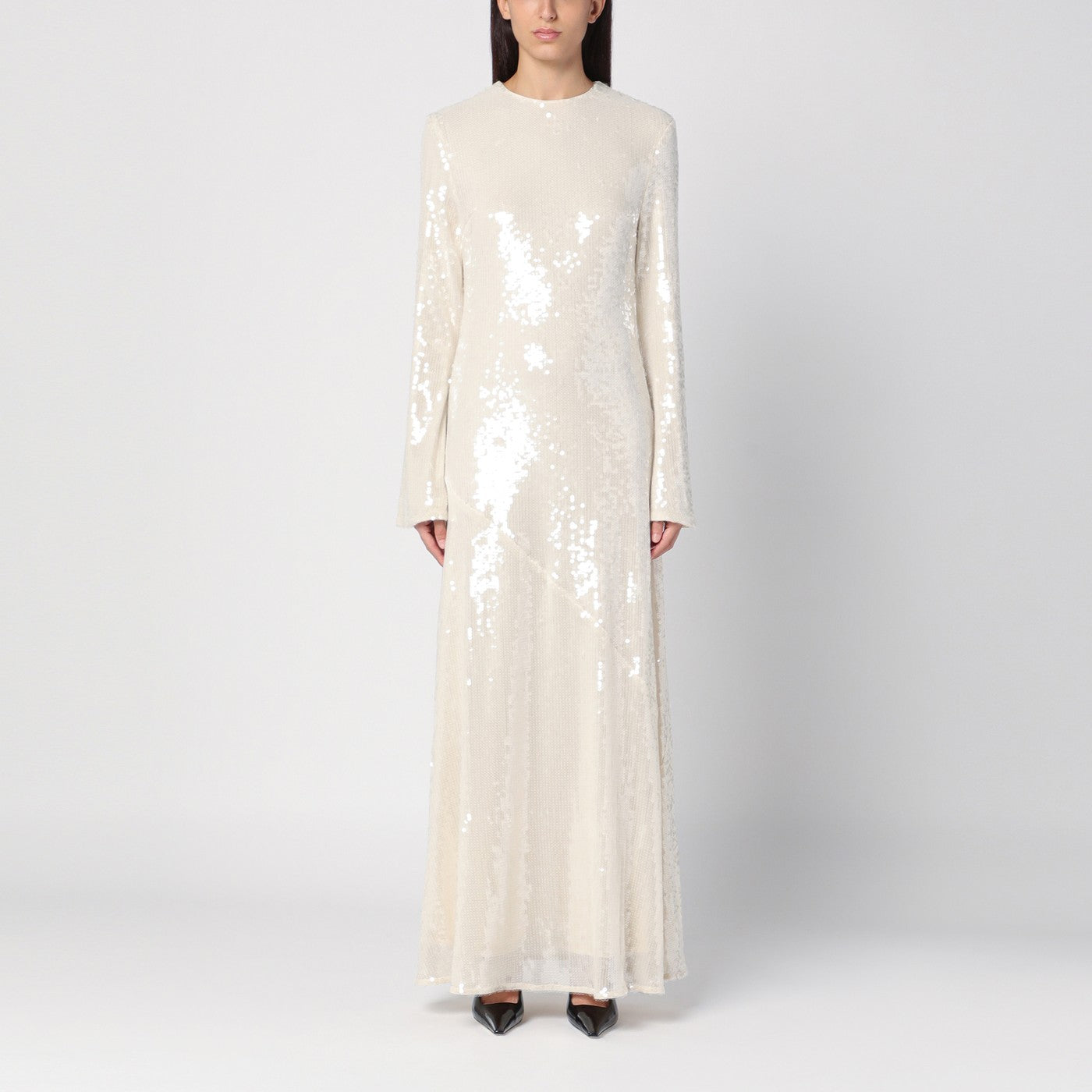 Ivory all over sequin long crewneck dress by Rotate, features a back zip fastening, long sleeves and a loose, flowing fit.