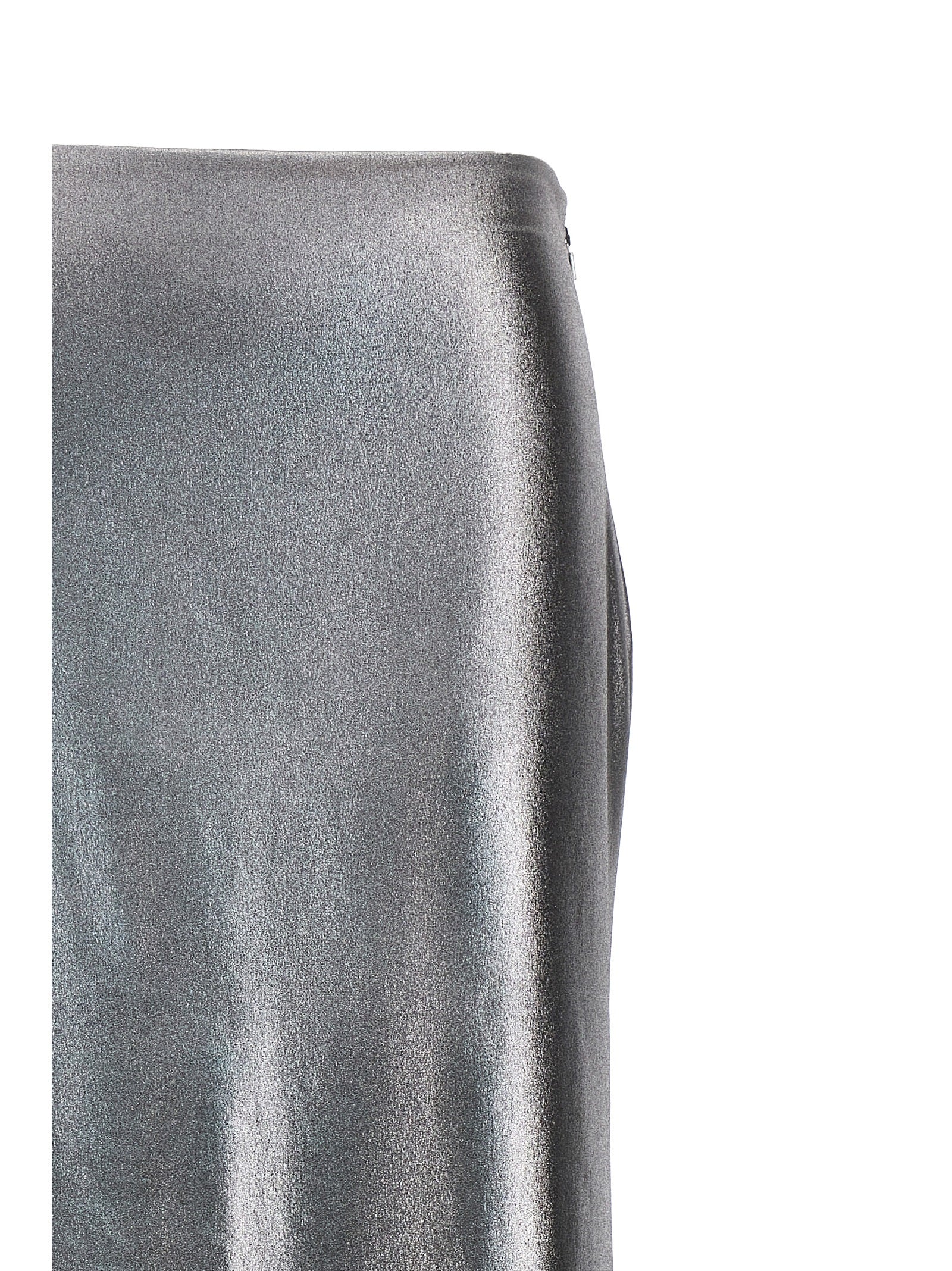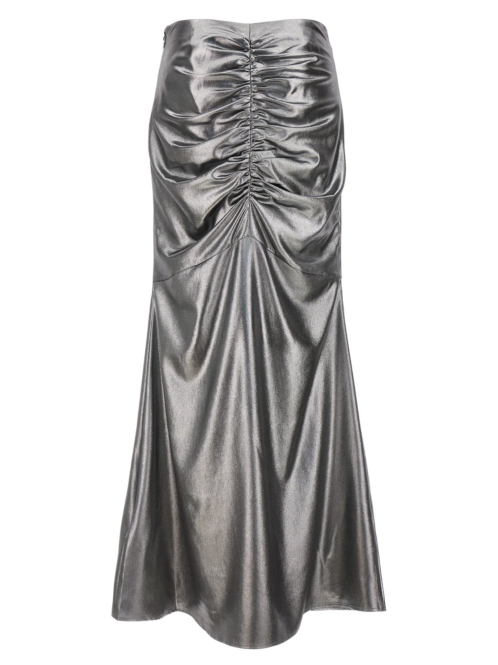 Long skirt in metallic fabric, A-shape with draping at the back, invisible zip closure.