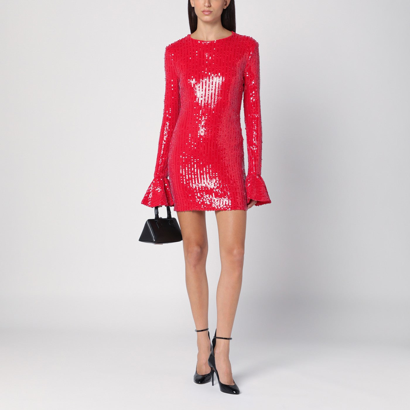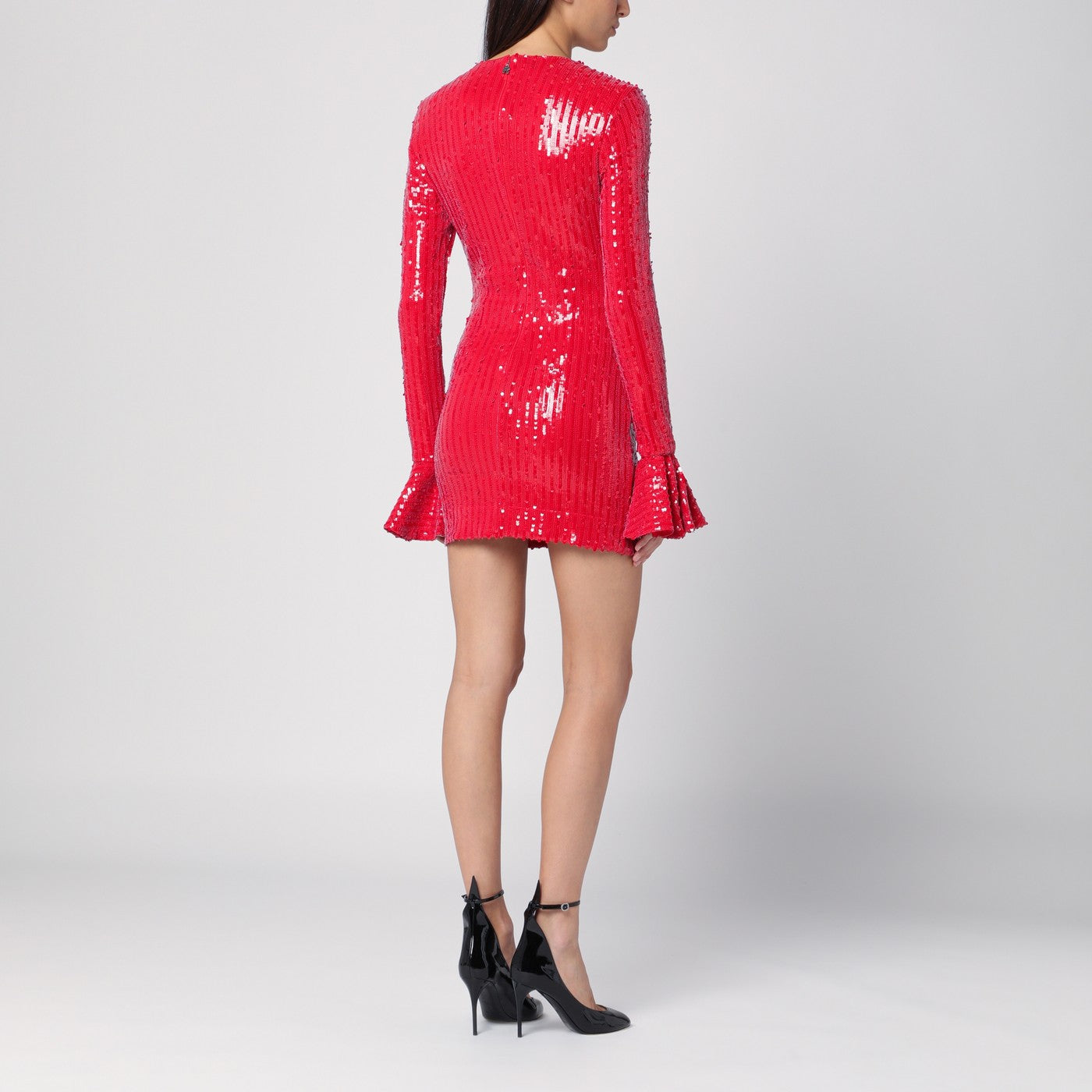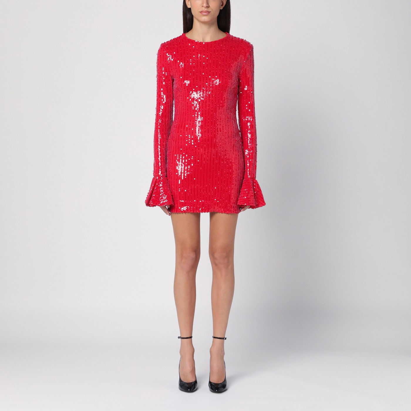 Red recycled polyester crew-neck mini dress by Rotate, featuring all over micro sequins, long sleeves with flounced cuff and back zip fastening.