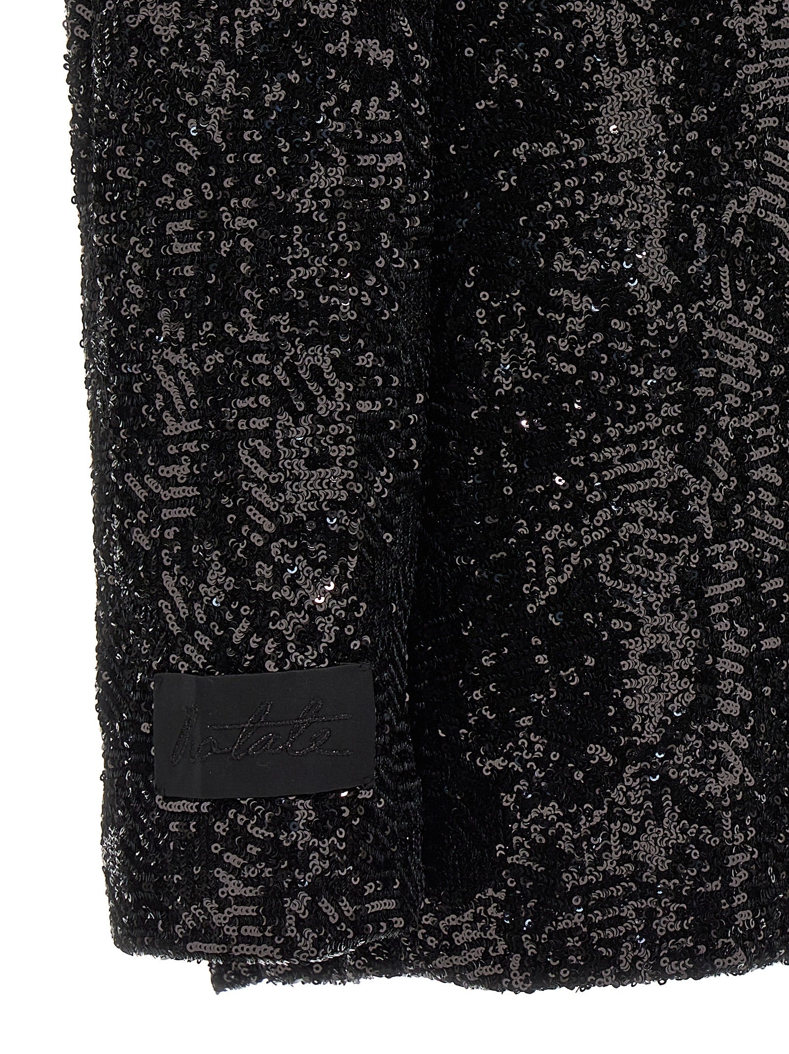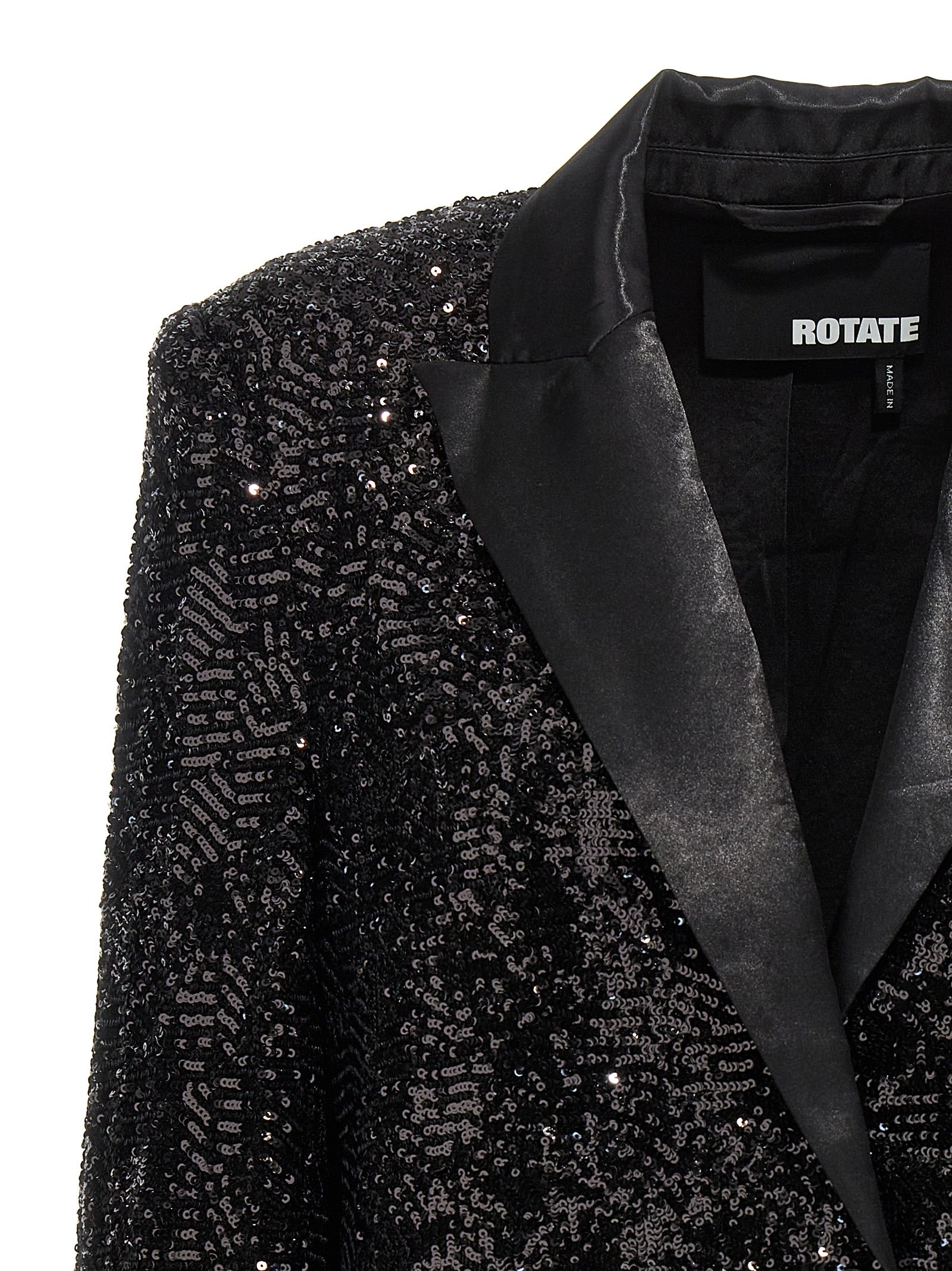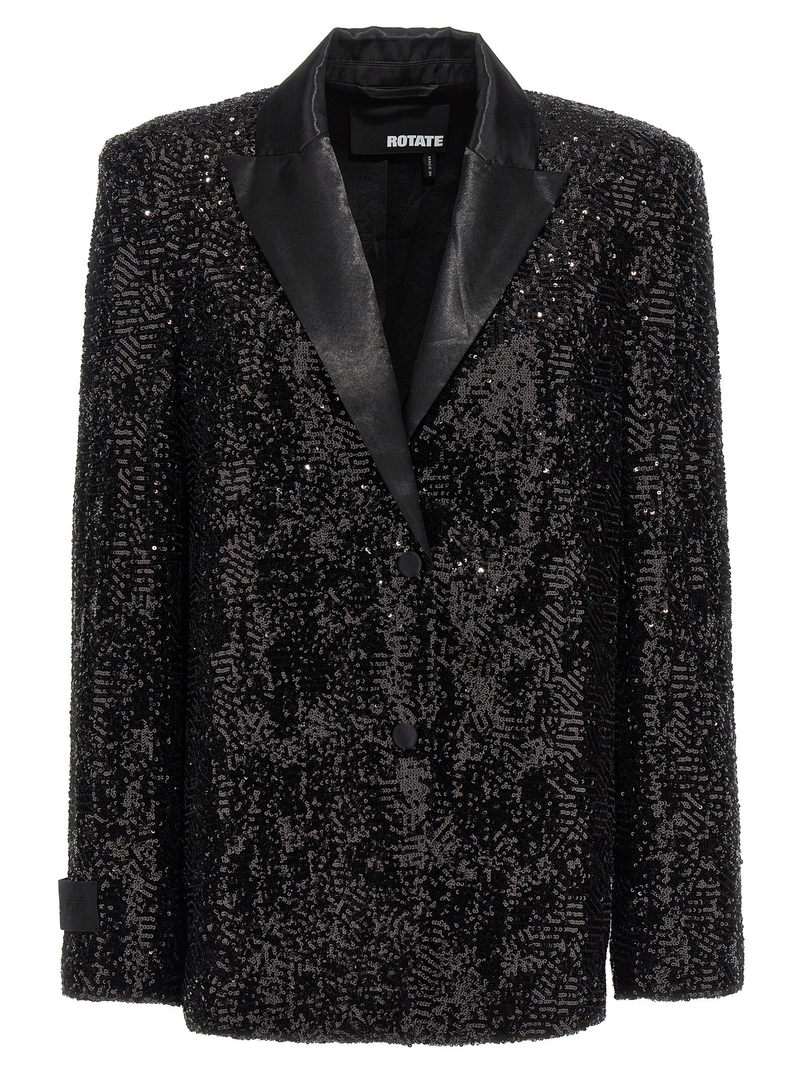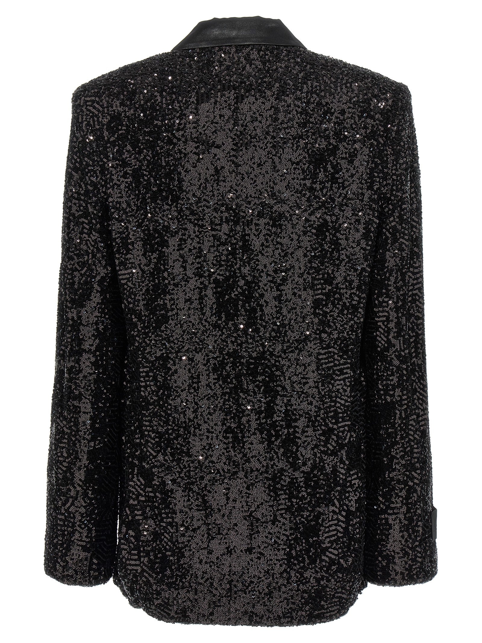Single-breasted blazer with all-over sequin appliqué, button closure, satin lapels, long sleeves, back vents.
