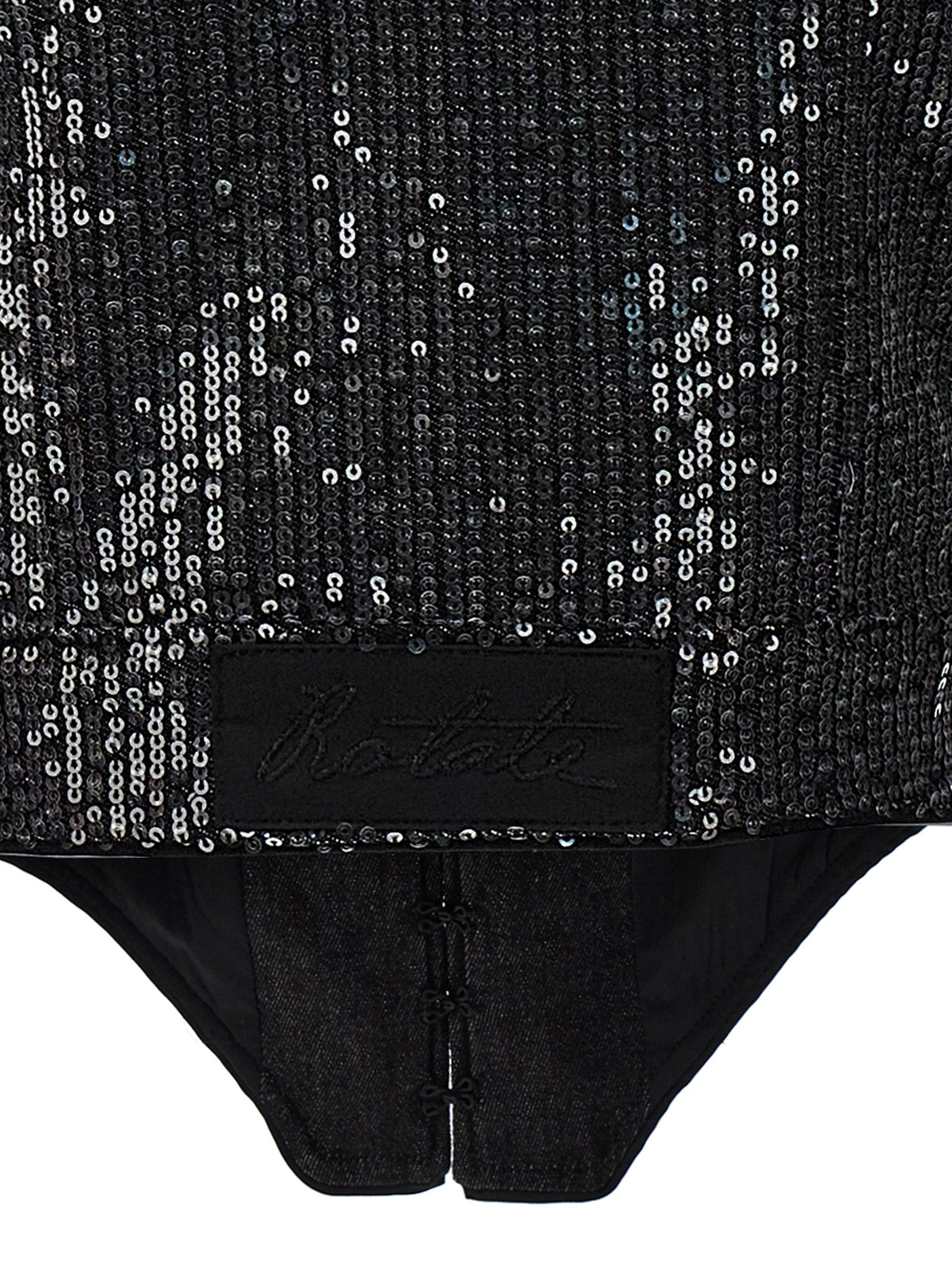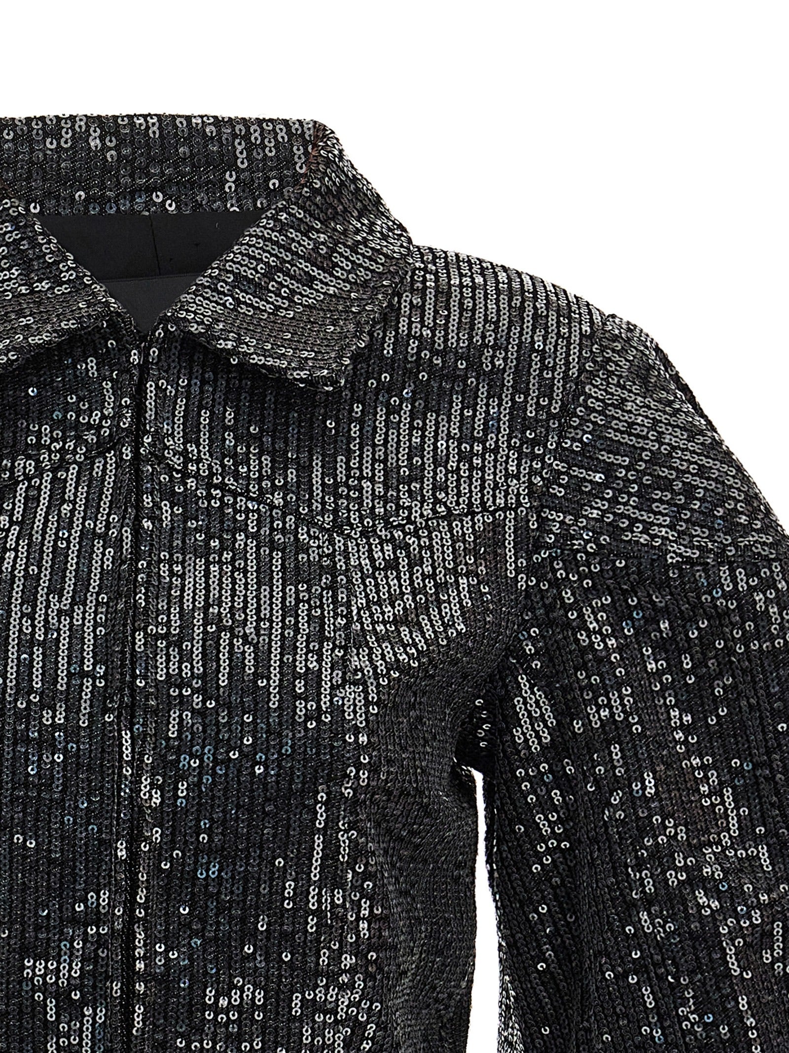 Cropped jacket in cotton denim with all-over sequin appliqué, hook closure, and long balloon sleeves with cuffs.