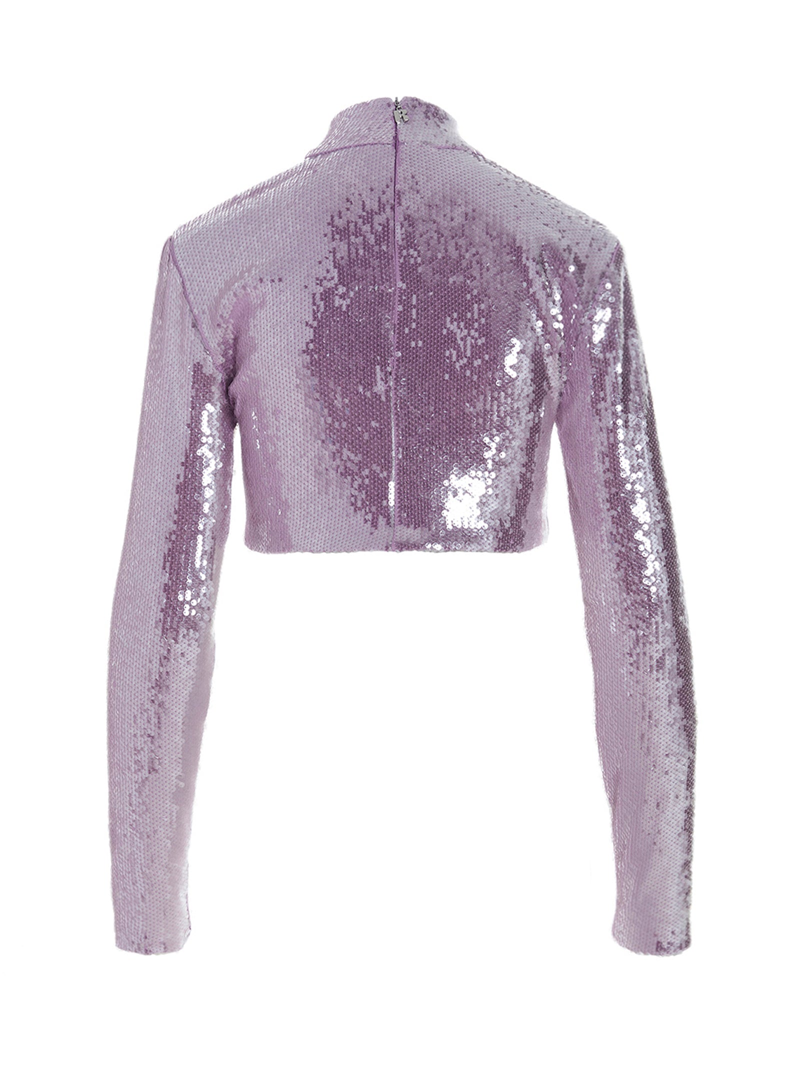 Cropped top with an all-over sequin application, a back zipper closure, a high collar, and long sleeves. JULIAN SUSTAINABLE: Made in recycled polyester.