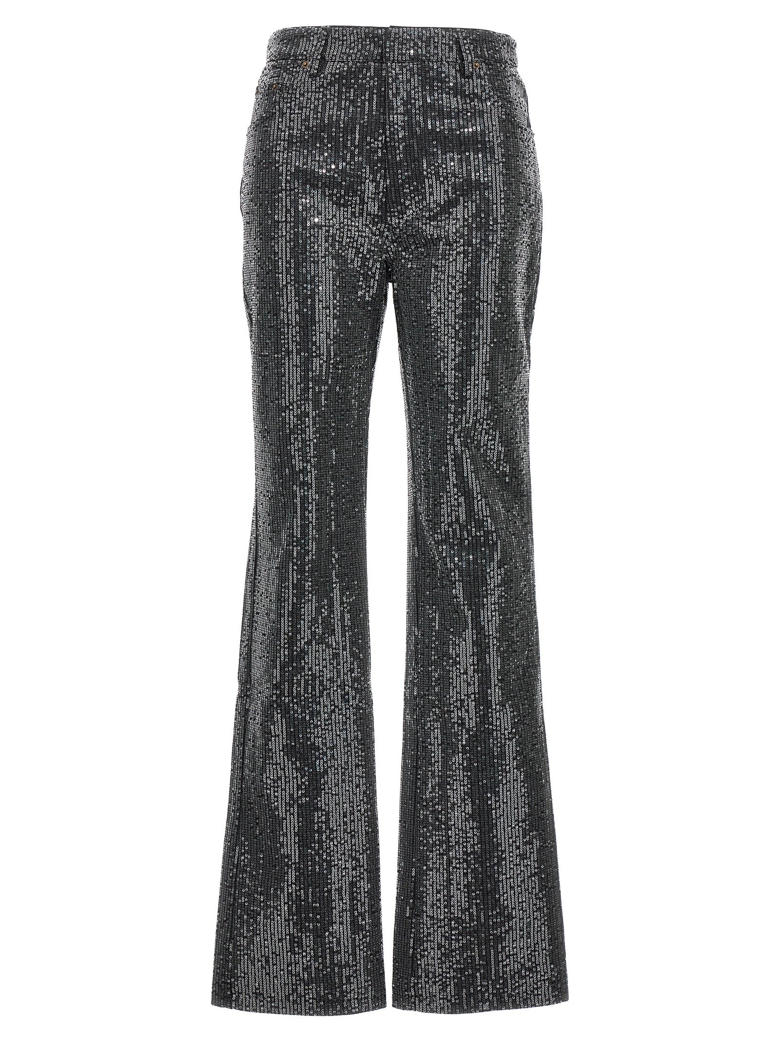 Cotton denim jeans with all-over sequin appliqué, hook and button zip closure, five pockets, and back logo embroidery.
