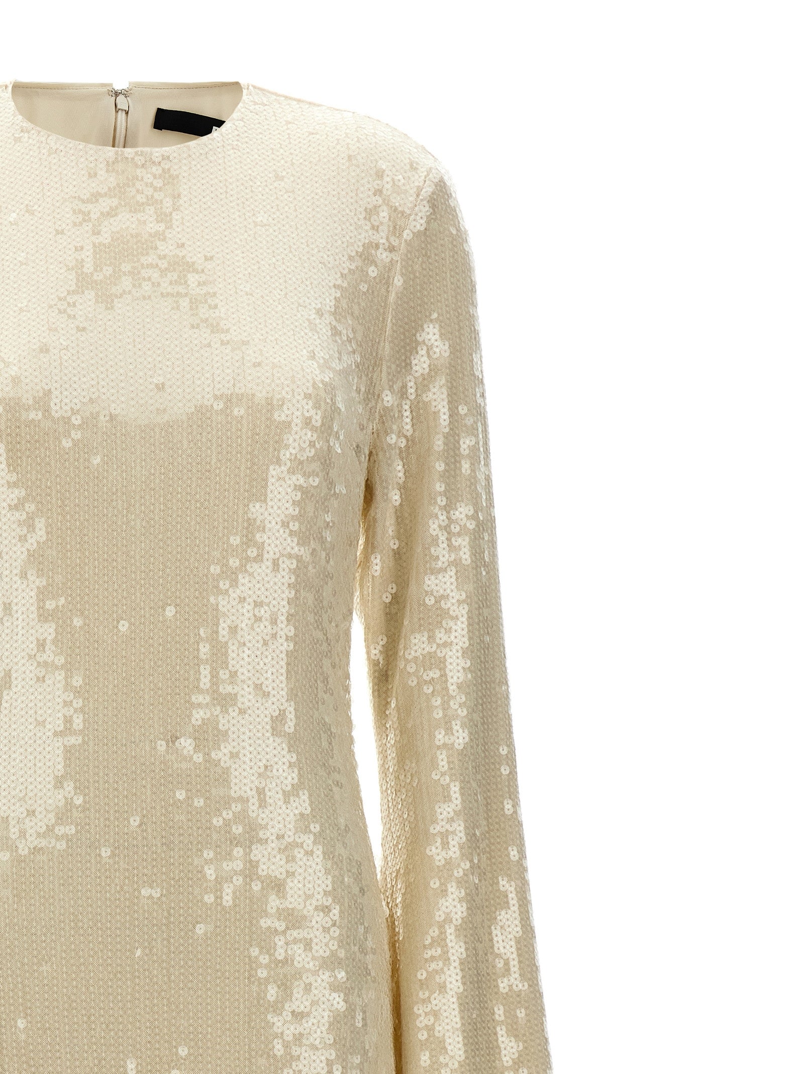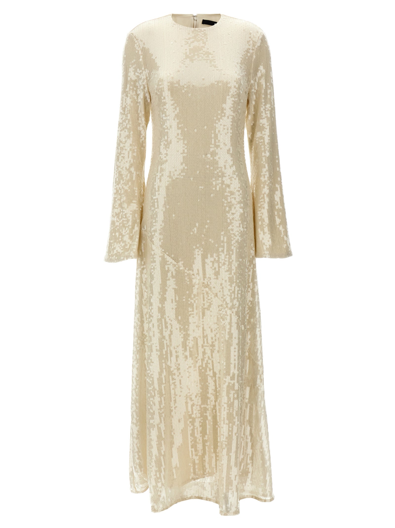 'Sequin Maxi' dress with all-over sequins, crew neck, long flared sleeves, back zip closure.