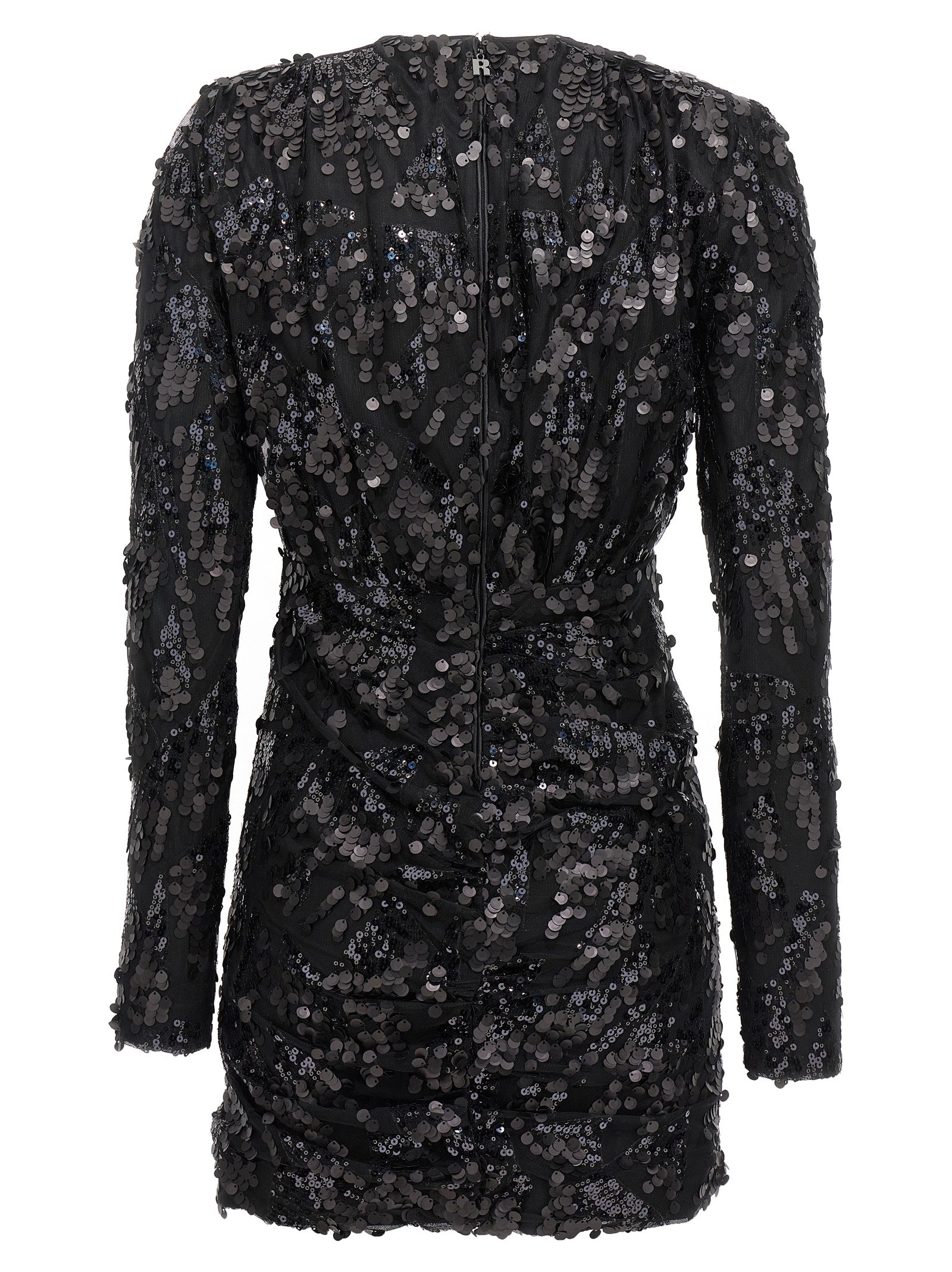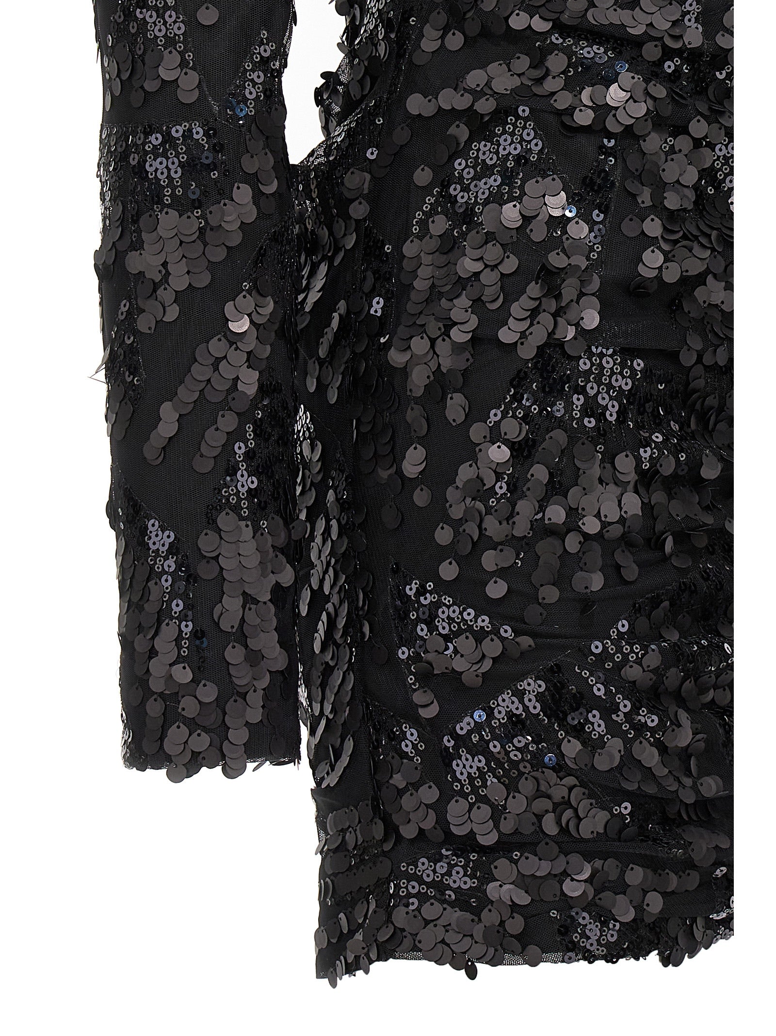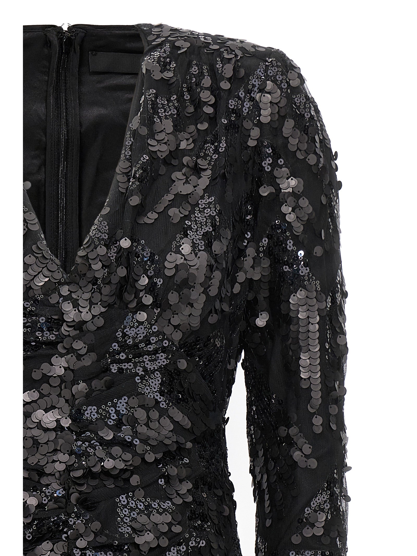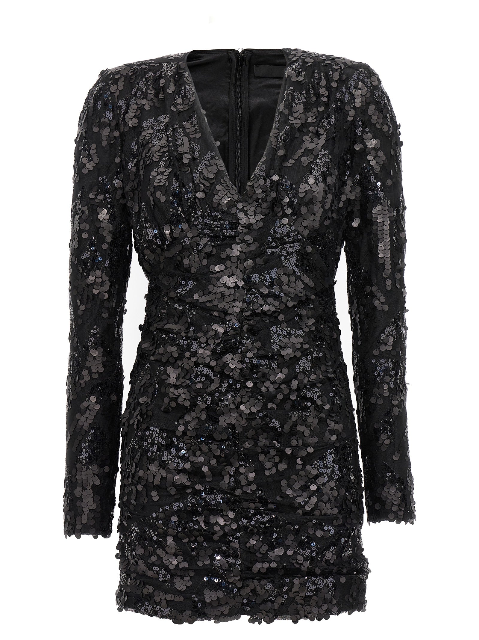 Draped sequin mini dress with deep V-neck, long sleeves with padded shoulders, and invisible zip closure.