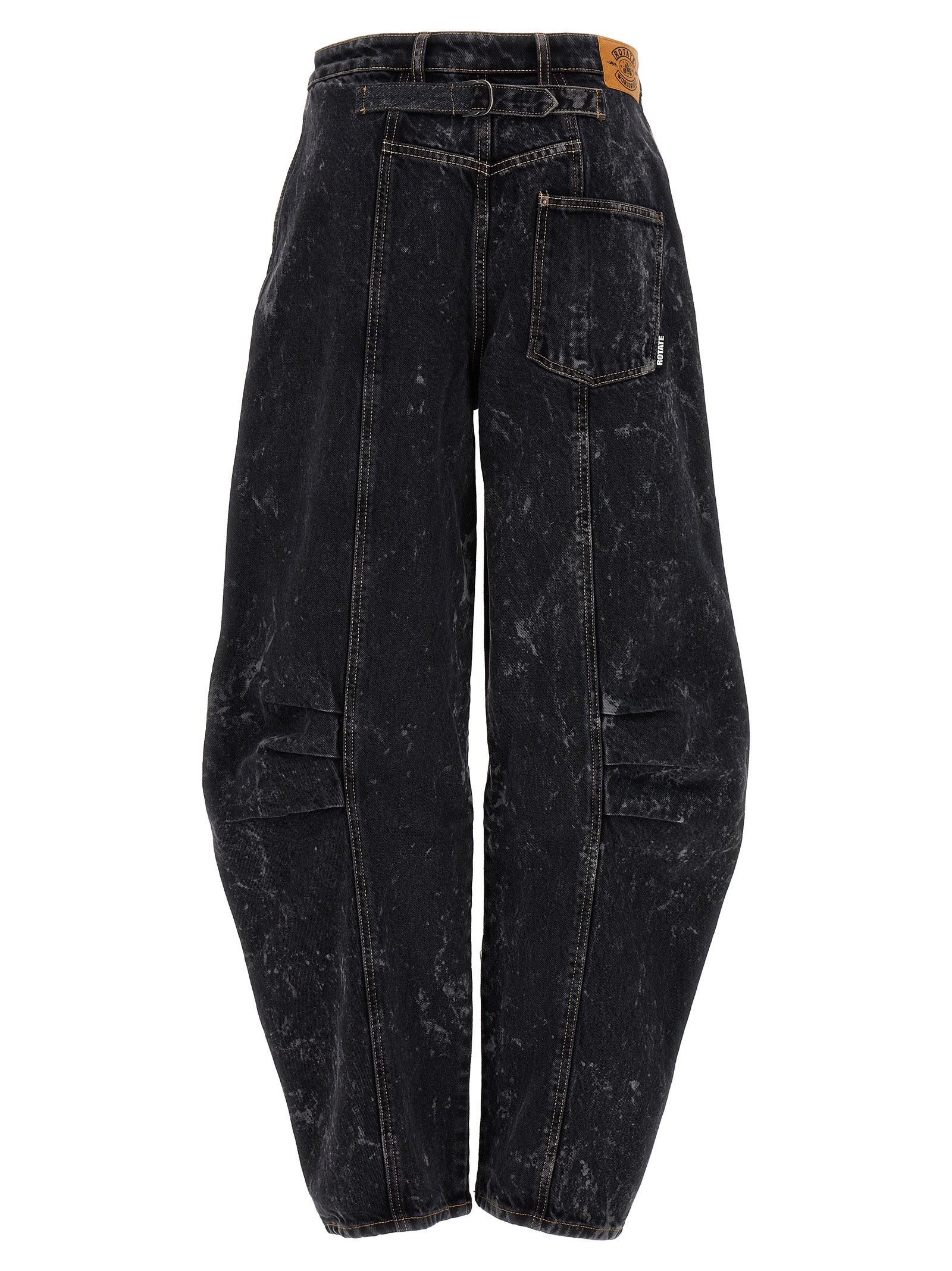 'Washed Twill Wide' cotton denim jeans with zip and button closure, pockets, adjustable back strap, carrot fit leg.